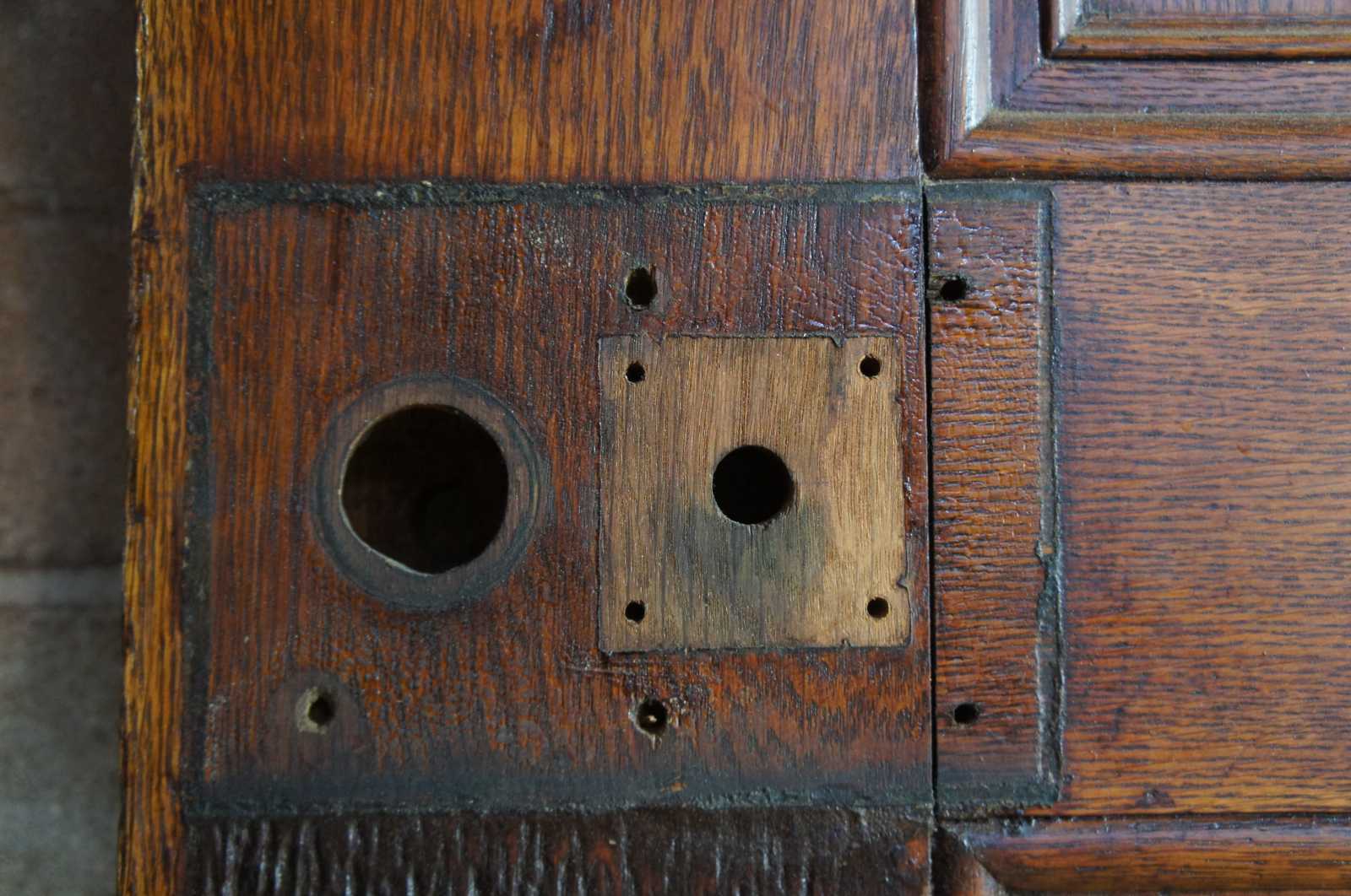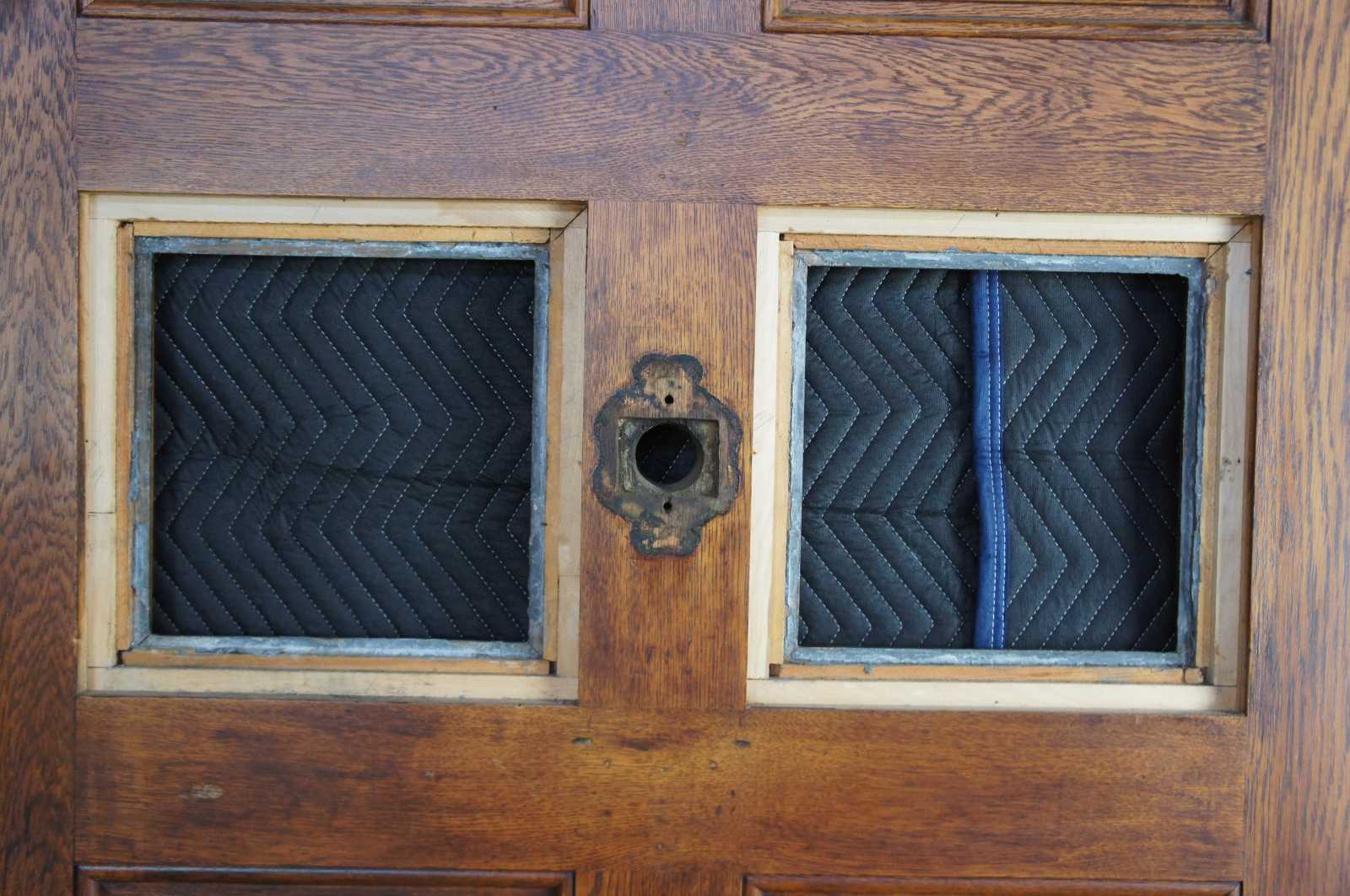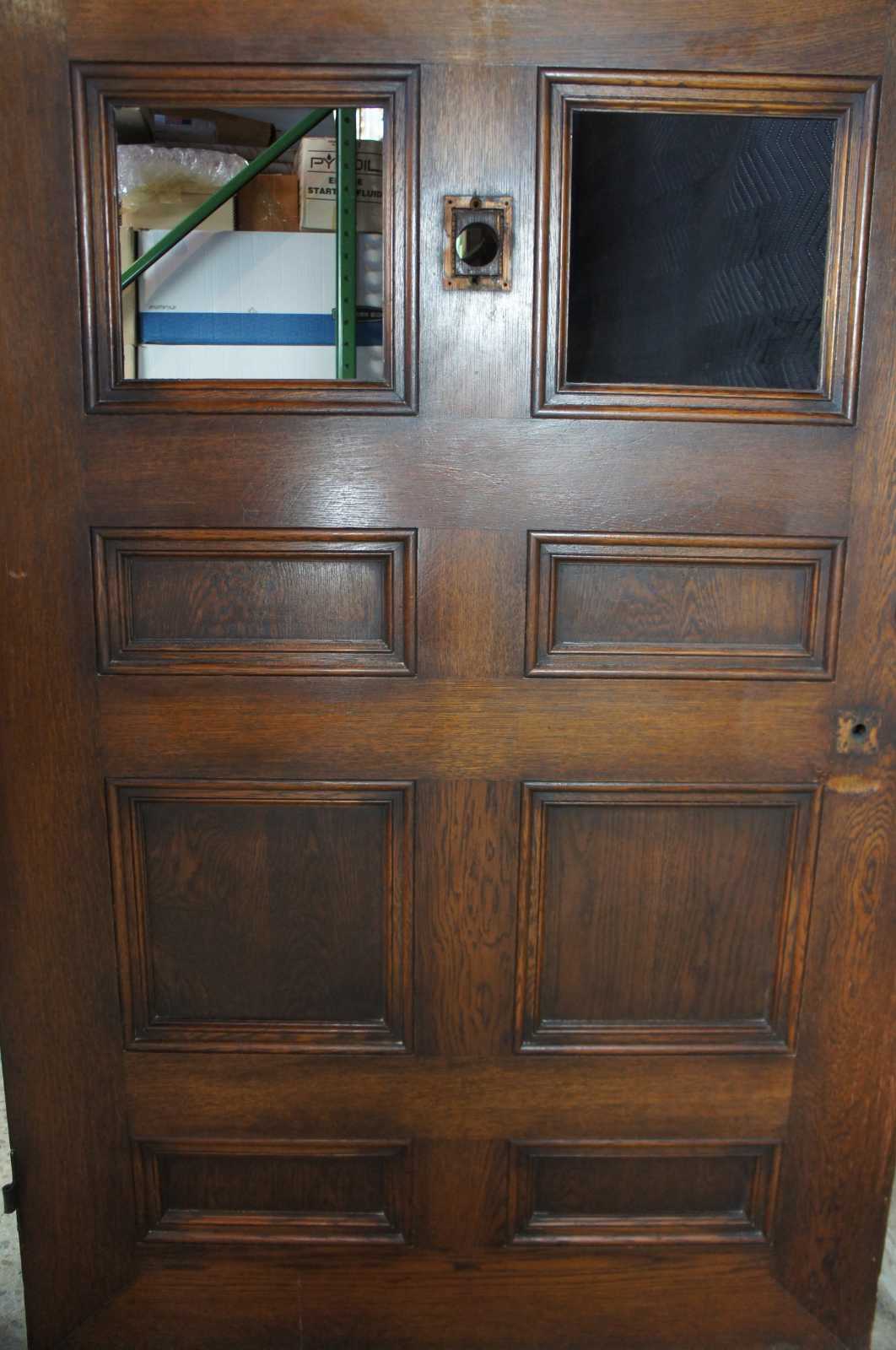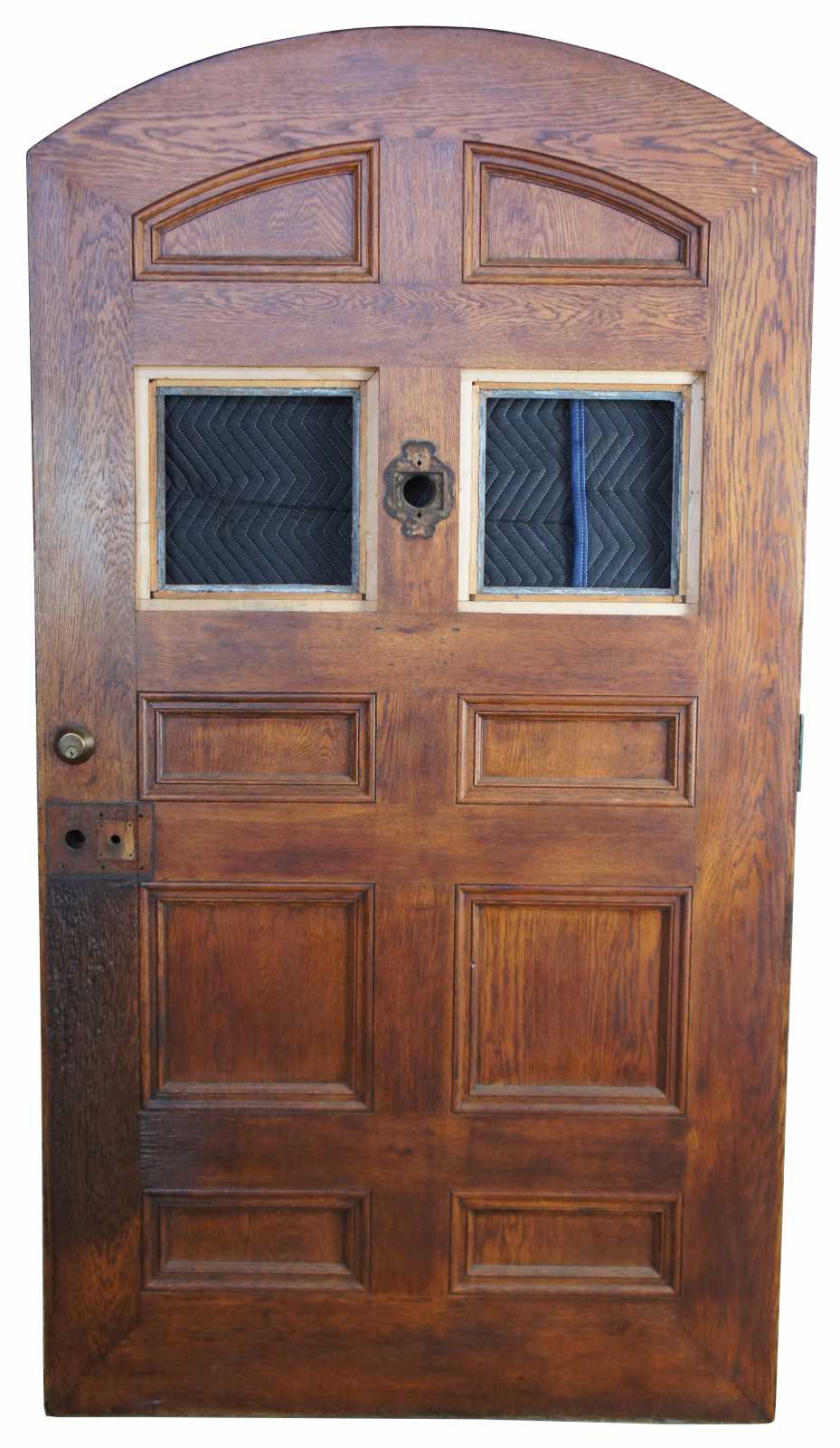 This massive arched solid oak door comes from one of the first homes built in Oakwood, Ohio by Harry I Schenck. It is the original front door, circa early 1900s. Features eight panels and two square inserts for leaded, stained or art glass. A nice statement for any estate. Very heavy.