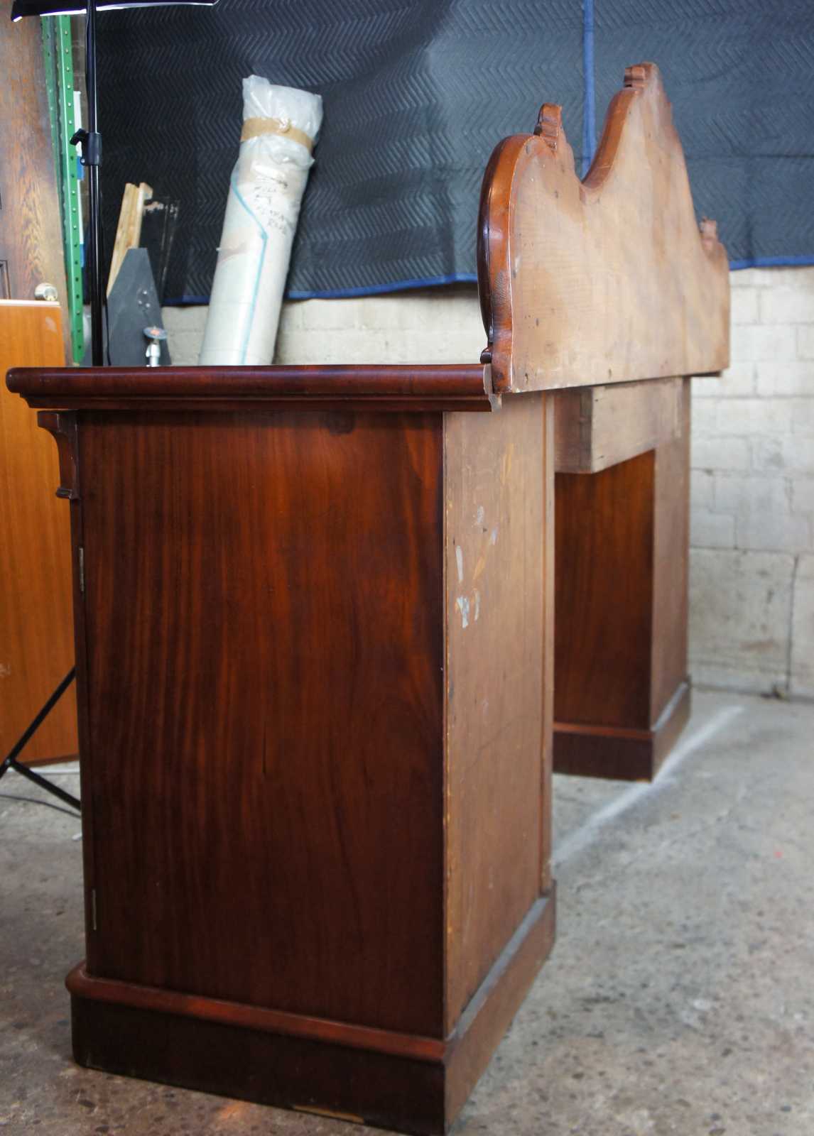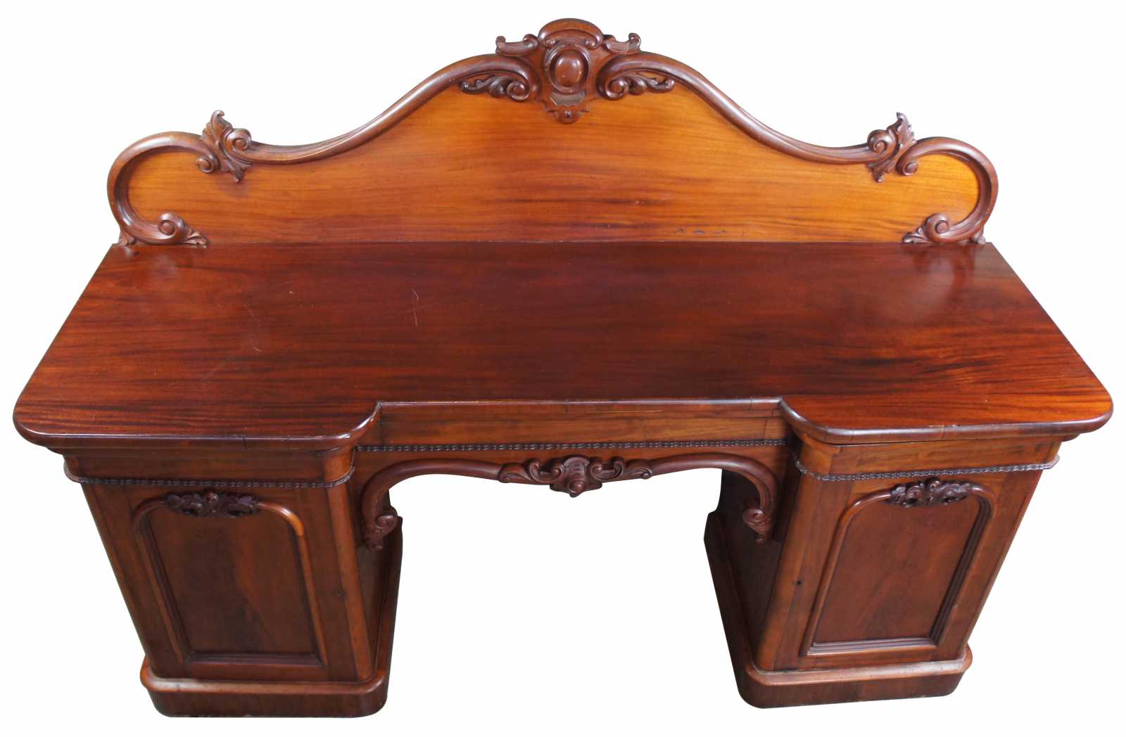 Circa 1820s solid mahogany monumental English sideboard or breakfront with flame mahogany veneers. Features a large serpentine carved backsplash and a long central drawer flanked by outer cabinets. Could also be used as a console, buffet, credenza or standing desk.