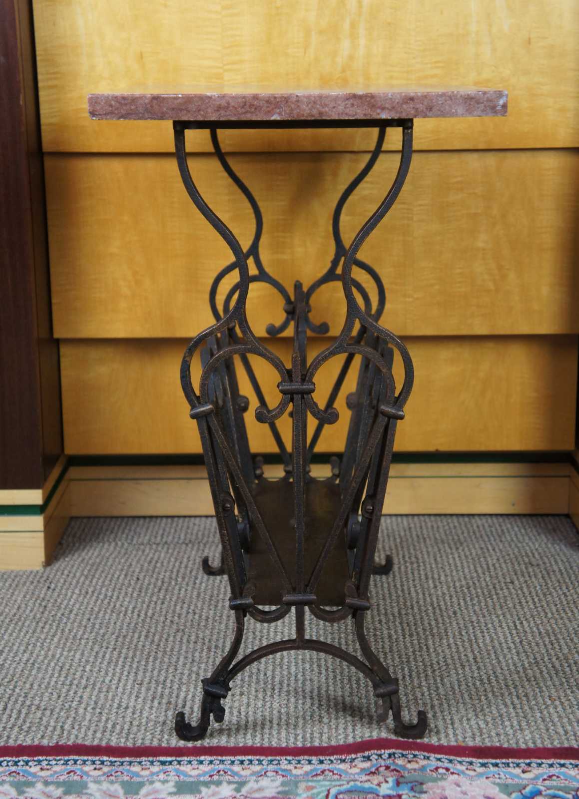 Late Victorian newspaper or magazine rack. Features marble top and cast iron base. Very heavy.