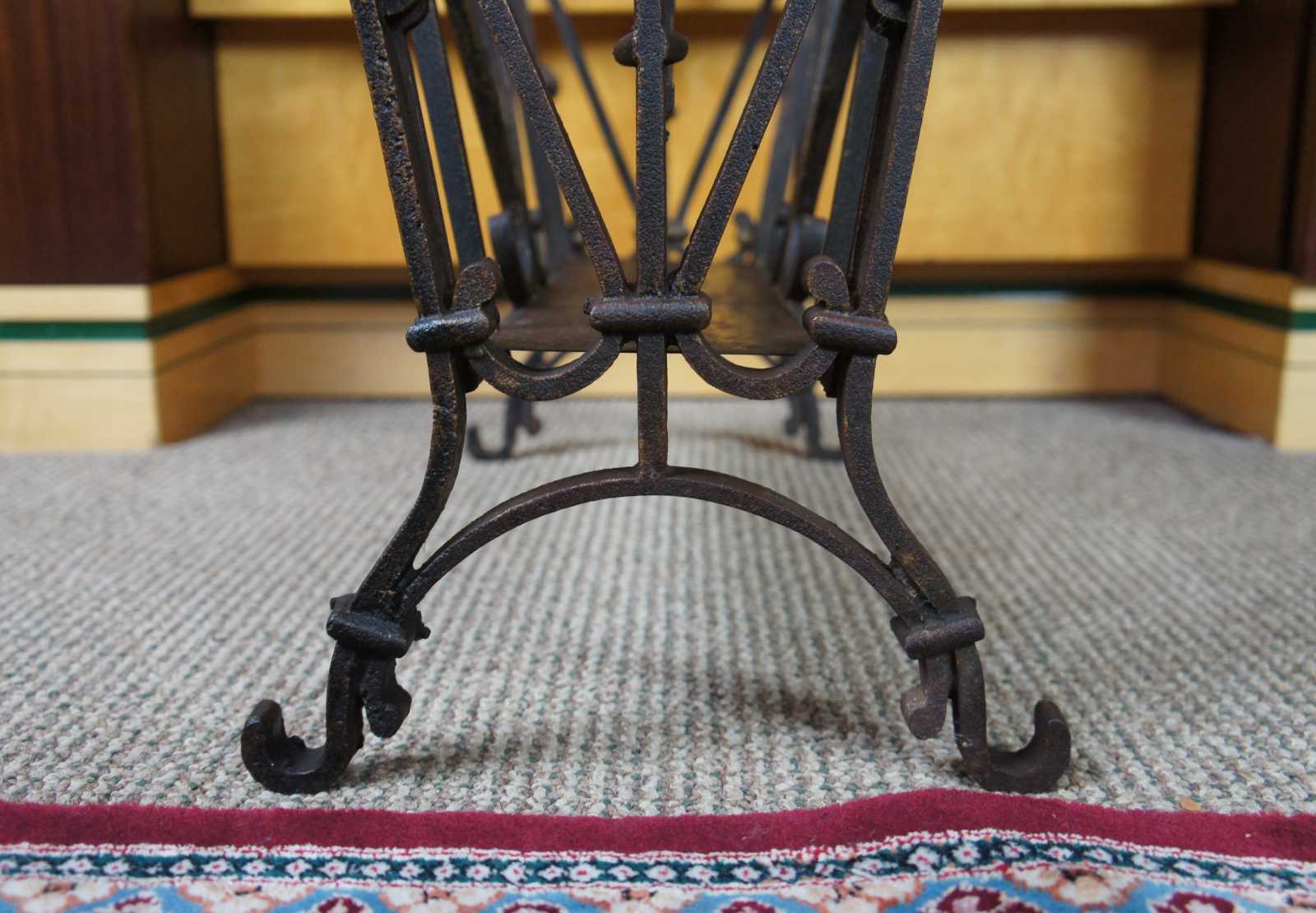 Good overall, the iron center divider is missing one of the stabilizing arms. It can still rest in the center or be modified to sit in the center, but currently it will fall off once leaned against. It is removable and not necessary for anything structural. See pictures.