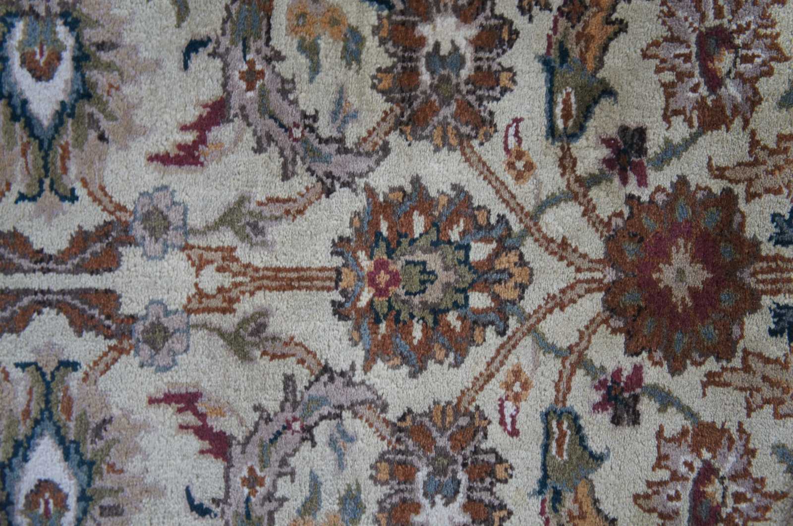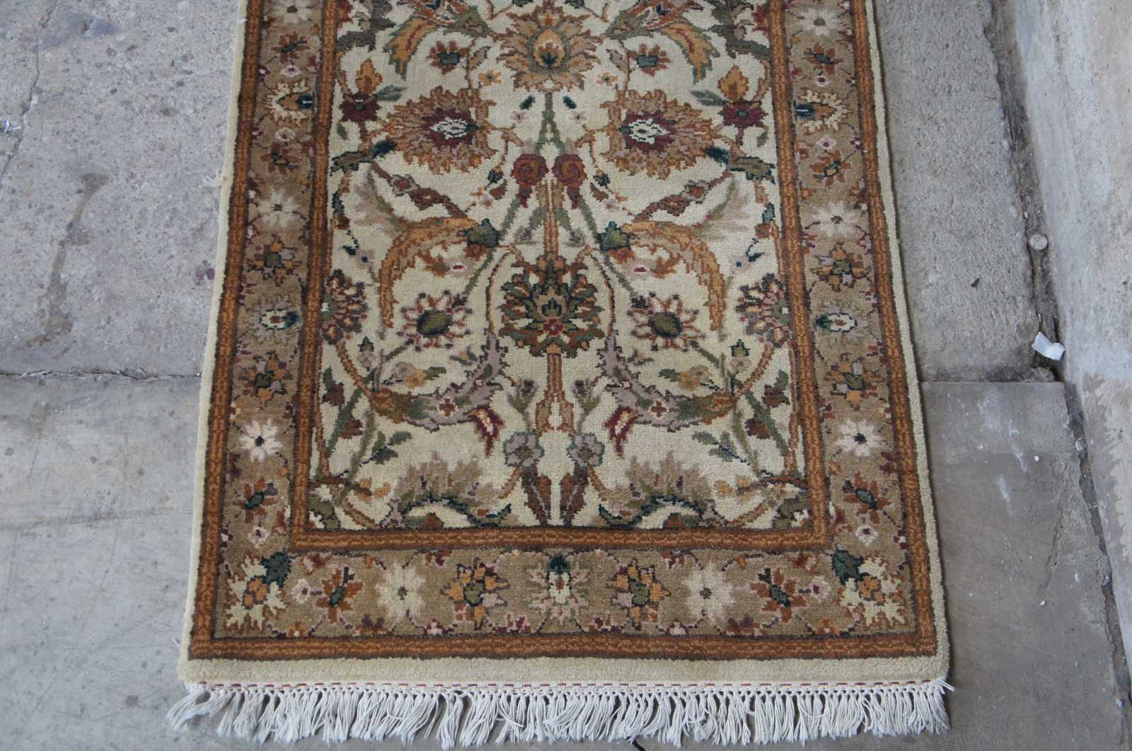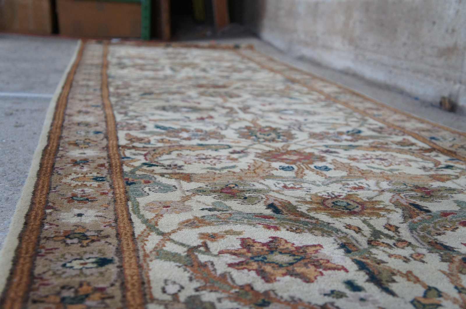 Vintage machine made rug runner featuring floral all over designs with grey, green, brown, blues, tan/beige and green.