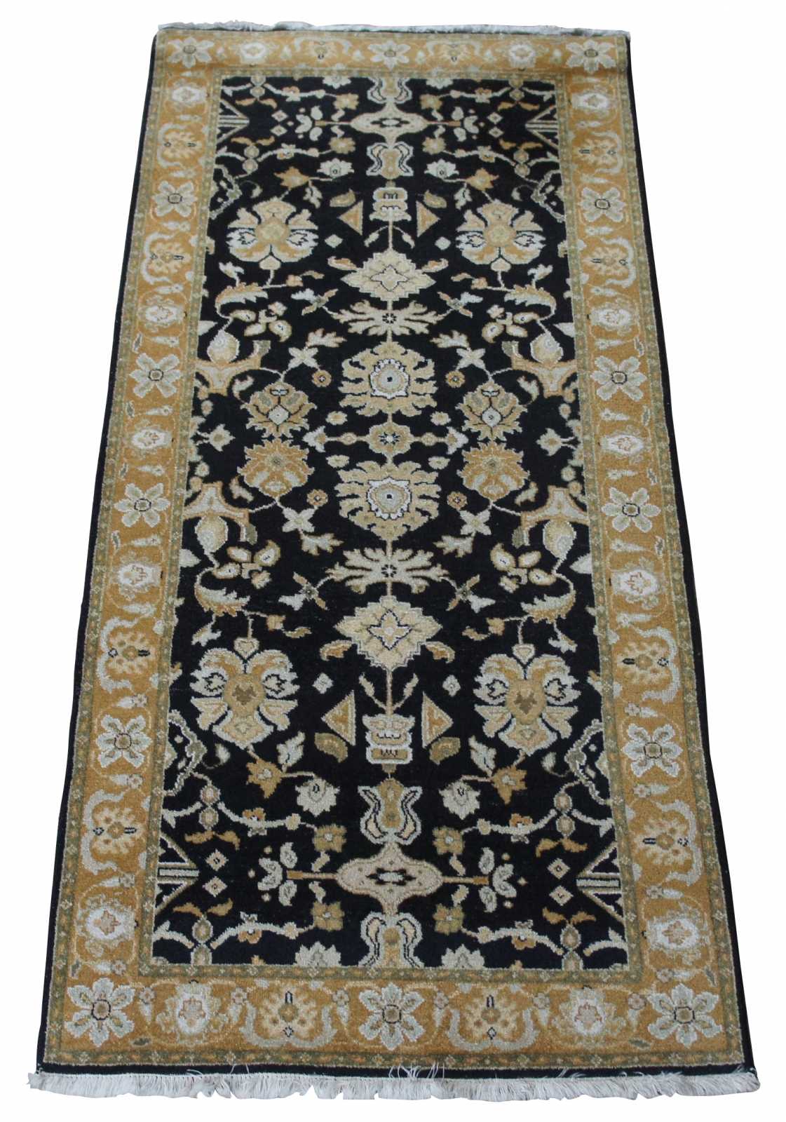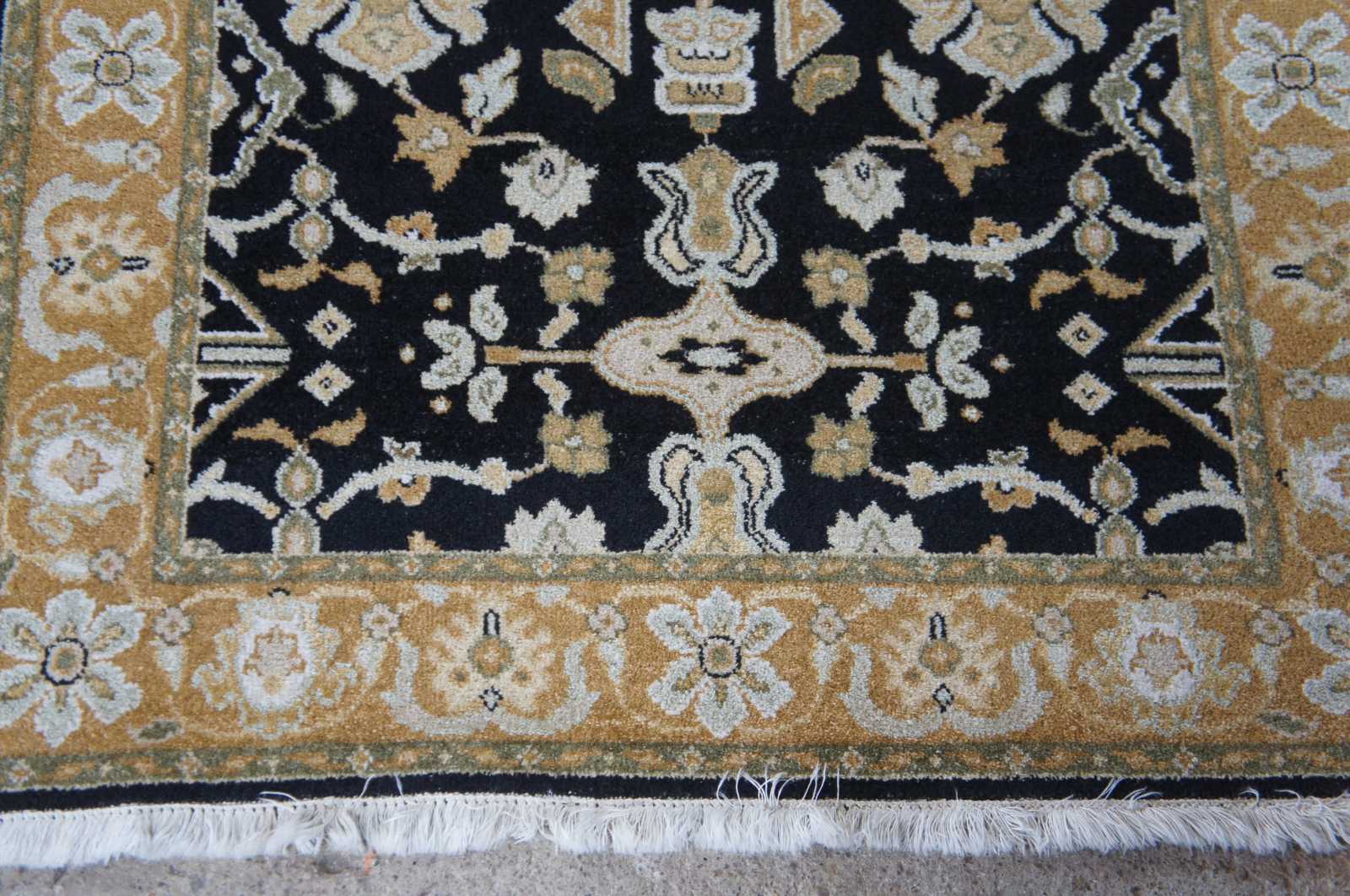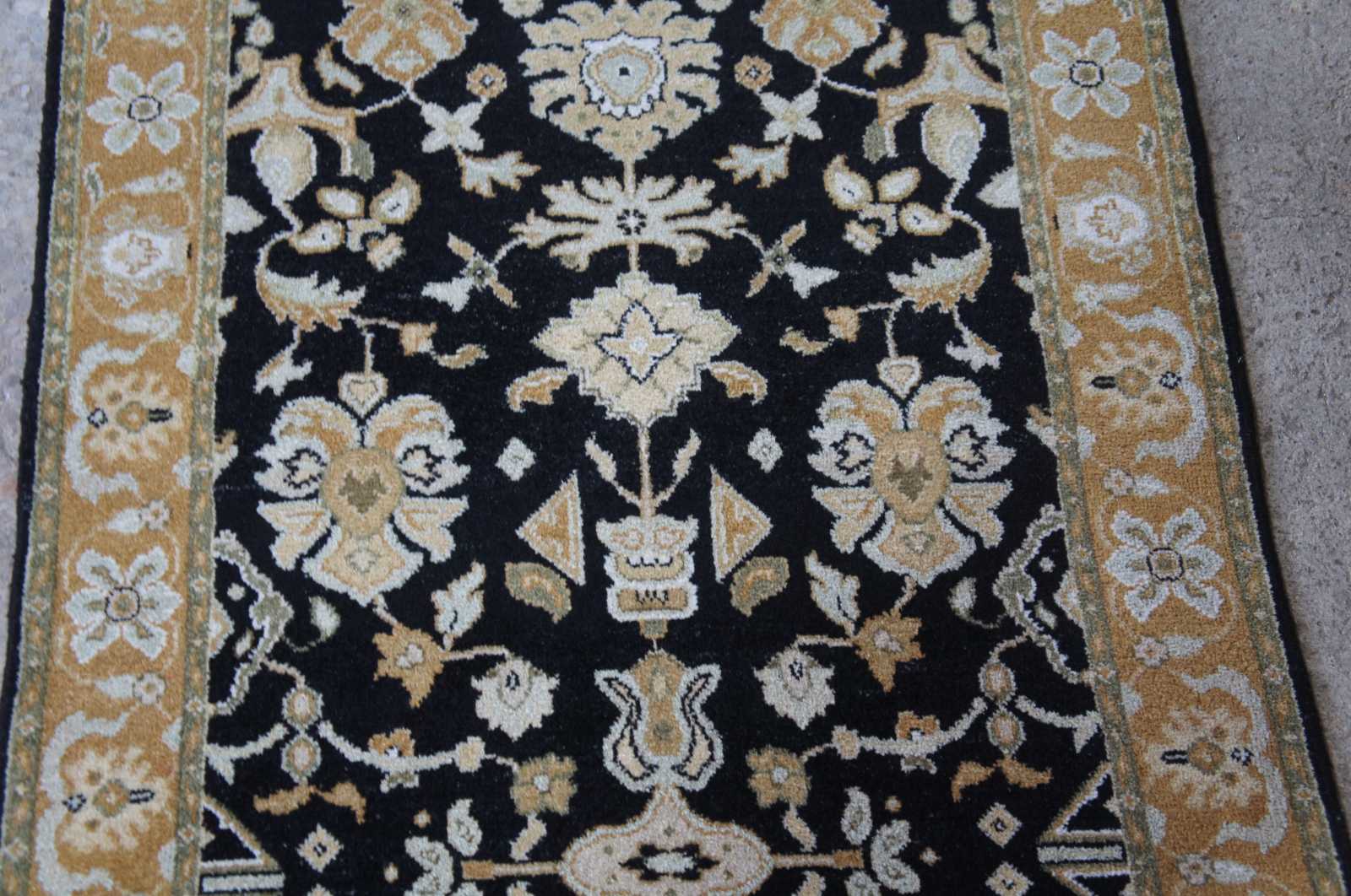 Vintage machine made rug runner featuring floral design with black field and gold / olive / green / tan accents.