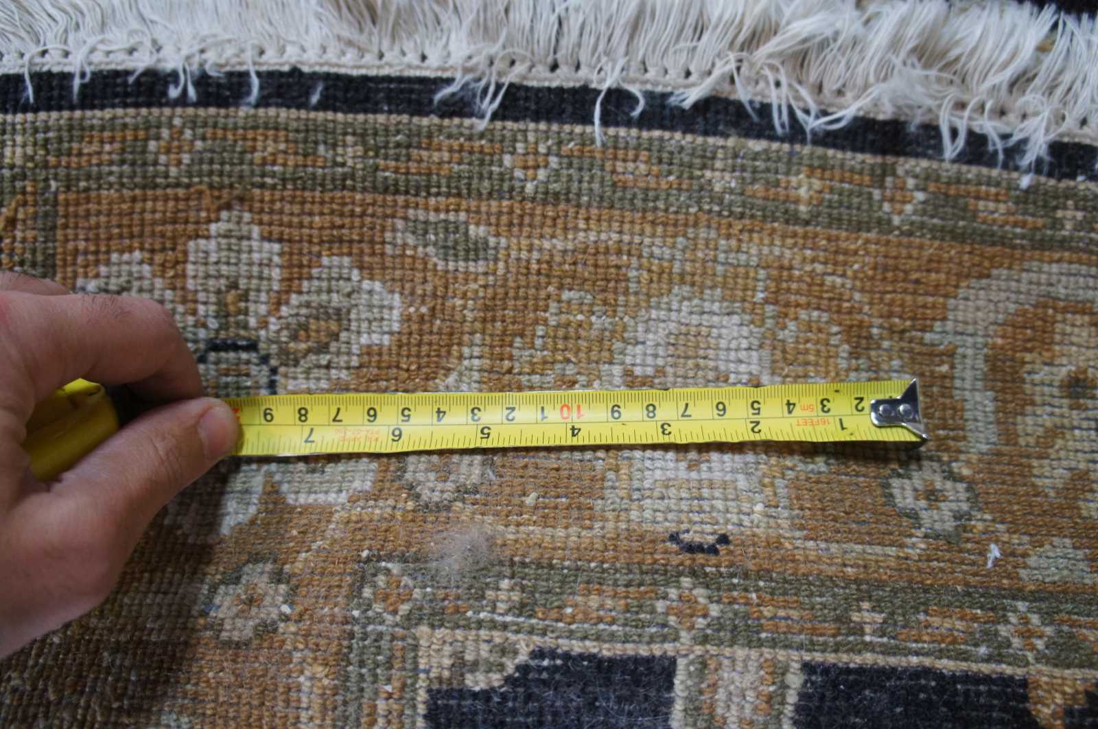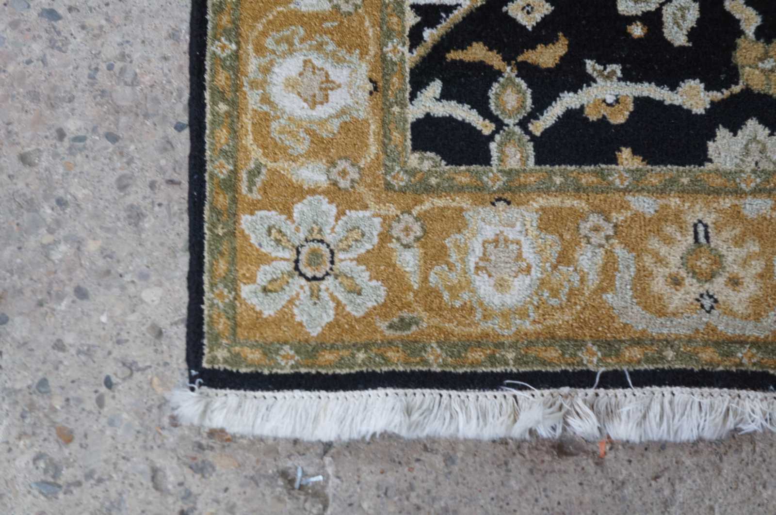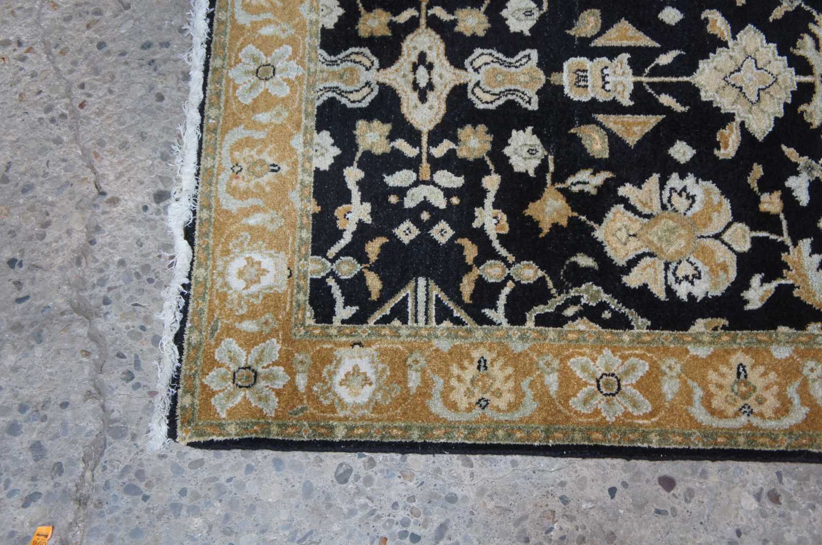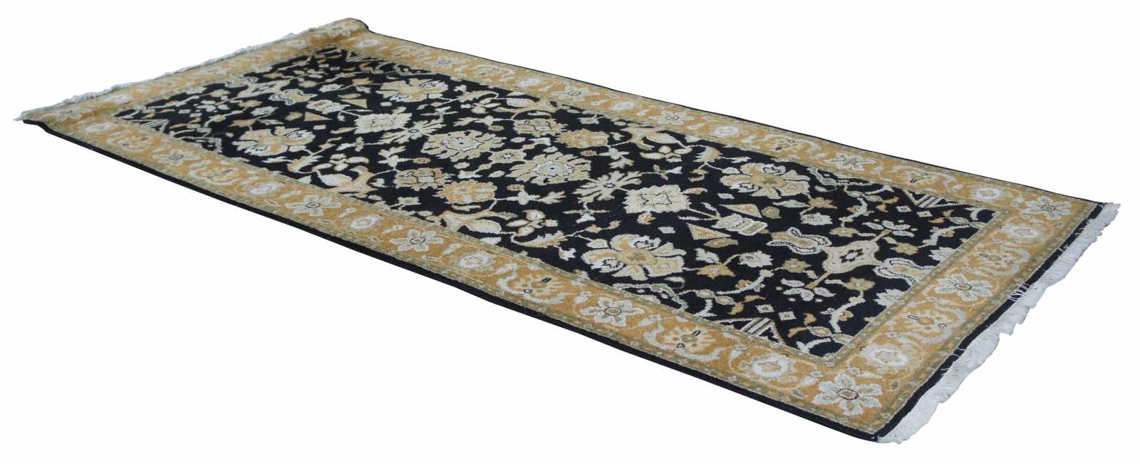Vintage machine made rug runner featuring floral design with black field and gold / olive / green / tan accents.