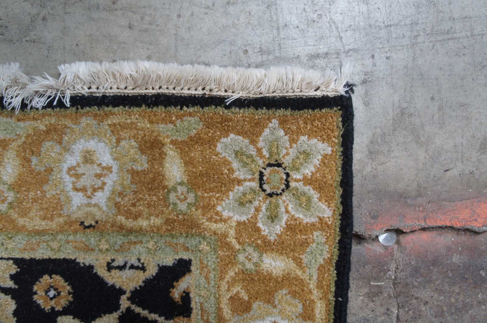 Vintage machine made rug runner featuring floral design with black field and gold / olive / green / tan accents.