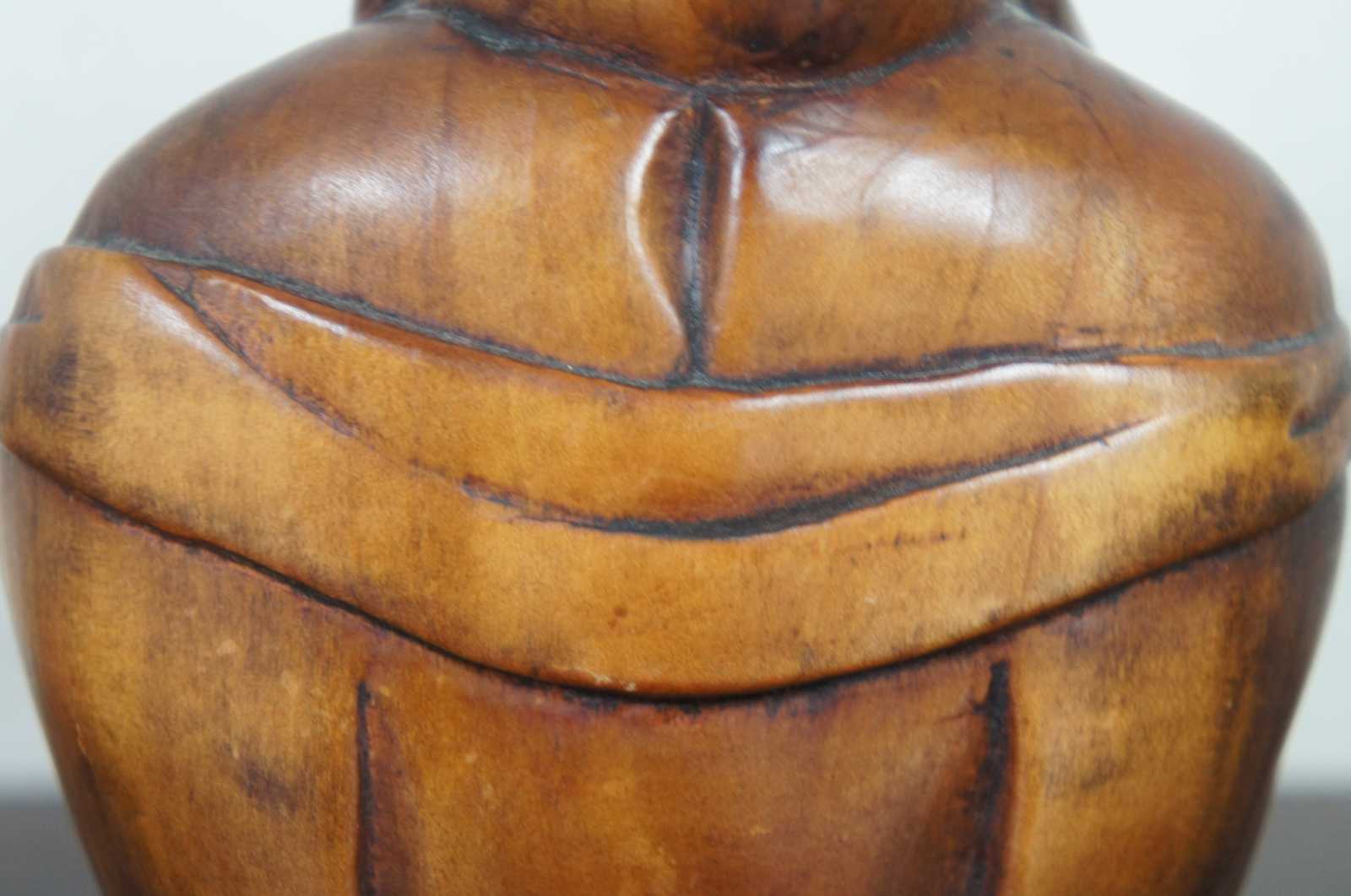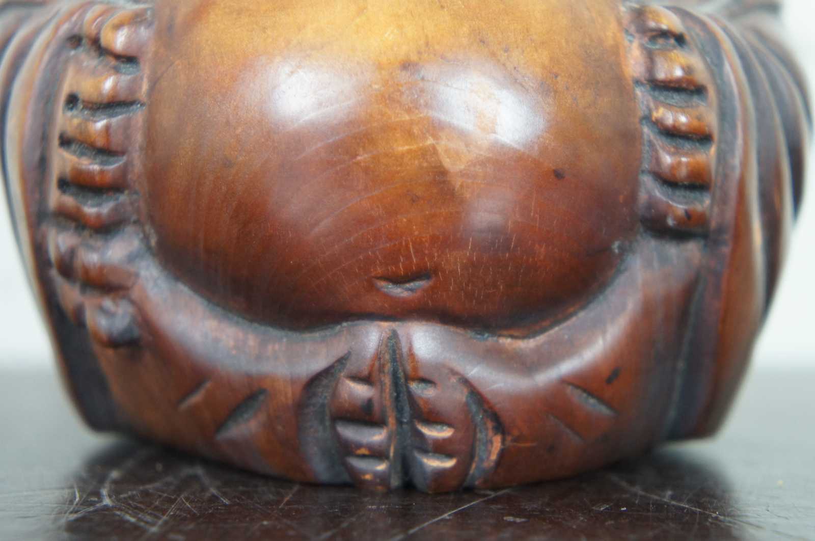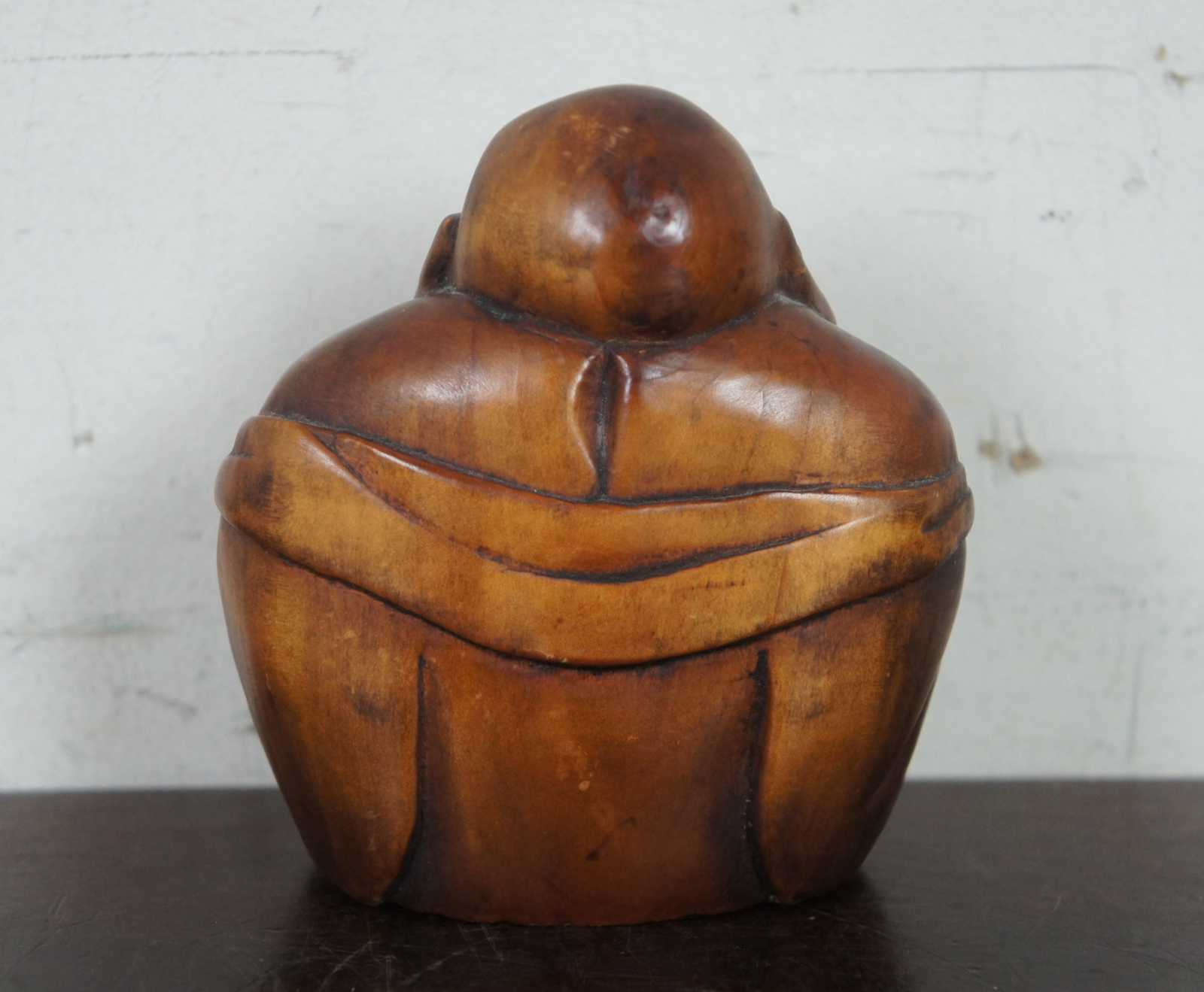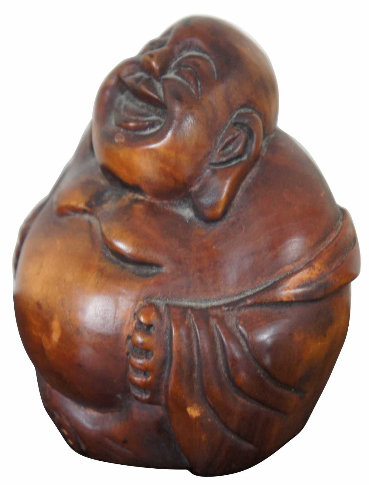 Vintage wooden seated, lucky Buddha figurine with his head thrown back in laughter. / Not to be confused with THE Buddha (Siddhartha Gautama, the 6th Century BC ascetic revered by Buddhists for finding enlightenment) the Laughing Buddha was a 10th-century Chinese monk named Budai. According to accounts written centuries later, Budai was a gregarious, pot-bellied monk who wandered from village to village carrying a large sack over his shoulder. (Budai means ""cloth sack"" in Chinese.) He was beloved by children and the poor, to whom he would give rice and sweets from his sack.