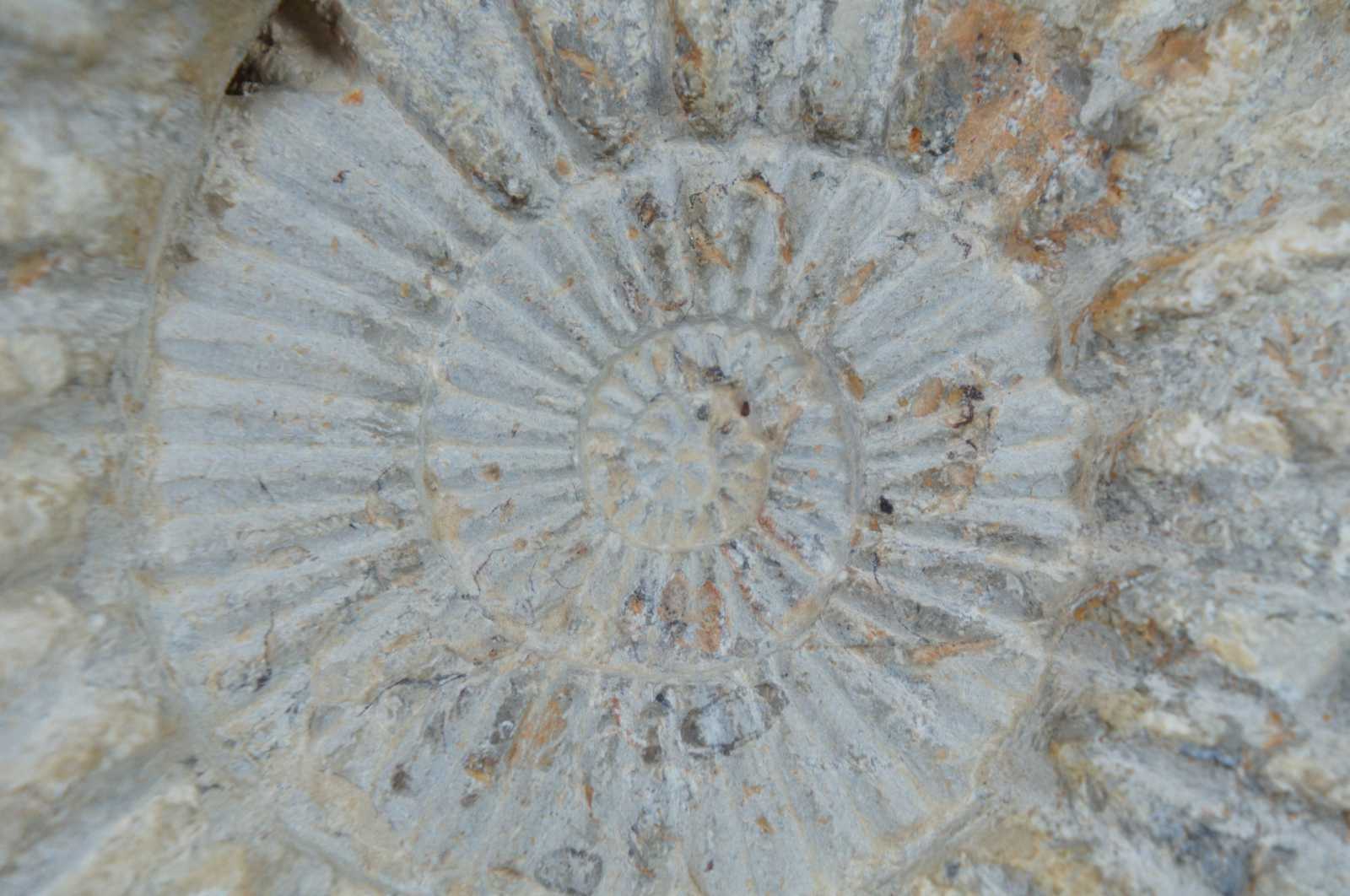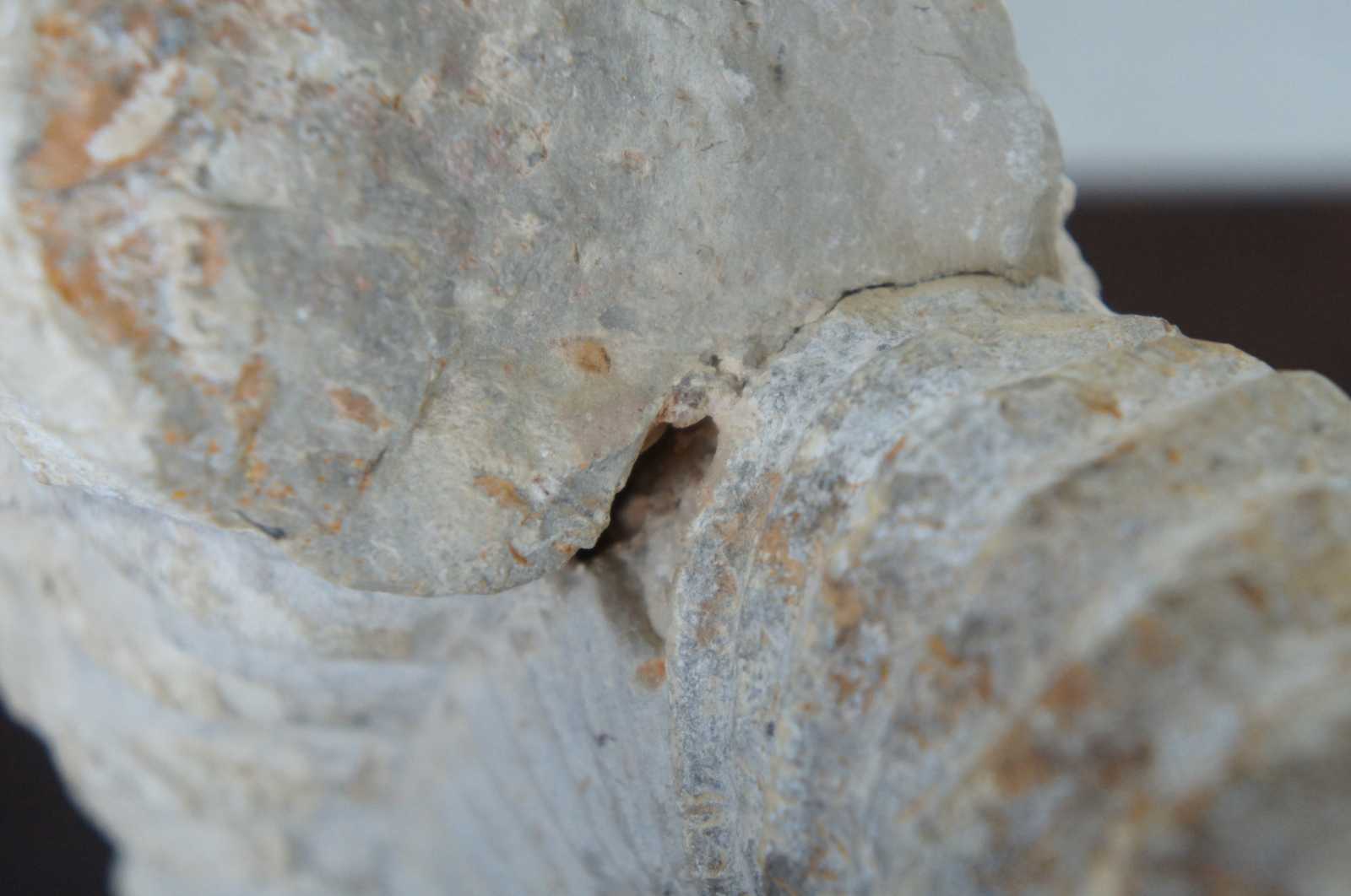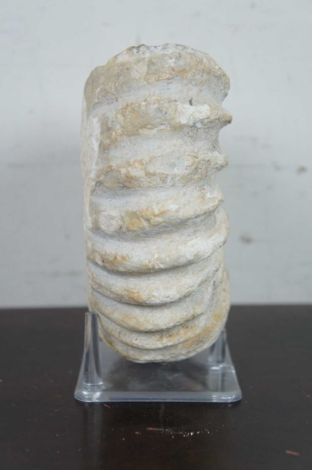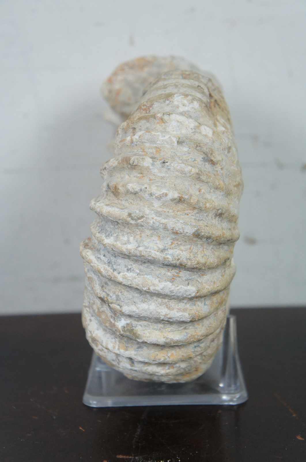 Ammonite spiral shell fossil and clear plastic stand.