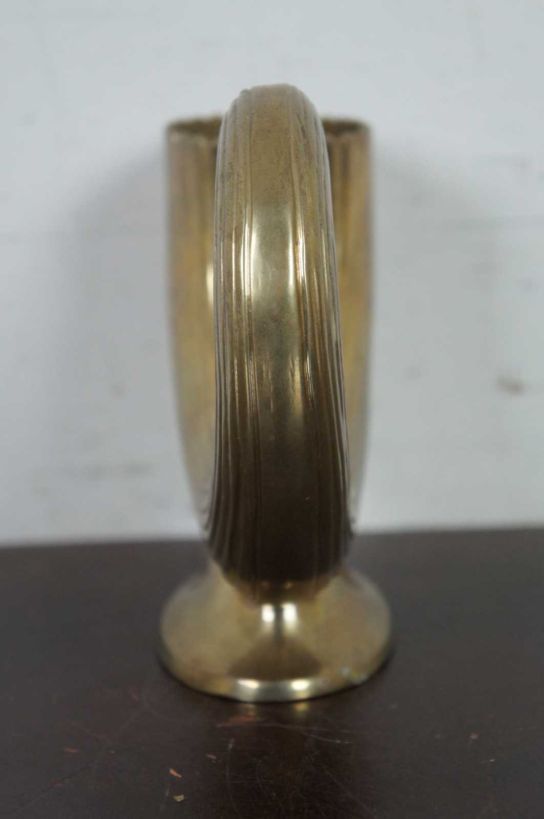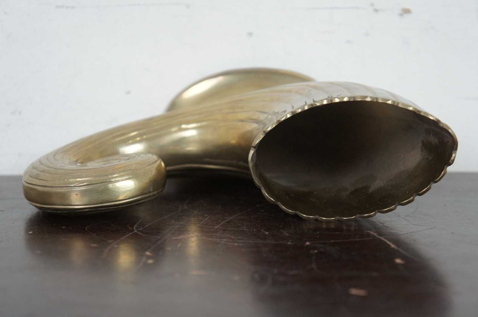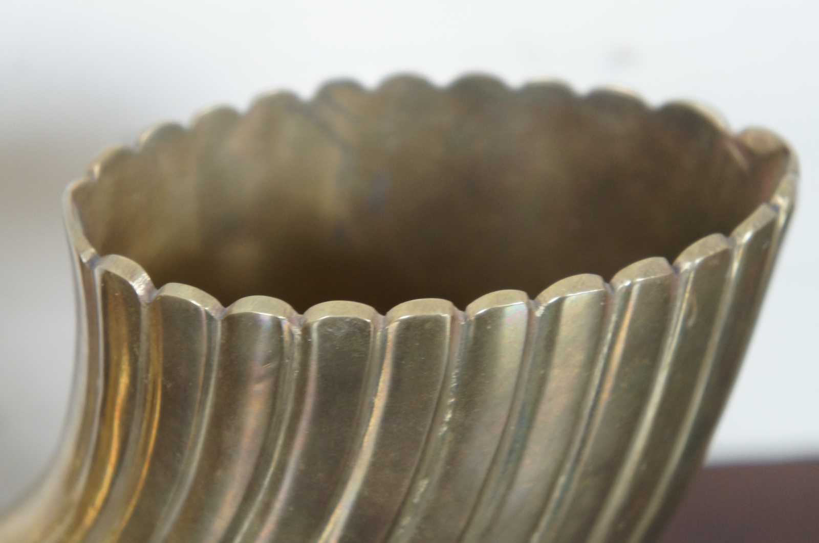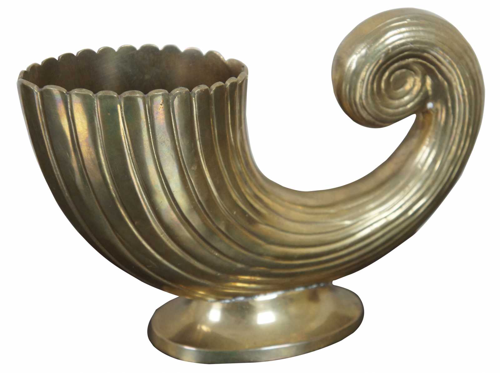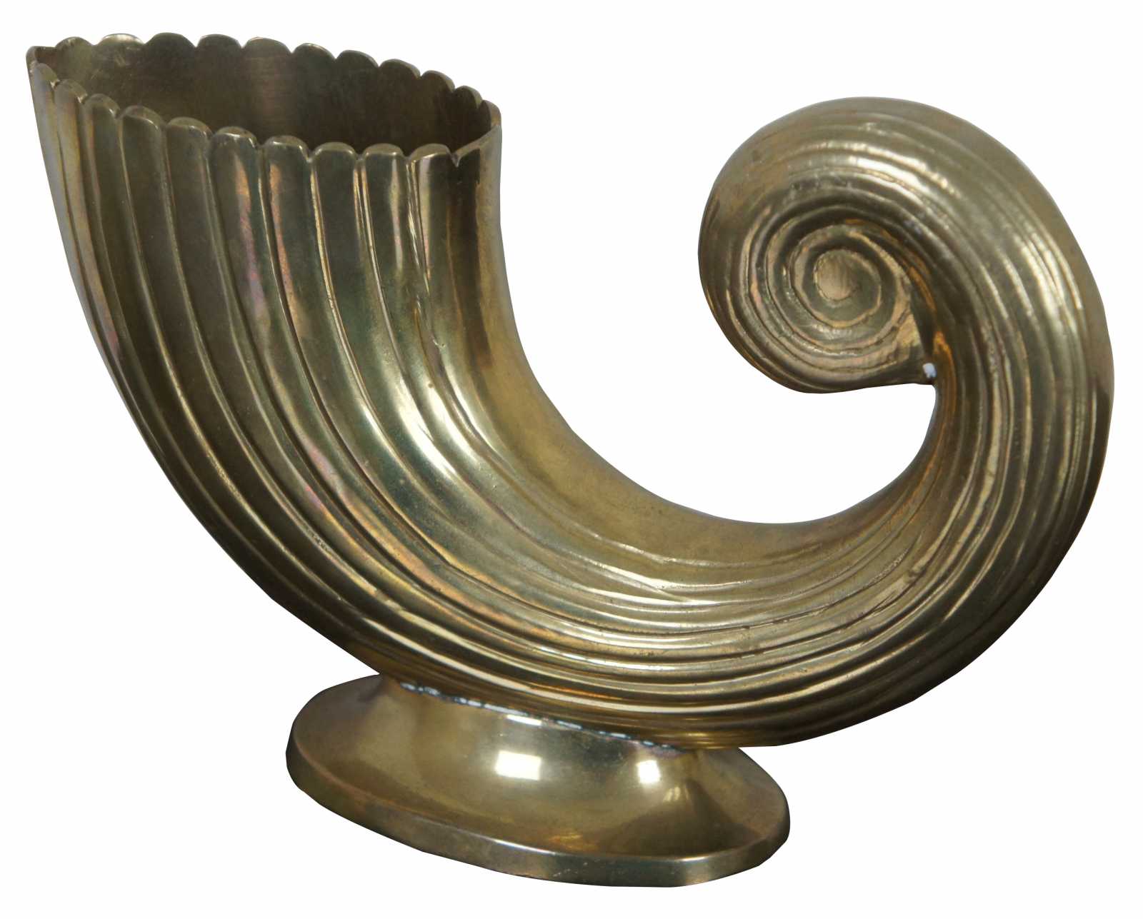 Great cornucopia shaped vintage solid brass vase that has ribbed sides and a tightly curled end. It sits on an oval shaped pedestal base. This horn shape has ribs on it giving it that end up in a scalloped rim on the open portion of the cornucopia or horn shape. Item is circa 1970, made in India.