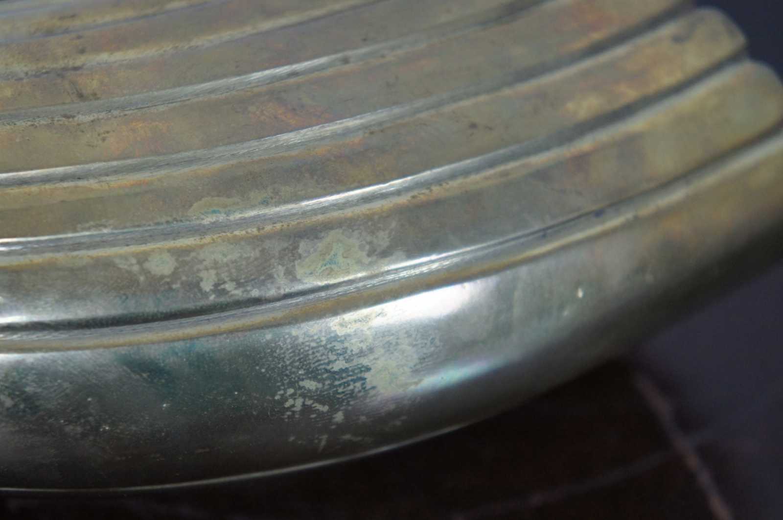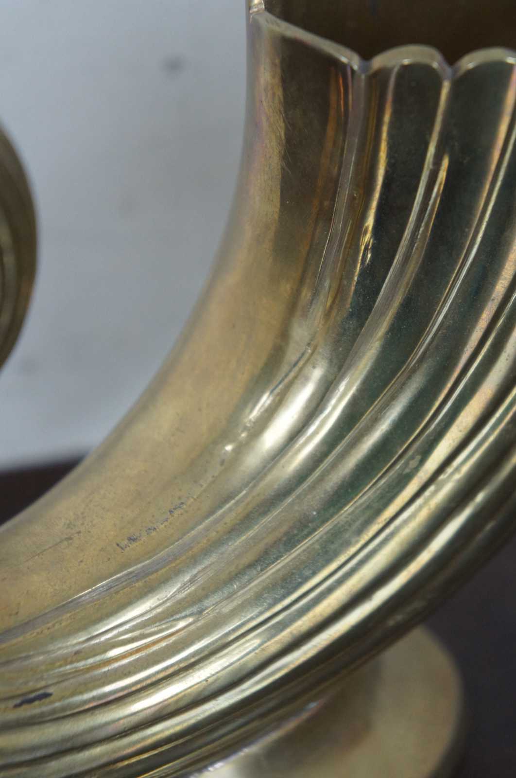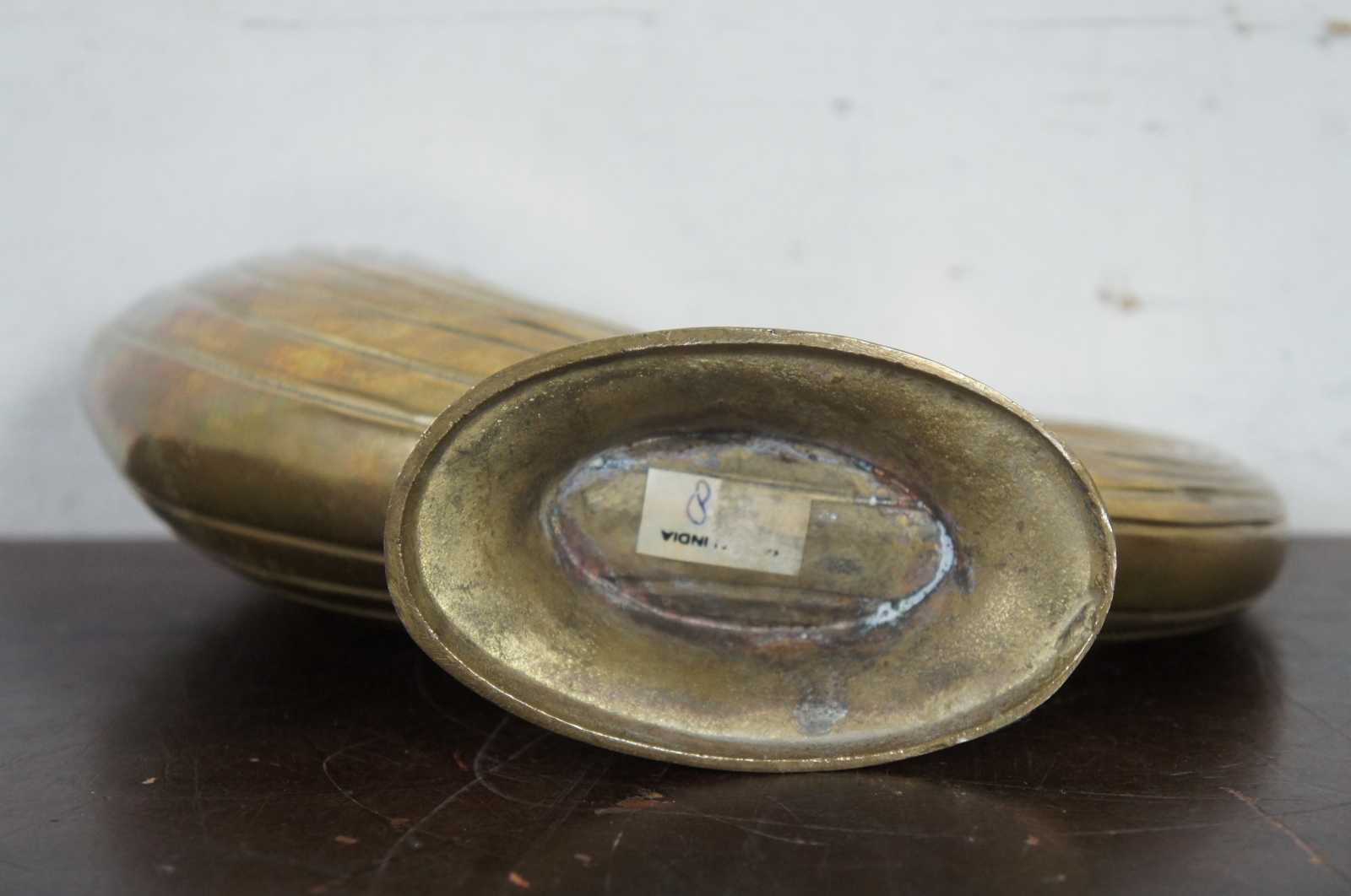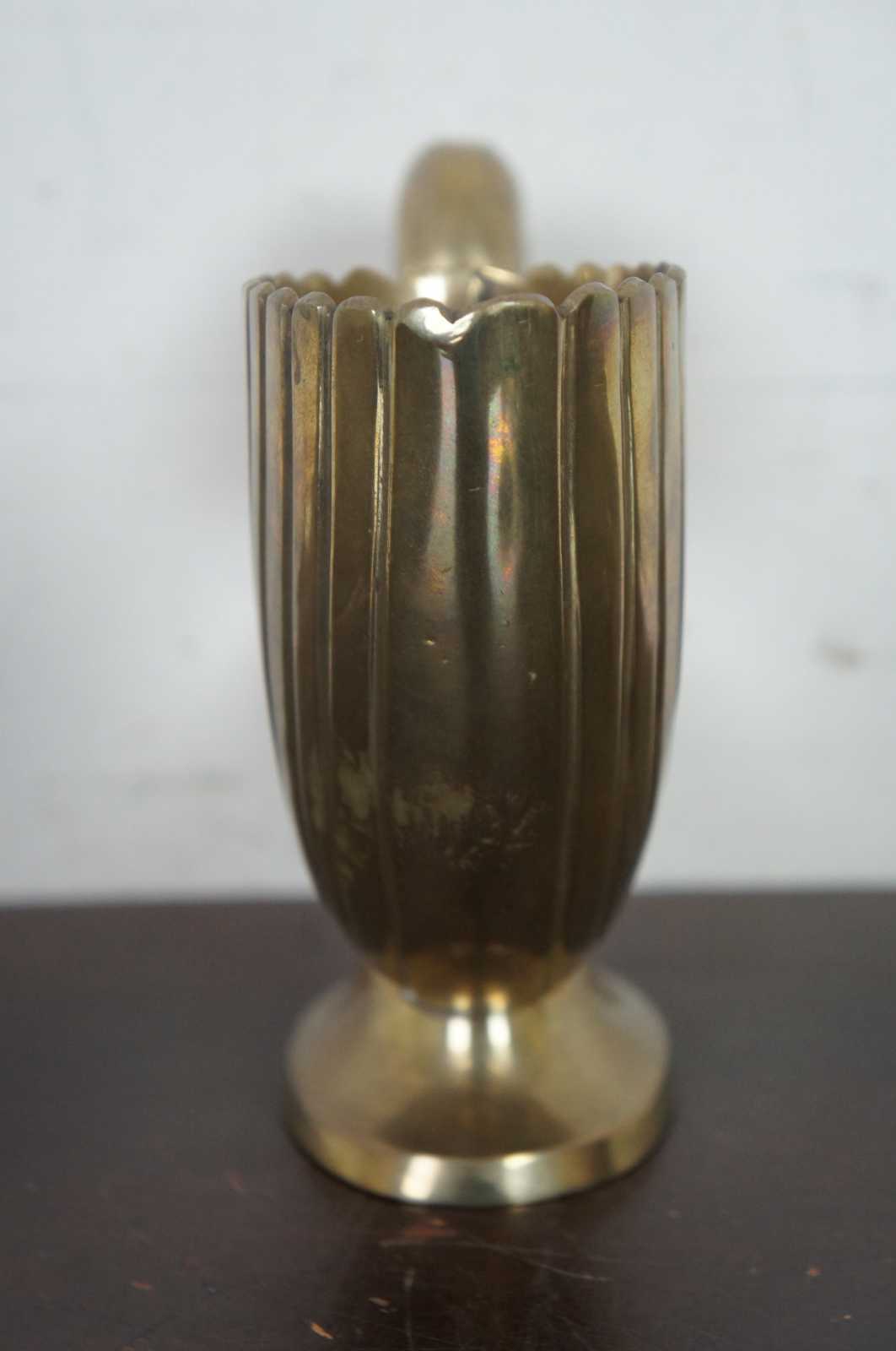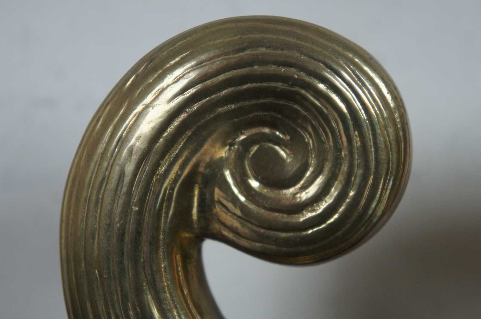 Great cornucopia shaped vintage solid brass vase that has ribbed sides and a tightly curled end. It sits on an oval shaped pedestal base. This horn shape has ribs on it giving it that end up in a scalloped rim on the open portion of the cornucopia or horn shape. Item is circa 1970, made in India.
