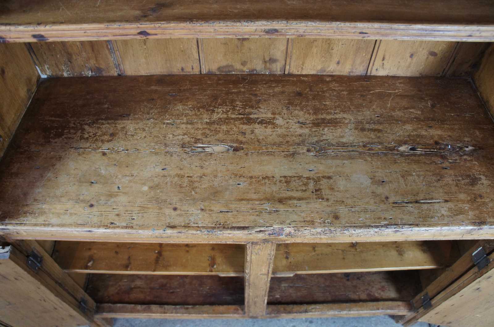 Early 20th century old world English pine bookcase. A stepback design with three shelves and lower cabinet for storage. Each of the three shelves features a unique support that removes allowing you to display and protect the china behind it.
