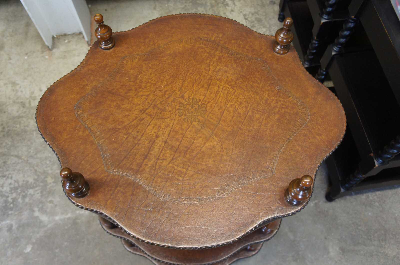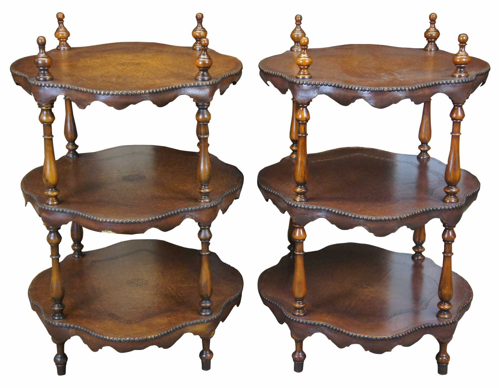 Circa 1980s Theodore Alexander tiered leather tables. Features three turtle top table surfaces, supported by turned ballisters. Includes tooled leather and nailhead trim. 5033-003, handmade in Vietnam.