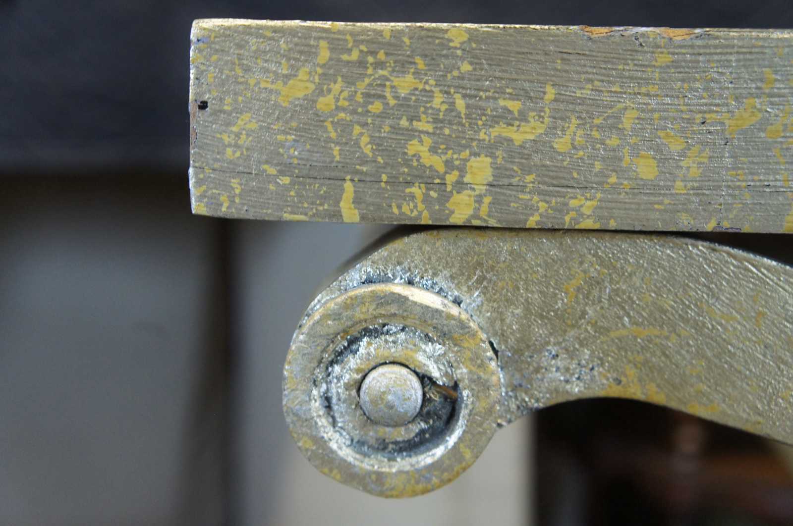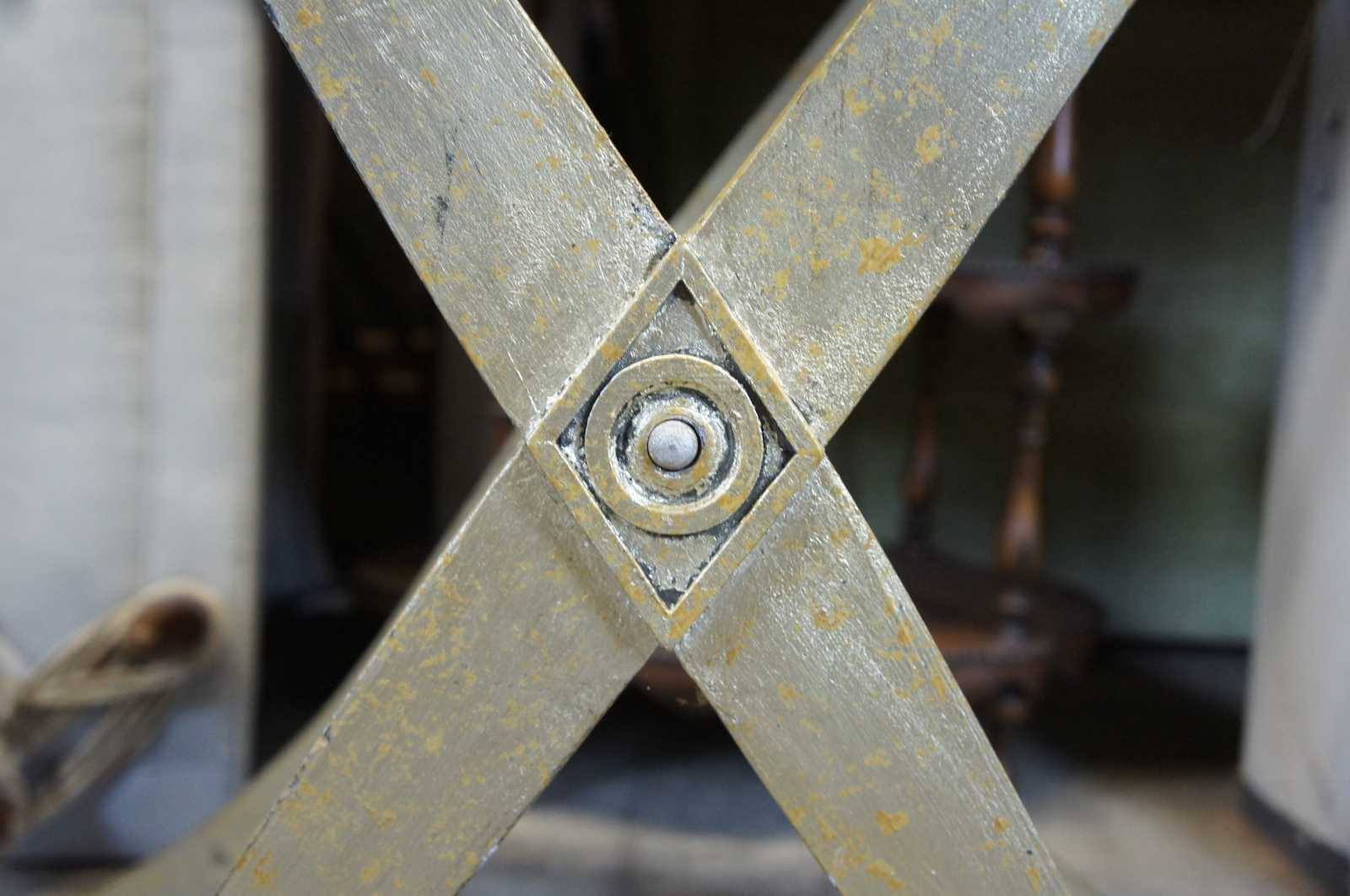 Neoclassical style console or entry table. Features an X shaped base in painted gold foil finish.