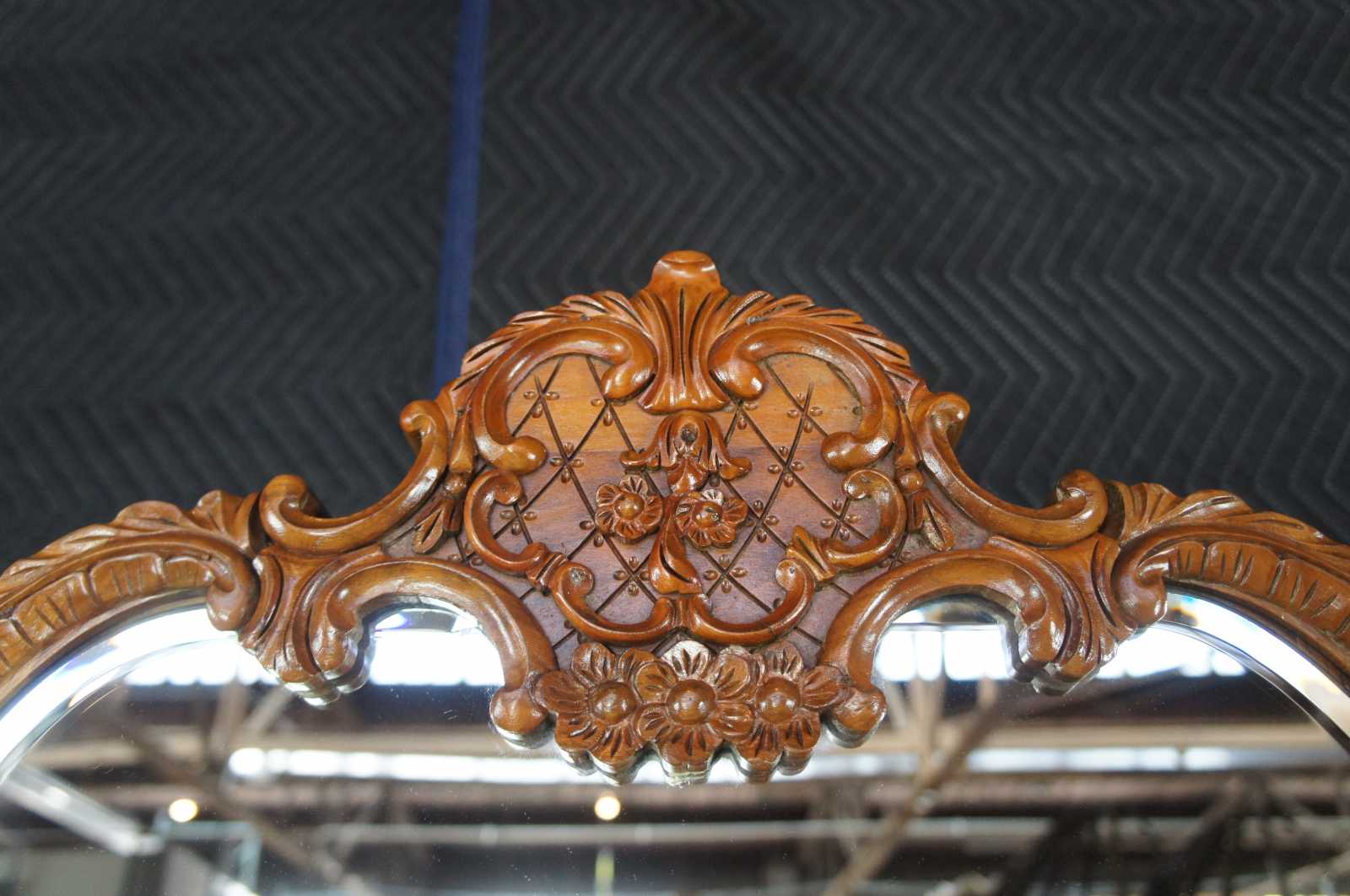 Circa 1920s French dresser and mirror. Features a curved shape with matchbook veneering and burled accents. Made from walnut, ornately carved. Includes three drawers, and cabriole scrolled feet.