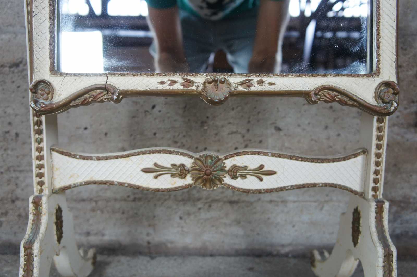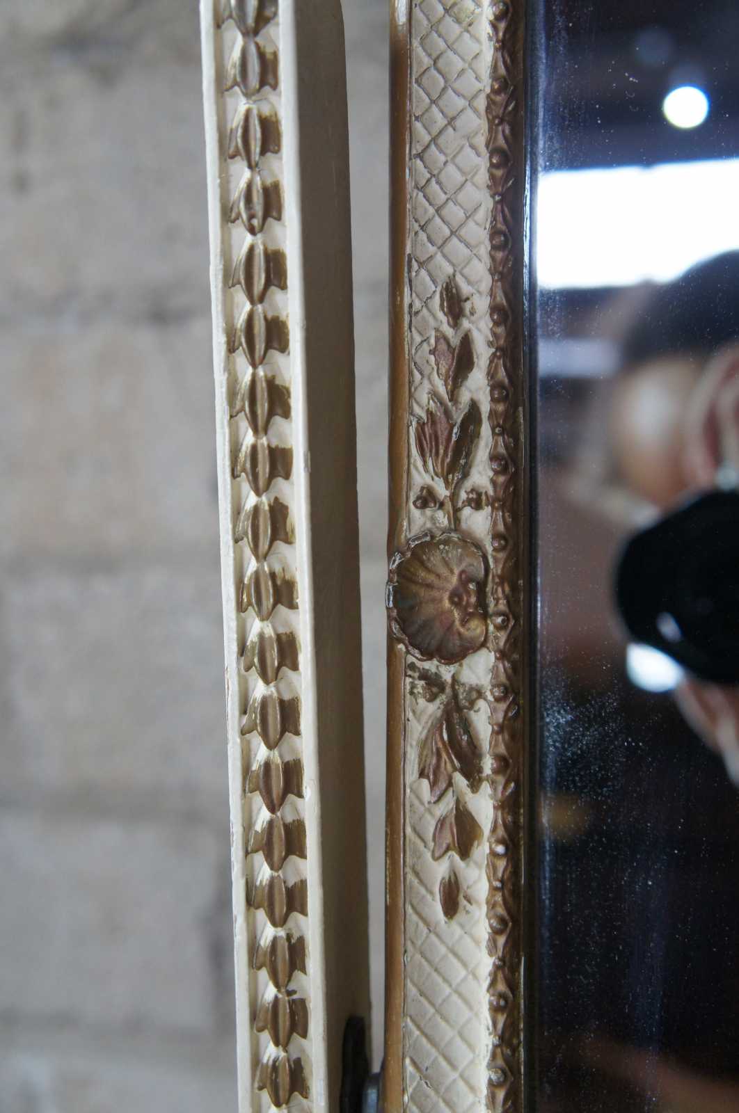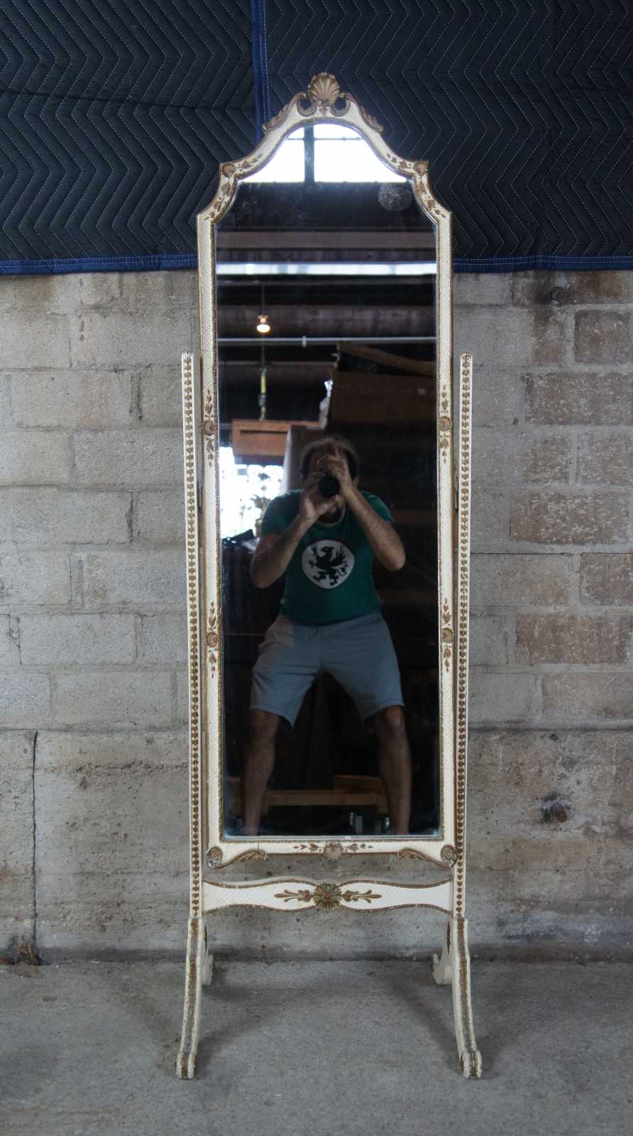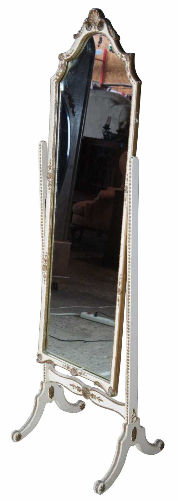 Antique circa 1940s French Provincial Cheval mirror. White with scalloped gold trim.