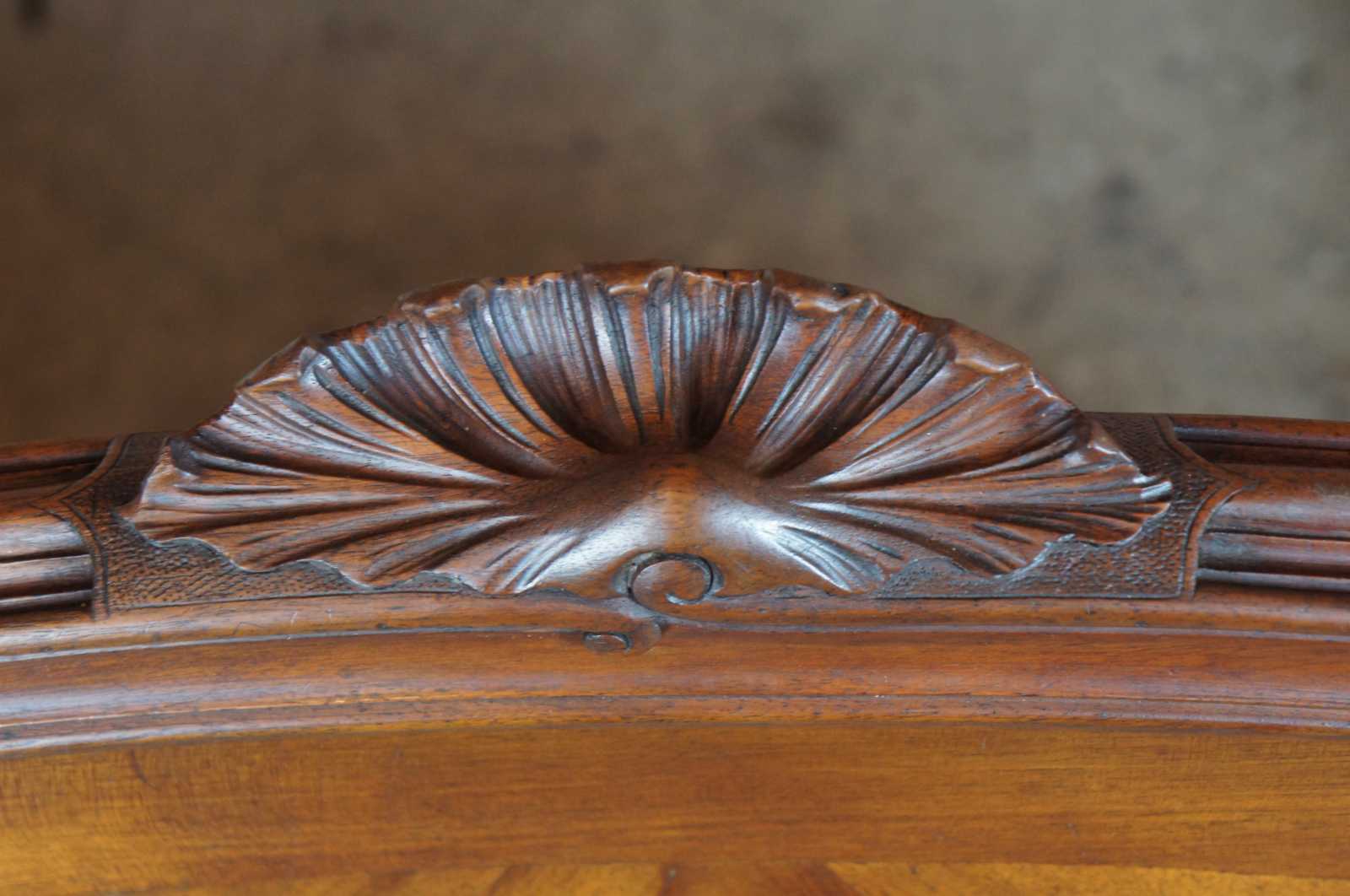 Mid 19th century French or Rococo Revival walnut bed. Features matchbook diamond pattern paneling with thick grooved trim and ornately carved floral and scalloped accents. This bed will fit a full size mattress as long as the box spring or wood supports are built above the side rails, otherwise you will need a custom mattress.