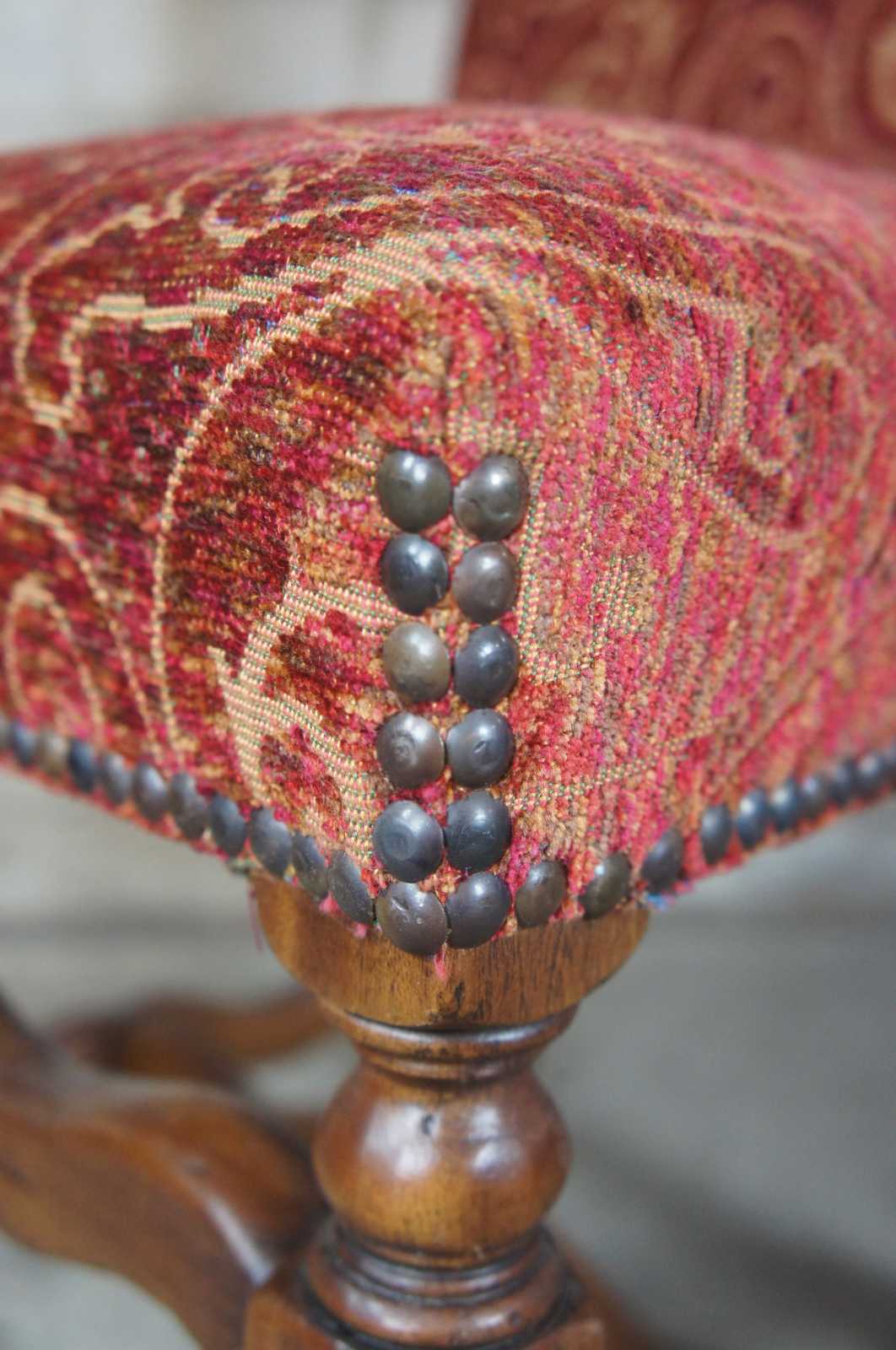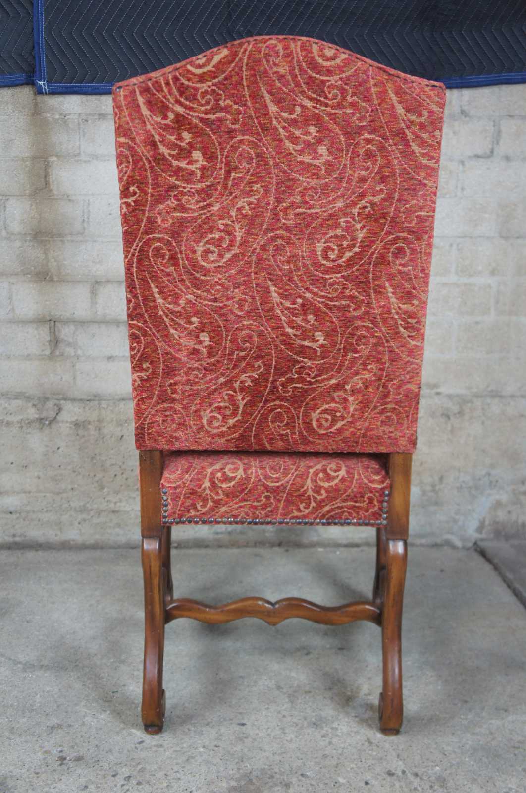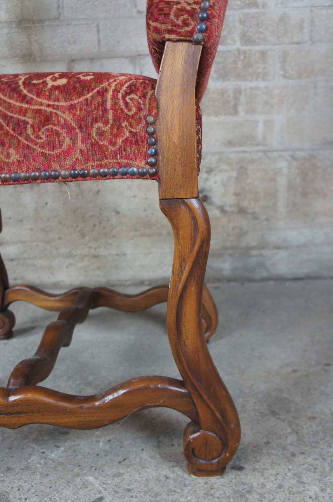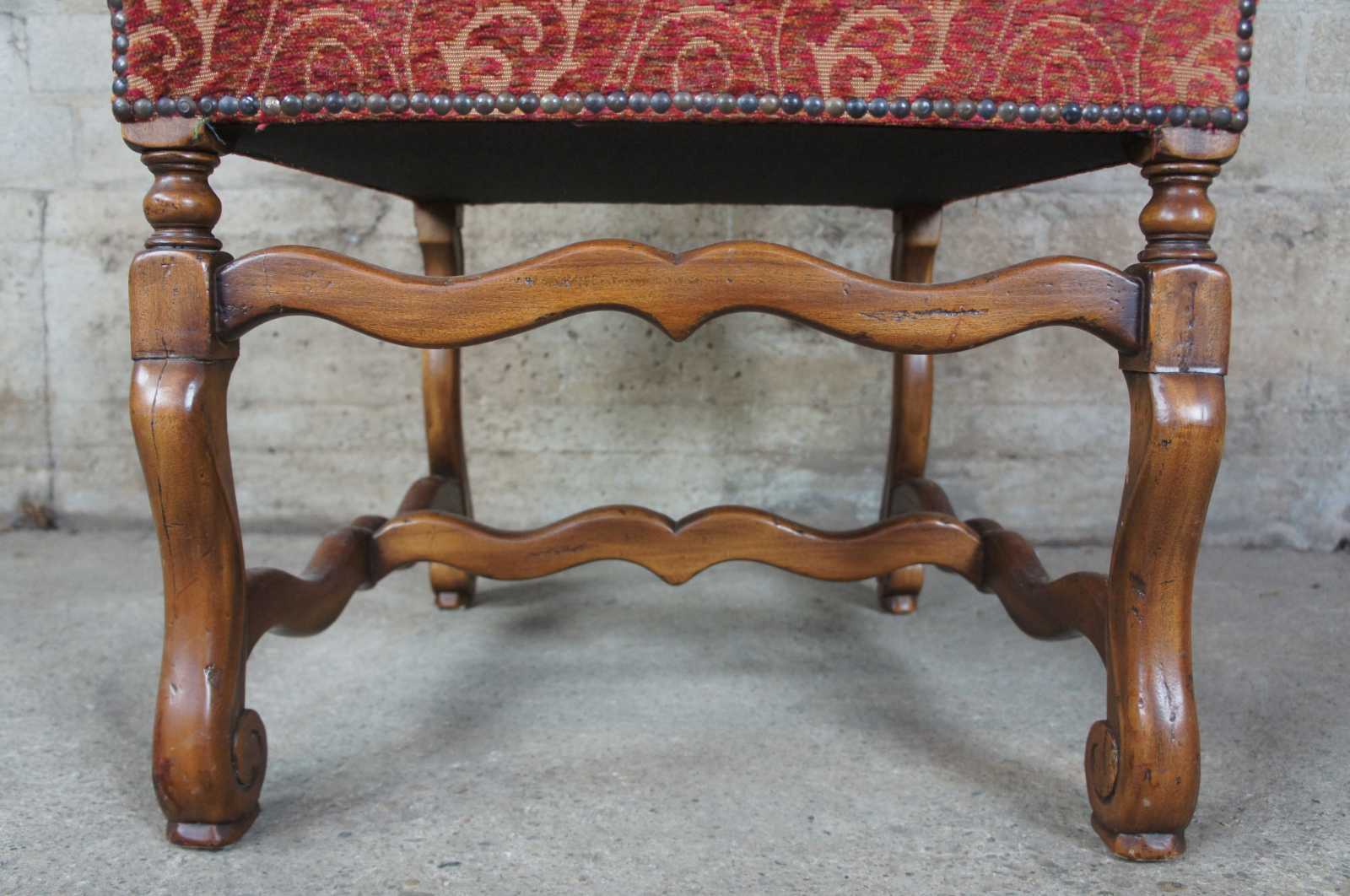 Set of ten Arte De Mexico style oak chairs. Features Tuscan / Spanish Revival or Louis XIII styling with a paisley upholstery accented with nailhead trim. Scrolled feet are connected by serpentine H stretcher.
