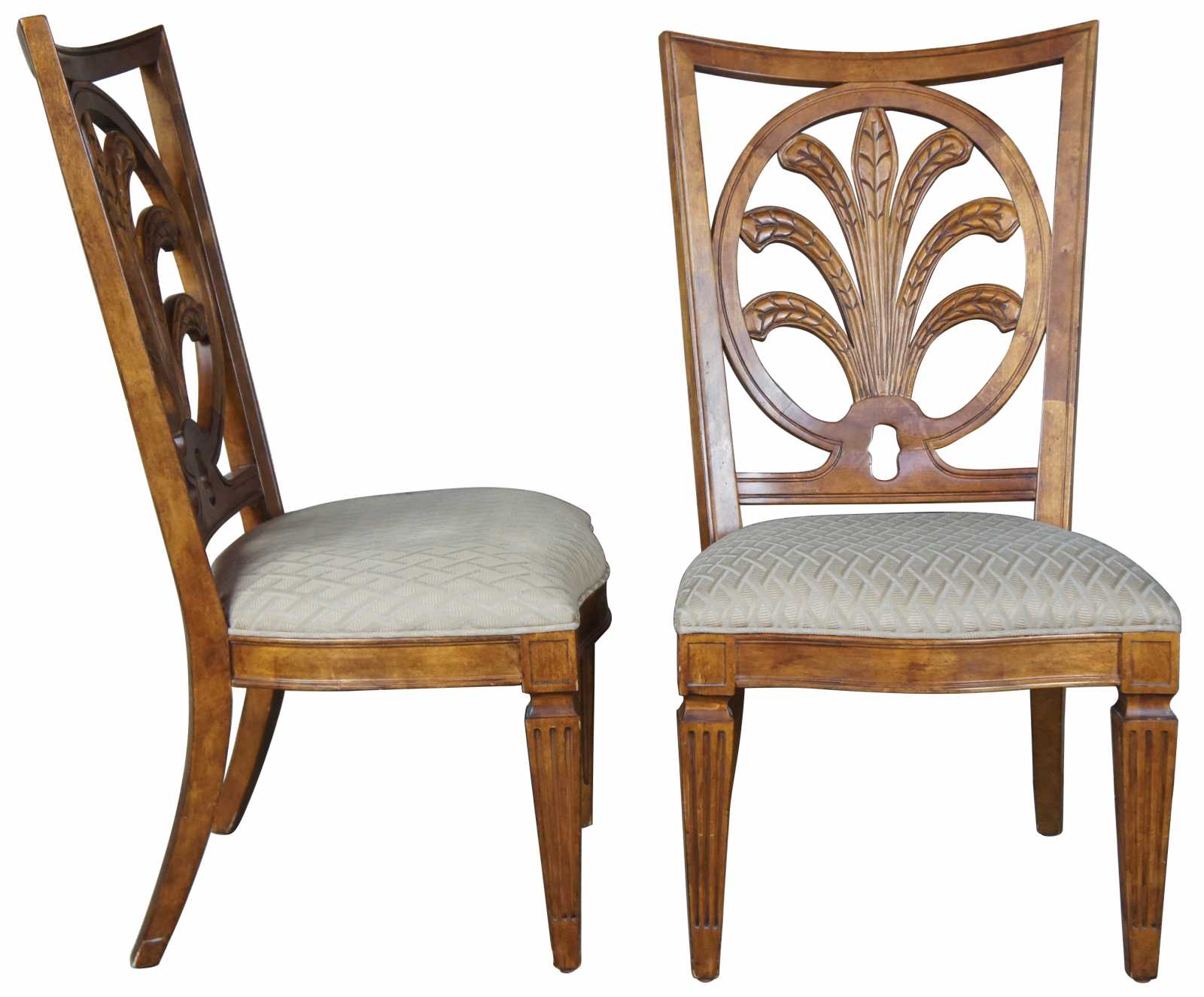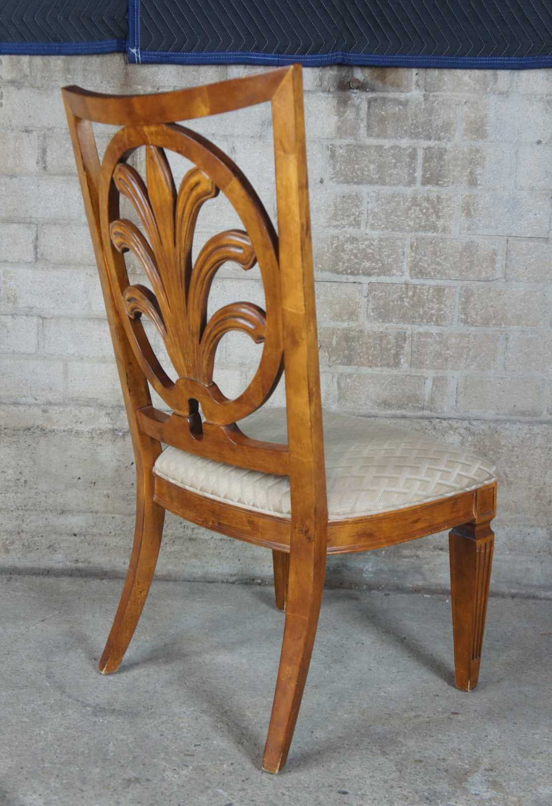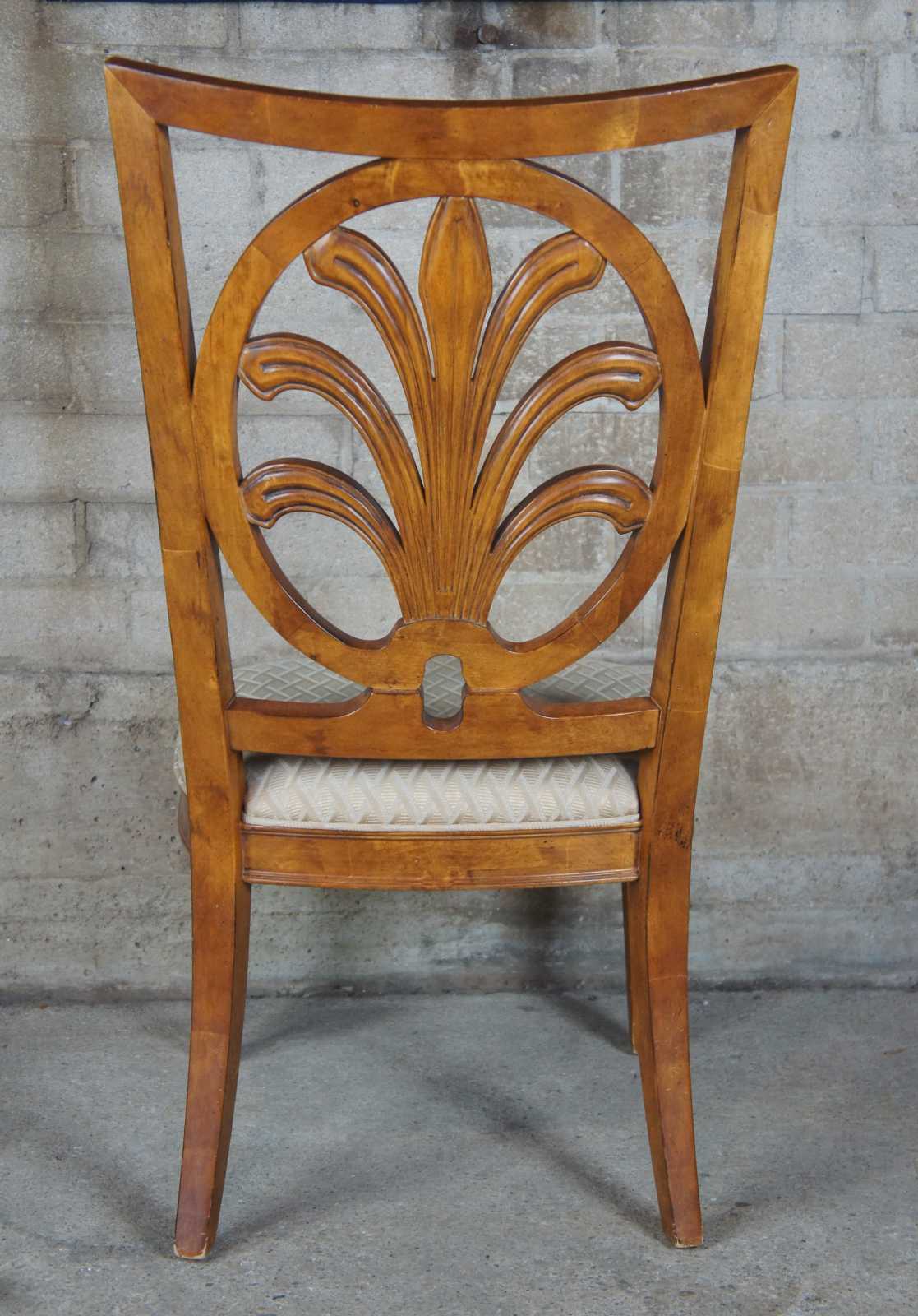 8 Century Furniture Mitsford dining chairs finished in Edinburgh (maple) finish, item #3821 / 52-531, circa 2001. Feature pierced back with round circular sprawling leaf design that resembles a sheath of wheat or acanthus style. An upholstered seat leads to tapered and fluted legs.
