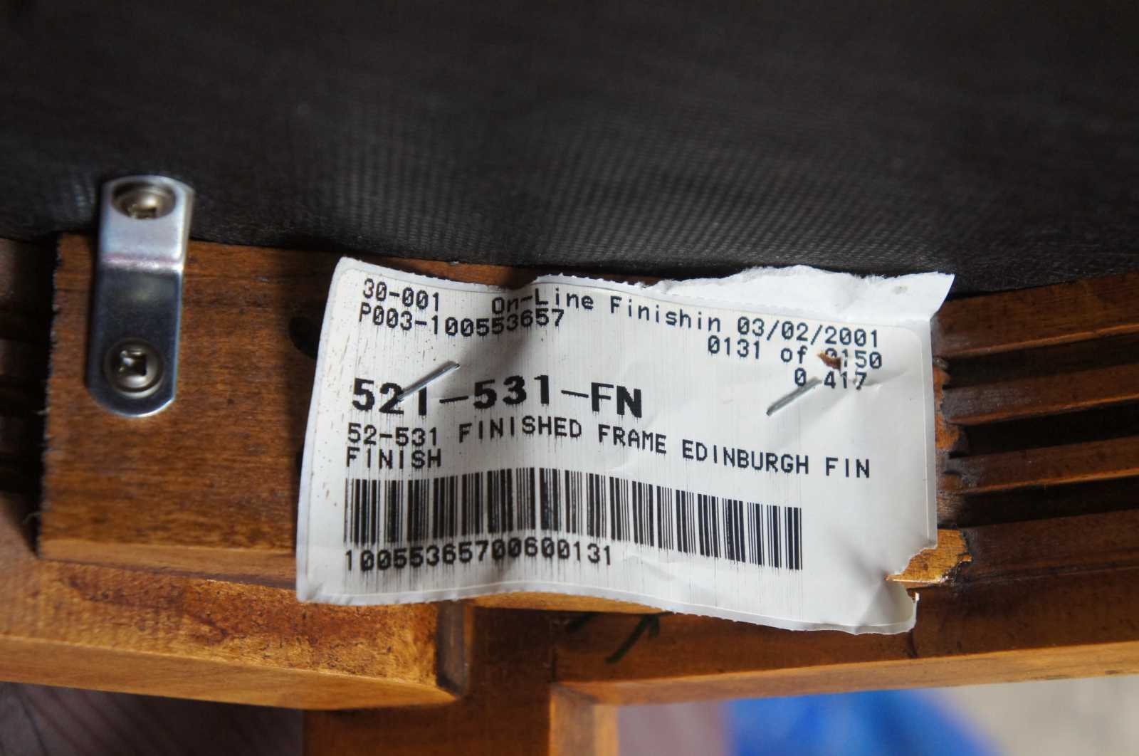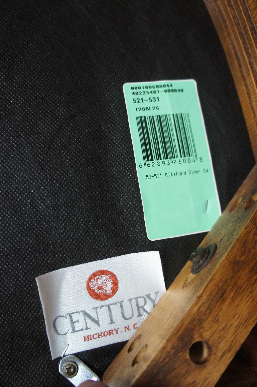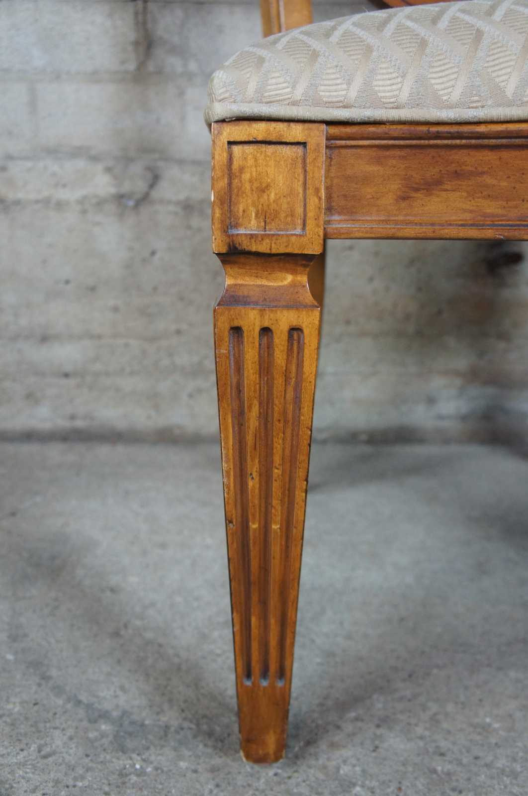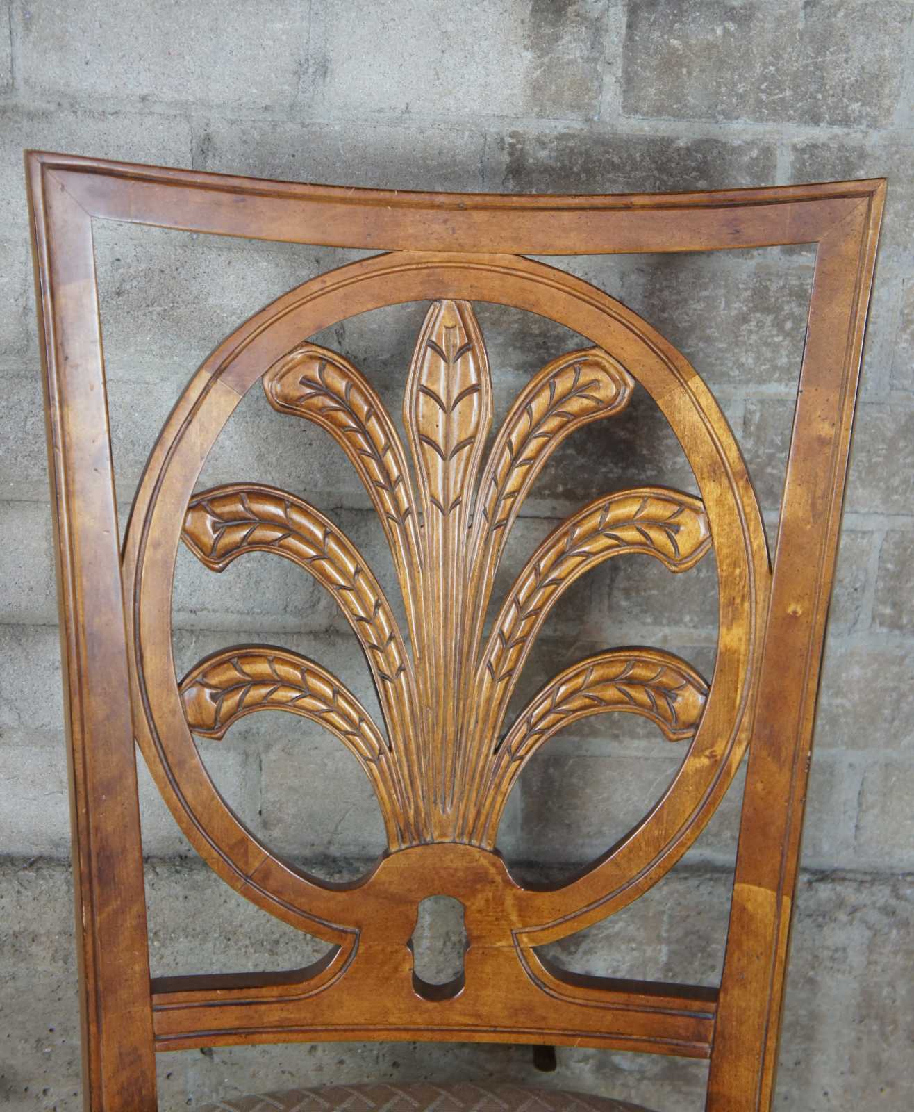 8 Century Furniture Mitsford dining chairs finished in Edinburgh (maple) finish, item #3821 / 52-531, circa 2001. Feature pierced back with round circular sprawling leaf design that resembles a sheath of wheat or acanthus style. An upholstered seat leads to tapered and fluted legs.