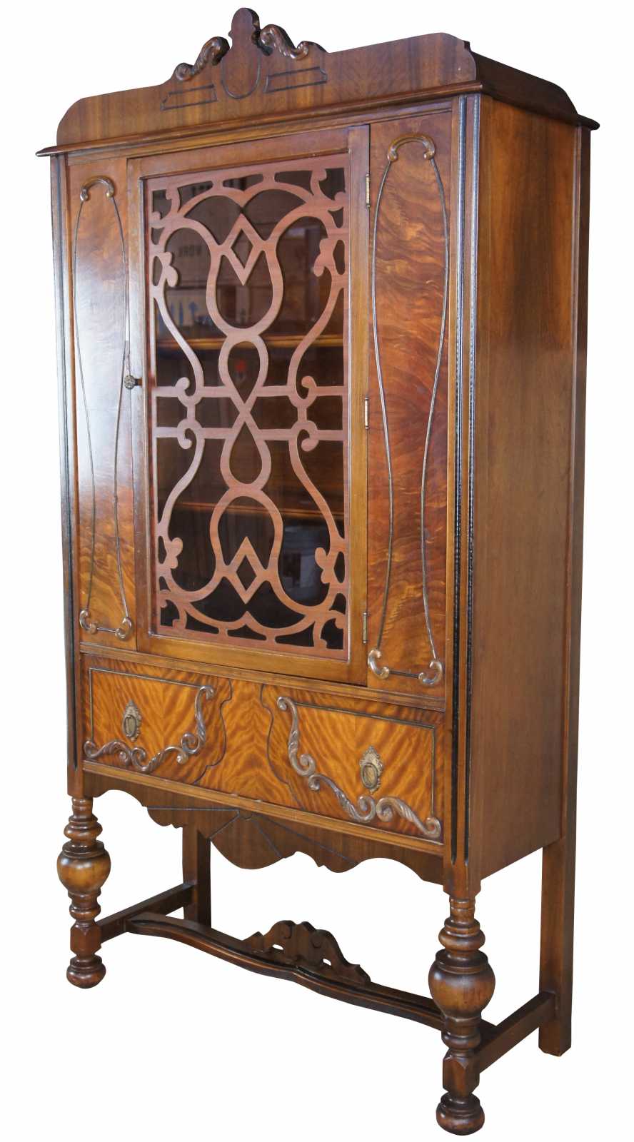 Early 20th century Jacobean style china cabinet. Made from walnut with a burled front. Features two shelves concealed by a large central door lined with fretwork over dovetailed silverware drawer. Includes a serpentine crown and lower apron. The cabinet is supported by turned ballusters leading to bun feet; connected by an H stretcher.