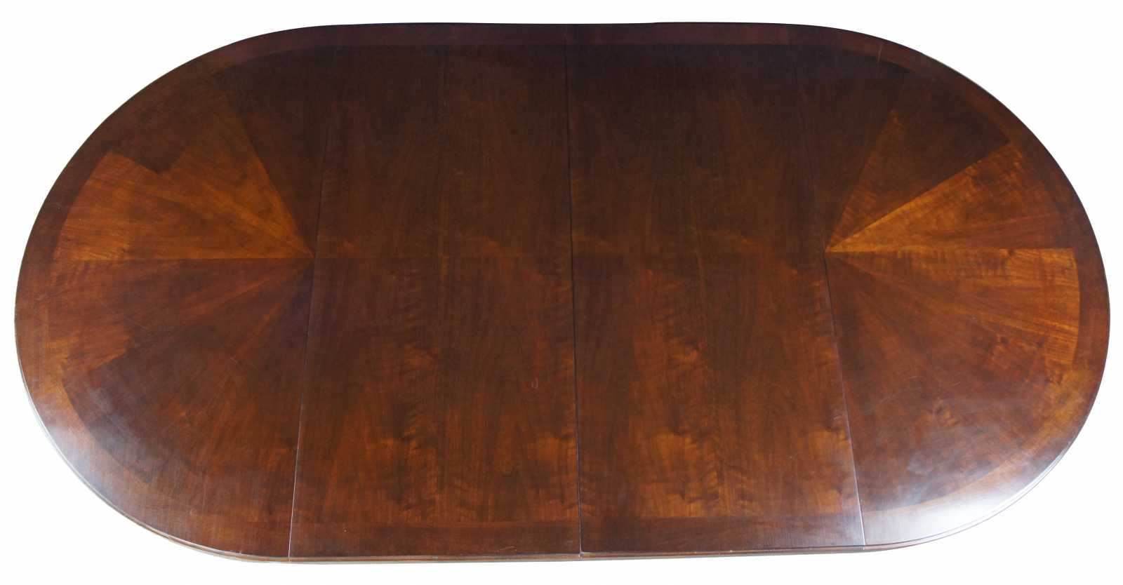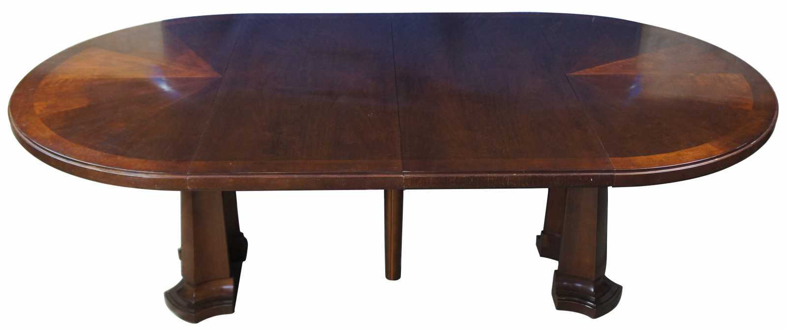 An original design from Laura Kirar, the Noir reflects the restrained geometric character of Vienna Secession design-an evolution from Biedermeier to Art Deco. Baker Furniture Noir round extendable dining or breakfast table is made from American Walnut with a split pedestal base, two leaves, and pads. # 9137.