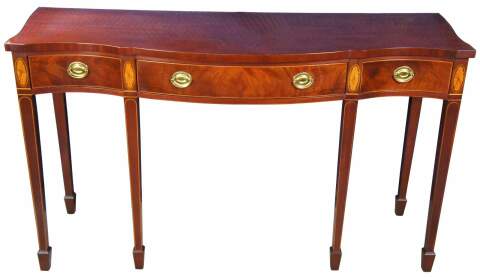 Circa 1990s Baker Historic Charleston three drawer mahogany console table. Features a mixture of Federal and Sheraton styling with a serpentine front leading to book matched mahogany with Satinwood inlay, brass hardware, and long tapered legs leading to spade feet.