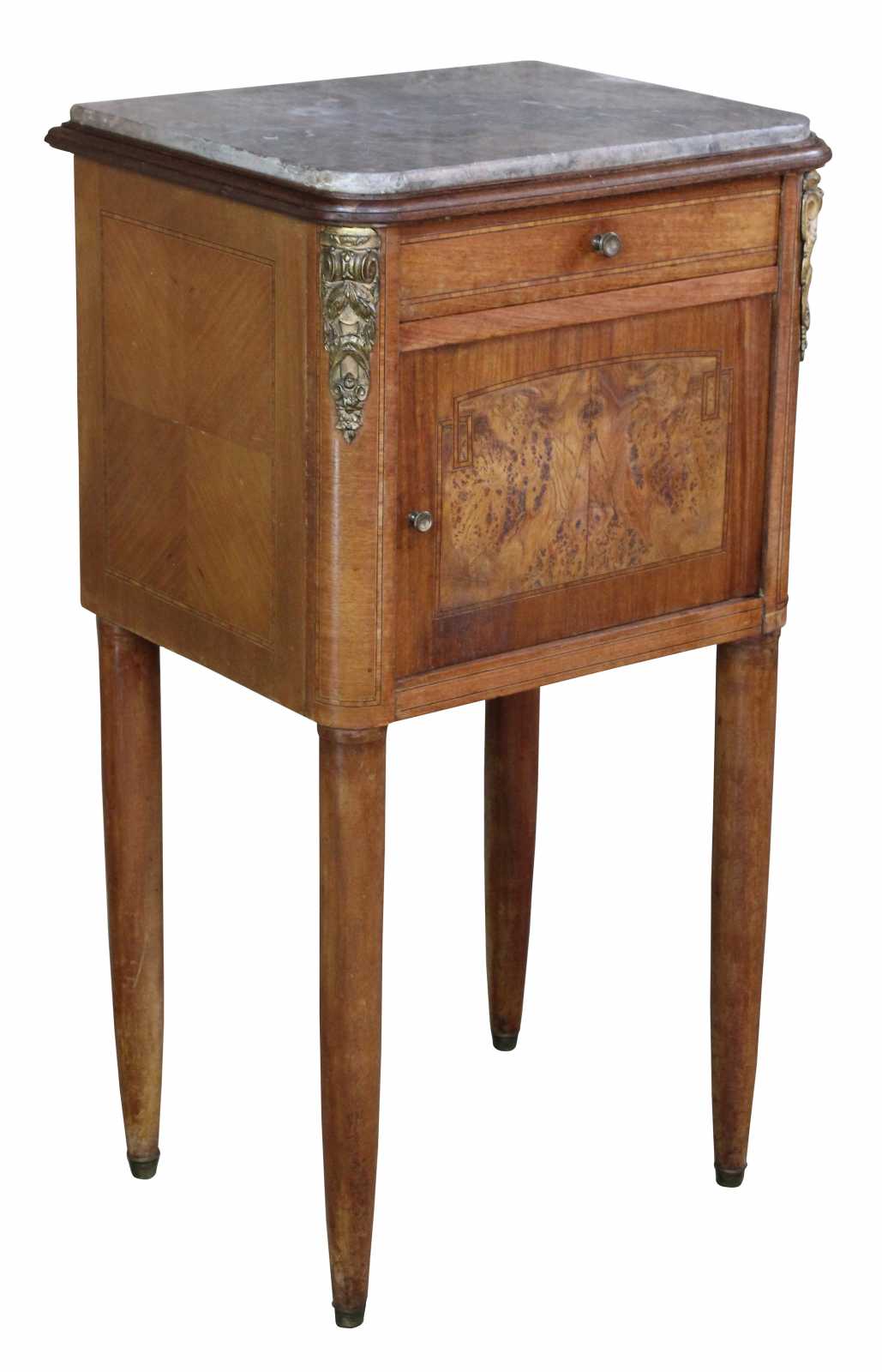 Antique 19th century French humidor table. Features a hand dovetailed drawer and lower marble lined tobacco cabinet. Made from walnut with an inset marble top, ormolu mounts, inlay and burled cabinet front.