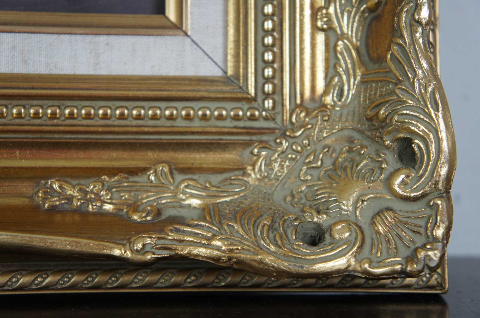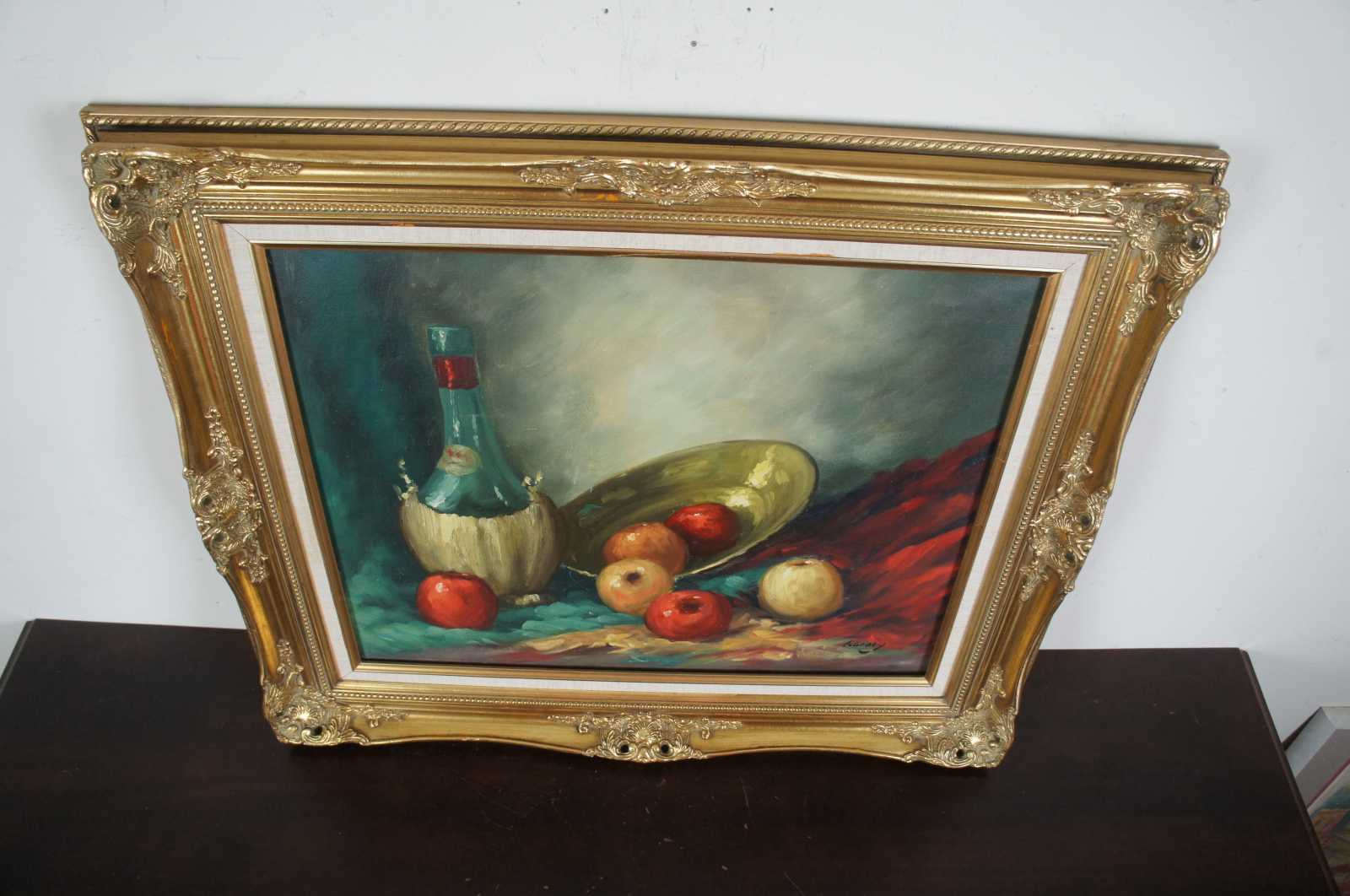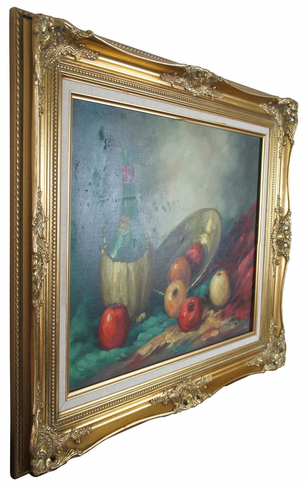 Vintage oil on canvas still life painting featuring a fruit bowl of apples next to a wine bottle on teal and red cloth, signed Luborty.