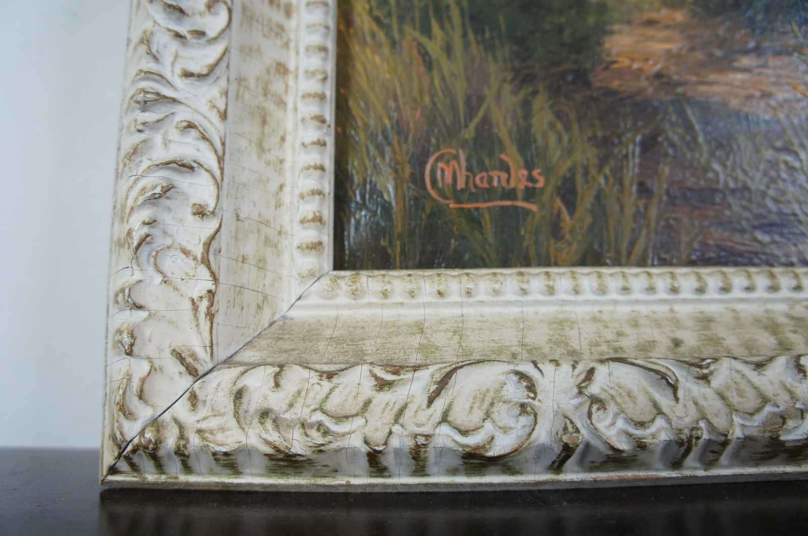 Oil on canvas landscape painting of a dead tree in the middle of sand dunes at the edge of the ocean, signed M. Charles. Donald Leary 1916 - 1991 painted images of the Outer Banks North Carolina under the name M Charles. He Signed his works "M. Charles" with the M inside of the C. The story of Donald Leary is one that goes to the heart of the Outer Banks. The late painter's work captured the unspoiled essence of the barrier islands, making him a sought-after artist during his reign. The people who have purchased or inherited his work have something special. It's as if they own a little piece of the land and sea before development took hold. Working under the name of M. Charles, Leary created paintings from the time he moved here in the 1950s until his death in 1991. During that nearly 40-year span, he painted dunes, sea, sky and sound in oil. M. Charles, the pseudonym of Donald Leary, came to the area in the early 1950s and, through his artwork, caught the essence of the Outer Banks before it was developed. Leary, a self-taught landscape painter, moved to the Outer Banks from Gloucester, Virginia. His style captured the natural beauty of the area in its undisturbed serenity. His paintings depict the underlying spirit of the land before the invasion of high-rise hotels, fast-food restaurants, and multi-family cottages. Even though Leary's land-and seascapes are similar in subject matter, they each have a unique individuality. Leary completed over 2,500 paintings from 1954 until his death in 1991. While many of his works were sold to area residents, visitors also purchased the paintings as mementos of their visit to the Outer Banks. They were often sold before the paint was dry. Leary's works are still sought by collectors trying to recapture the natural beauty of the barrier islands. Leary's work captured the look and feel of the North Carolina barrier islands. He spent a lot of time outdoors sketching and painting in the early years. Later years found him mostly in his studio, painting from memory. His first painting was sold in 1954. The artist chose his artistic name when, as a joke, he donned a beret and pranced in front of his family. The story follows that one of his children said he looked like a French artist and therefore was dubbed Monsieur Charles, which was later shortened to M. Charles. He was born in 1916 in Colon, Panama. His father was an army doctor. He graduated from George Washington University with a BA in English in 1941 and a medical degree from William and Mary in 1955. Leary served in World War II in the US Army Corp of Engineers and was discharged as a captain in 1945. "M. Charles of Manteo: Painter of Sand and Sea" is an article that appeared in New East Magazine, the July/August issue in 1975. A retrospective show for his art was held at the Roanoke Island Festival Park, November 2004. One of his paintings is in the art collection of the Town of Nags Head and can be seen at the town Hall.