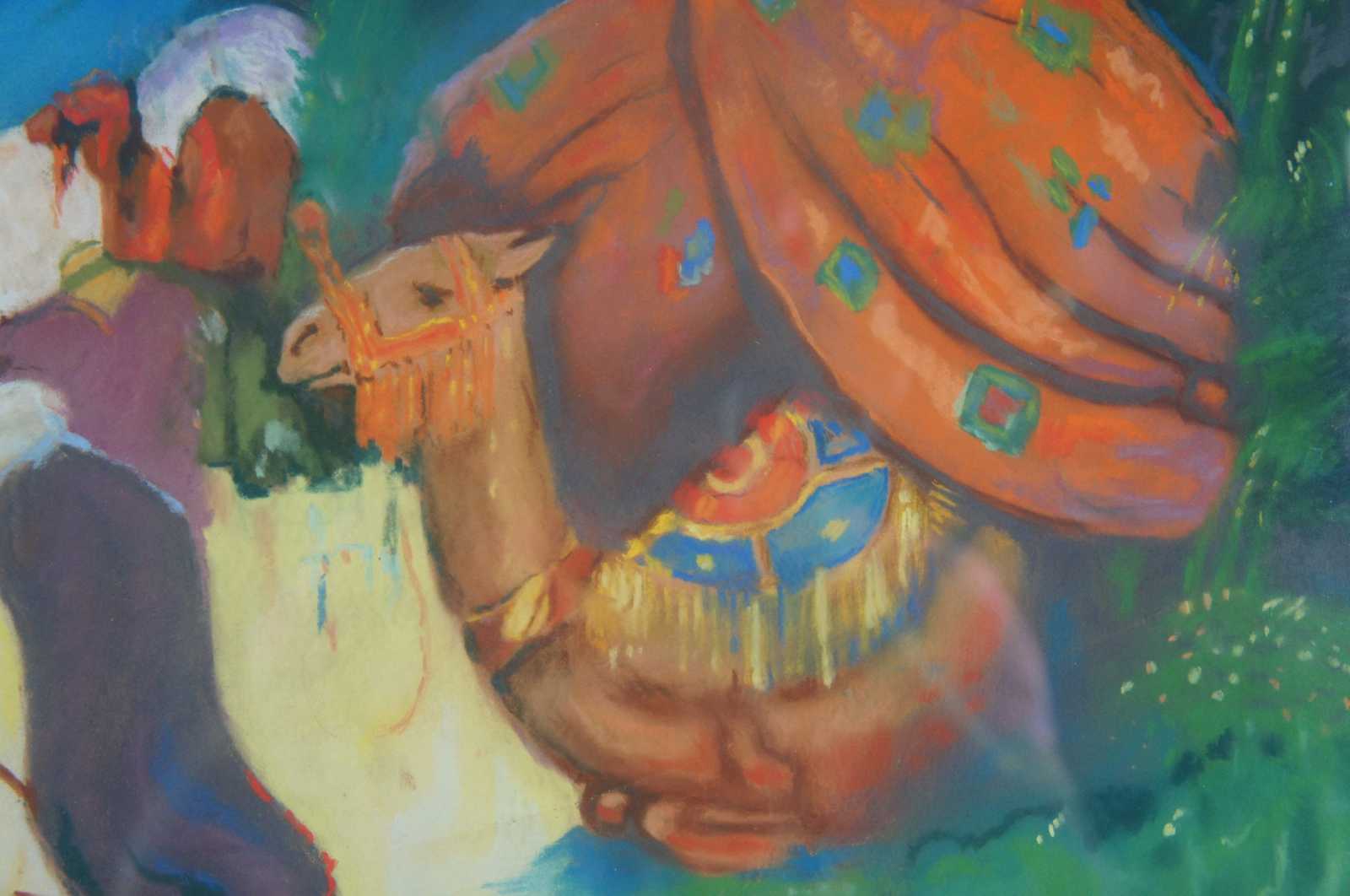 Antique 1933 orientalist watercolor painting featuring a pair of ornately dressed Bedouins encamped at an oasis with brightly colored tents and camels, signed E. Kohl.