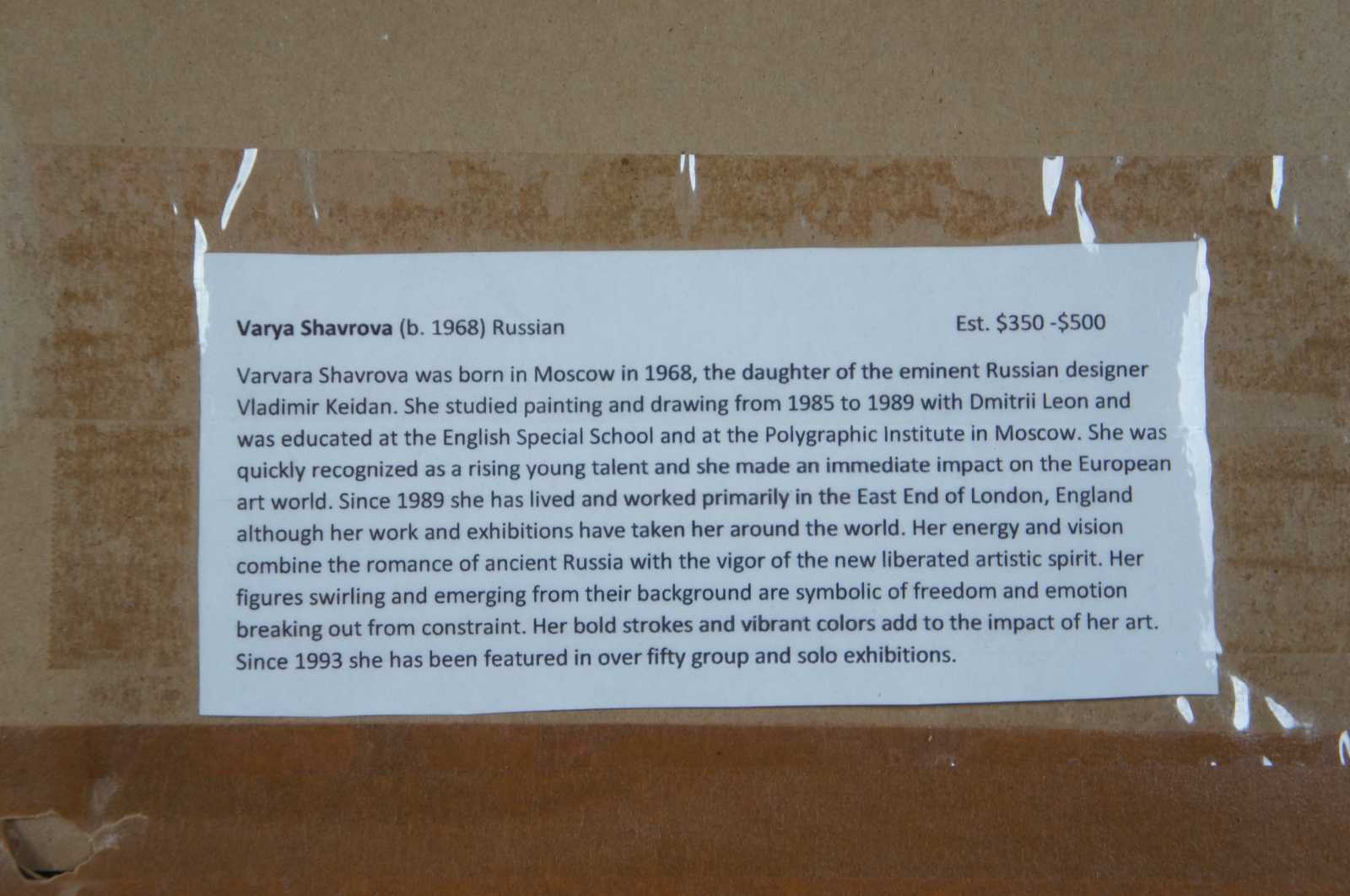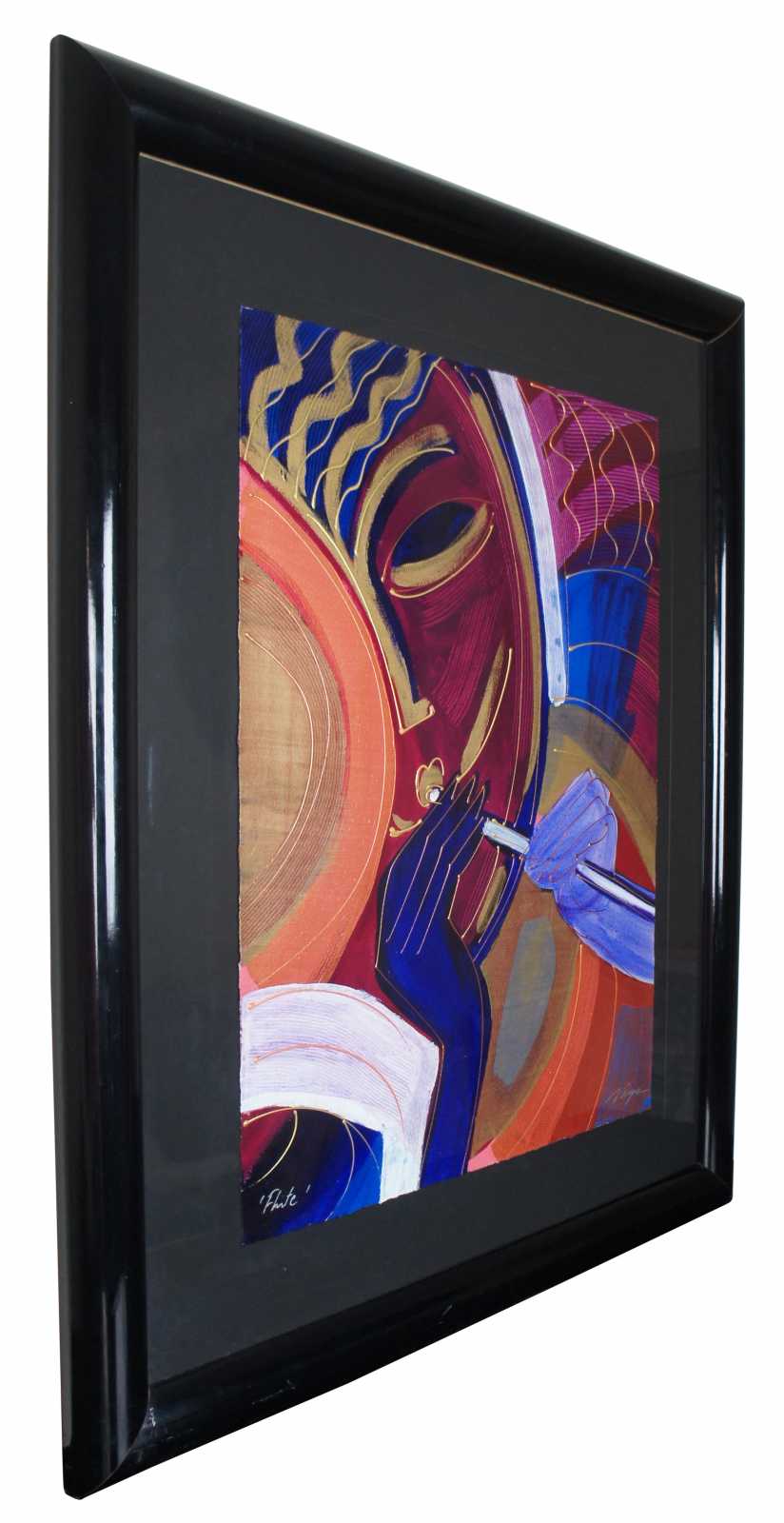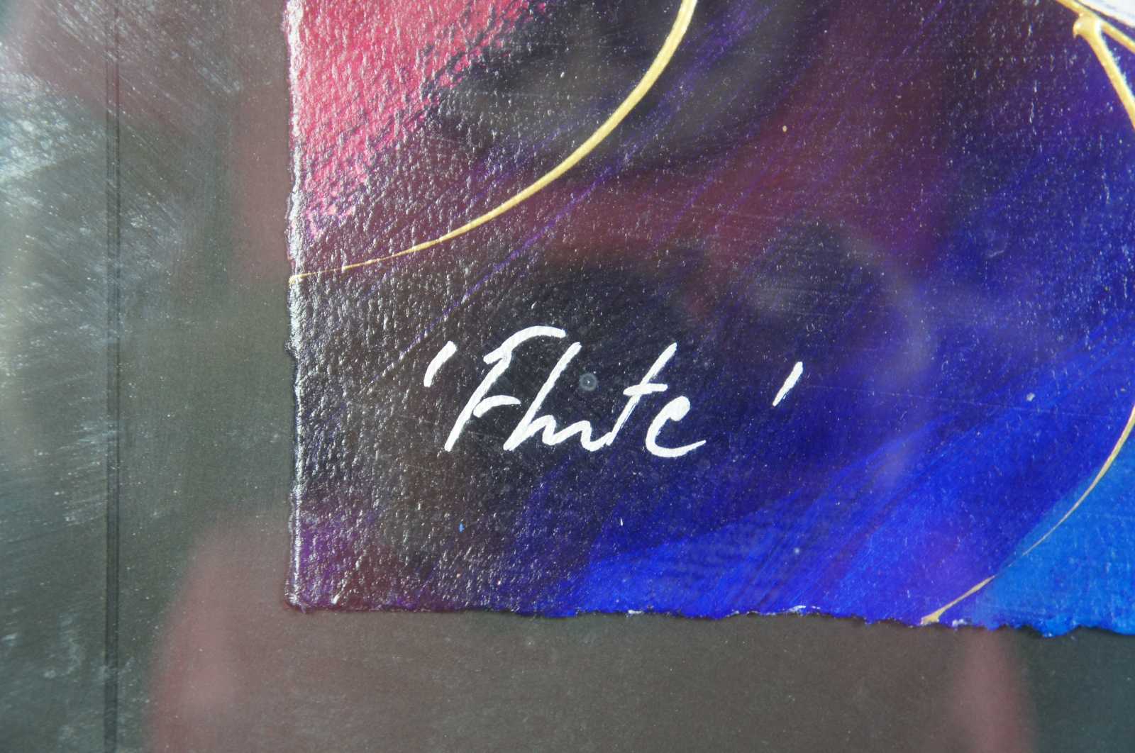 1990’s serigraph and hand coloring painting on paper titled “Flute” by Varvara (Varya) Shavrova. Varvara Shavrova (b. 1968) is a visual artist born in the USSR who lives and works in London and Dublin. Shavrova’s practice is focused on excavating the layers of her family’s history through the process of remembering, recalling, retracing and re-enacting stories. In engaging memory, nostalgia and reflection, Shavrova creates installations that make connections between historic and current narratives, between the archival and the present. Shavrova studied at the Moscow State University of Printing Arts, and received her Masters in Fine Arts from Goldsmiths, University of London. Shavrova’s recent project Inna’s Dream reinterprets the first Soviet amphibious aeroplane designed by her great uncle in 1930s, and includes tufted carpet objects and site-specific drawings installation at Patrick Heide Contemporary Art, London (2019). Mapping Fates, multi-media installation reflects on Shavrova’s family migration, and includes tapestries and sound, shown in Lenin’s apartment in St. Petersburg (2017). Shavrova’s project The Opera portrays the gender fluidity in traditional Peking opera. It received international acclaim and included photography, sound and video projections, and was shown at The Temple Beijing (2016), Momentum Berlin ( 2016), the Gallery of Photography Ireland (2014), the Venice Biennale of Architecture (2014) and at Espacio Cultural El Tanque in Santa Cruz de Tenerife (2011). Shavrova received Culture Ireland awards for her solo exhibitions in Beijing, Shanghai and Berlin, British Council award for individual artists, and Ballinglen Arts Foundation Fellowship awards. Shavrova curated international visual arts projects, including The Sea is Limit exhibition at York Art Gallery (2018) and at Virginia Commonwealth University Arts Qatar Gallery in Doha (2019), examining migration, borders and refugee crisis, Giving Voice exhibition of Mary Robinson’s presidential archive in Ballina library in County Mayo, and Map Games: Dynamics of Change, international art and architecture project, at Today Art Museum Beijing, Birmingham Museums and Art Gallery, CAOS Centre for Contemporary Arts, Terni, Italy (2008-2010). Shavrova’s works are included in the collections of the Office of Public Works, the Department of Foreign Affairs and Trade, the Momentum Collection Berlin, the Ballinglen Museum of Contemporary Art, Minsheng Art Museum Beijing, Moscow Museum of Modern Art, and the Museum of the History of St. Petersburg.