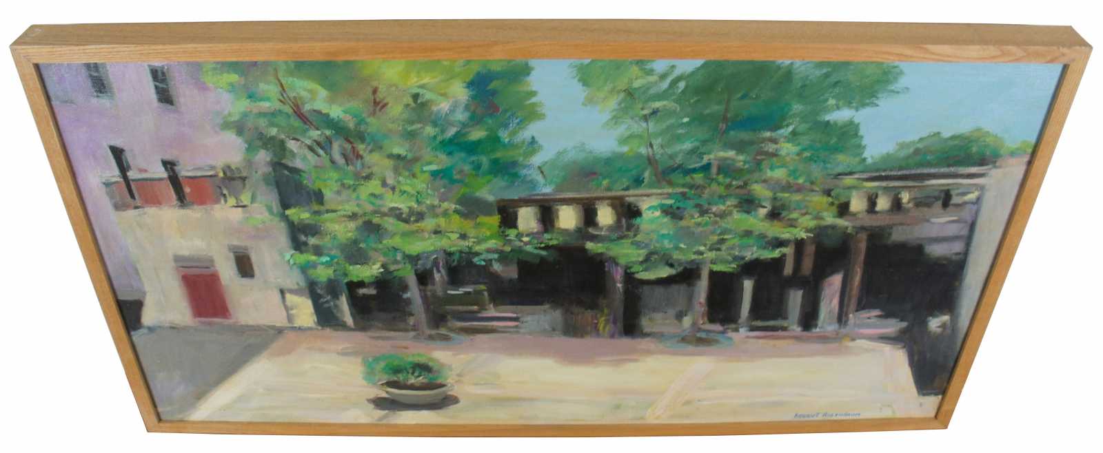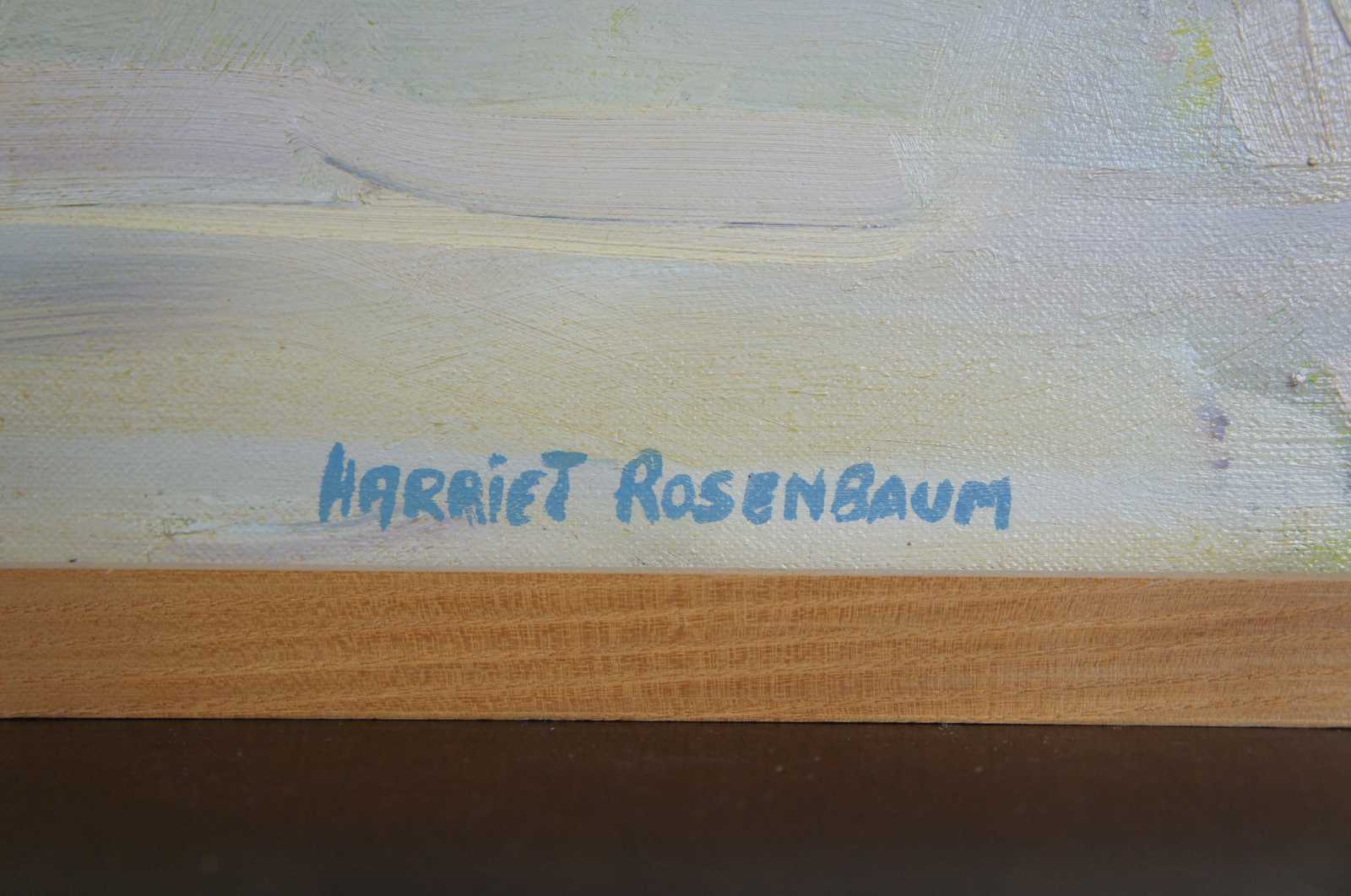 Impressionist oil on canvas painting of a city square by Harriet Rosenbaum. Harriet Rosenbaum has been an active participant in the art community of Washington, DC and the surrounding area for more than 30 years. She studied Fine Art at the Corcoran School of Art, American University, and George Washington University in Washington. A painter and printmaker, she is particularly known for images of the landscape. She currently resides in Chevy Chase, Maryland, and shows her work at the Touchstone Gallery in Washington, D.C.