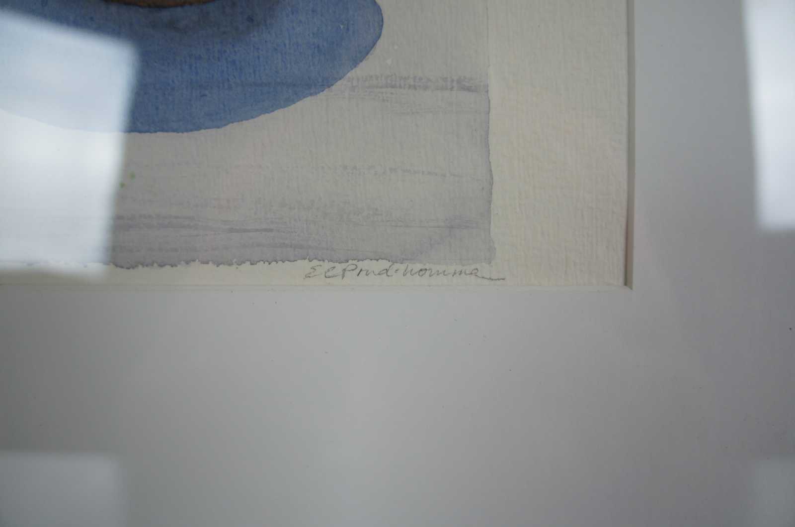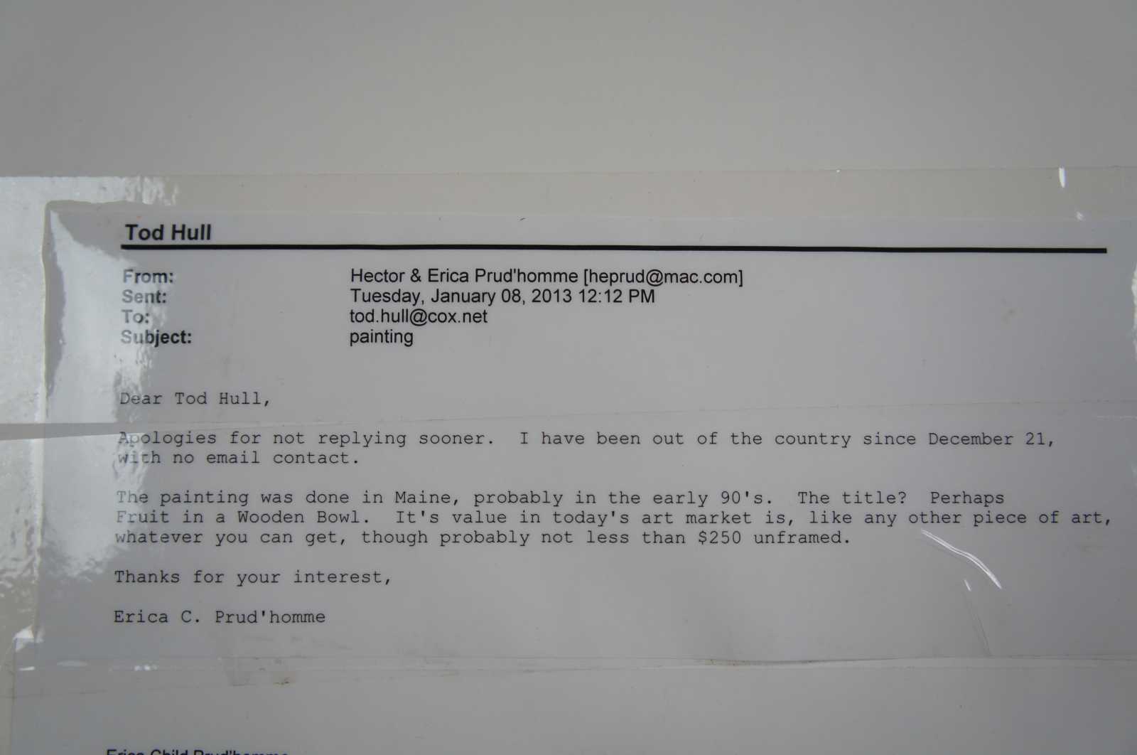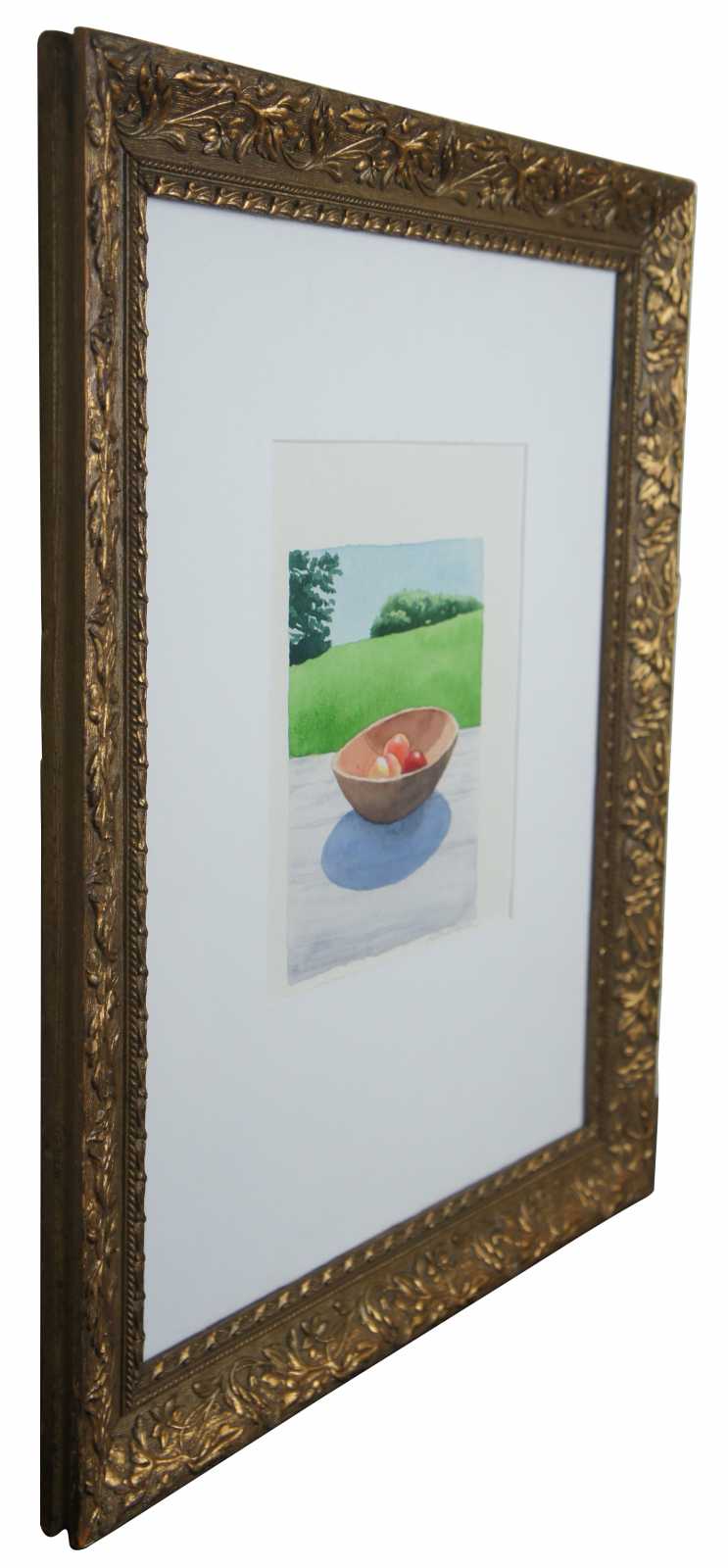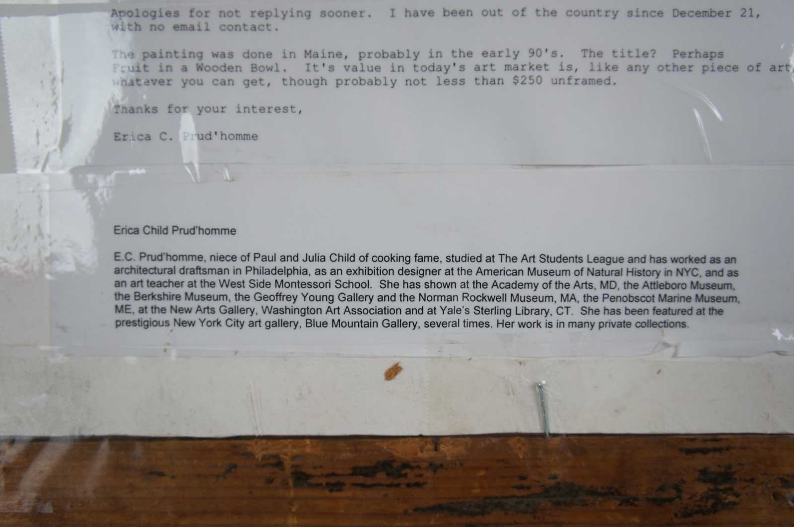 1990’s Erica Child Prud’homme watercolor still life painting “Fruit in a Wooden Bowl.”, painted in Maine. Erica Prud’homme is captivated by the symmetry and grace of natural forms, by nature’s repetitive patterns such as wood grains, fish scales and waves, by seasonal changes and by the relationship of human bodies to these natural forms. The human circulatory system suggests a river’s watershed, while bodies and faces duplicate mountain ranges or clouds. Human limbs echo the limbs of trees. She explains, “We human beings are an integral part of nature, repeating the curves and planes we see around us. I aim to celebrate this connection to our environment.”