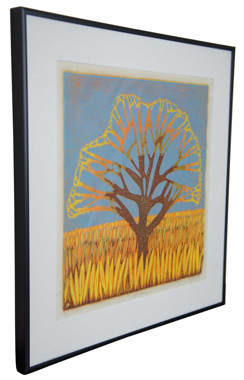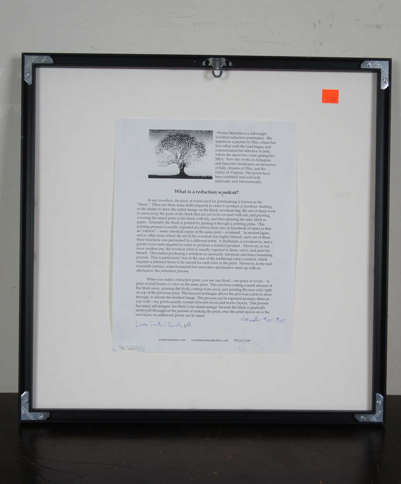 Pencil signed and numbered reduction woodcut print by Westen Muntain, number 2/6 featuring a yellow and orange tree alone in a wheat field in front of a soft blue sky. Westen Muntain runs the printmaking and ceramics workshops at Arlington’s Lee Arts Center. She’s also a prolific artist, known for small- and large-scale prints depicting nature in all its forms—blue mornings on undisturbed shorelines, verdant expanses of grassy fields, close-up tangles of wildflowers. Her current work combines intaglio printmaking—an art she humbly describes as “glorified stamp-making”—with painting. She starts each image with an acrylic “wash” for color and texture, then prints on top of that surface. In the intaglio process, printing plates are made of copper or zinc sheets that have been etched with acid to create a design. Muntain, who lives in Falls Church, often relies on photographs for reference or derives inspiration from the landscapes around her. “Right now,” she says, “that’s the beach.” Printmaking can be a bit unpredictable in that the design that’s etched into the plate is a mirror image of what ends up on paper—but that just makes the medium more exciting, she says: “With printmaking, you never quite know exactly what you’re going to get. You end up with the reverse of the image you’ve been working on.”