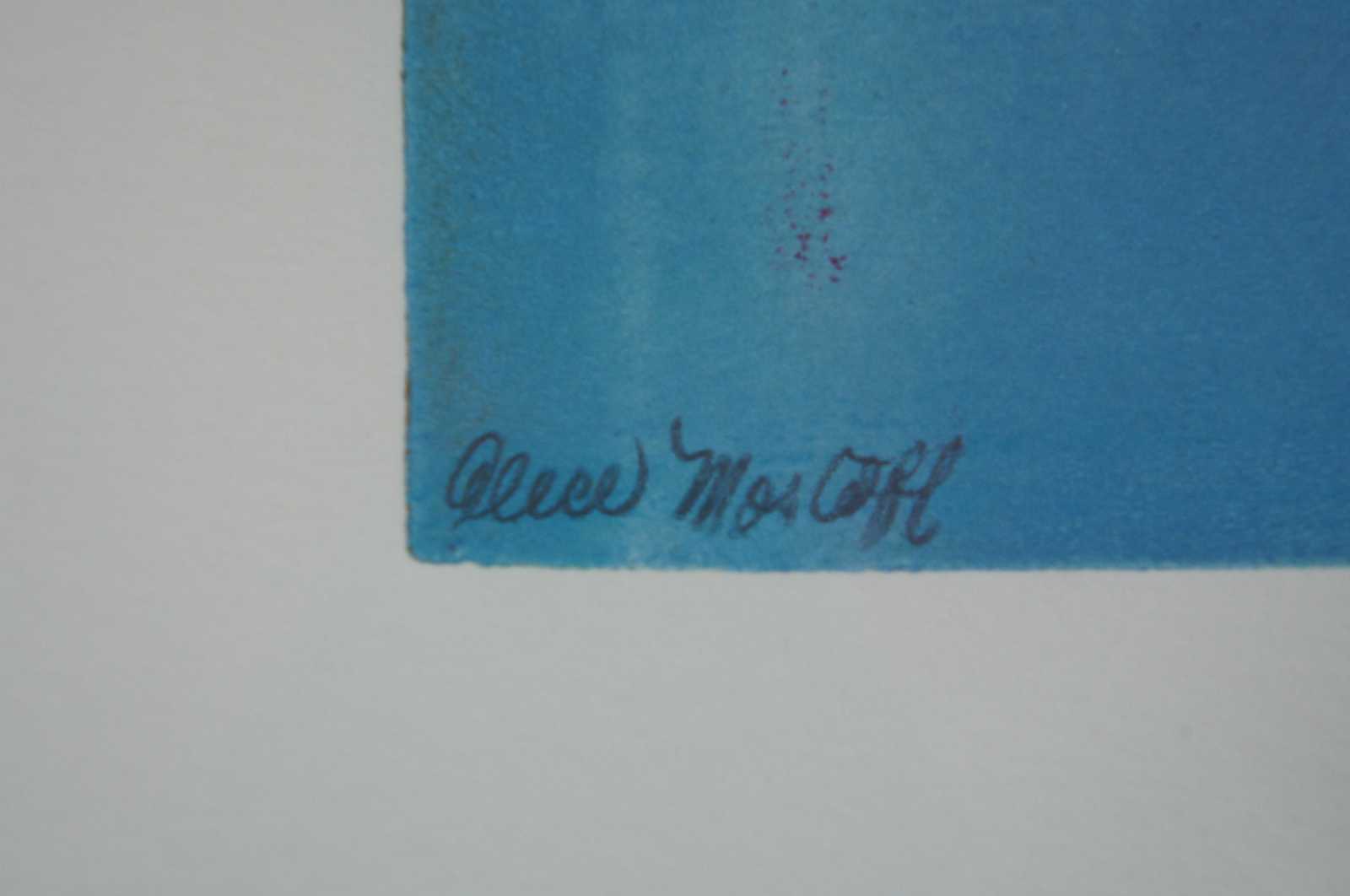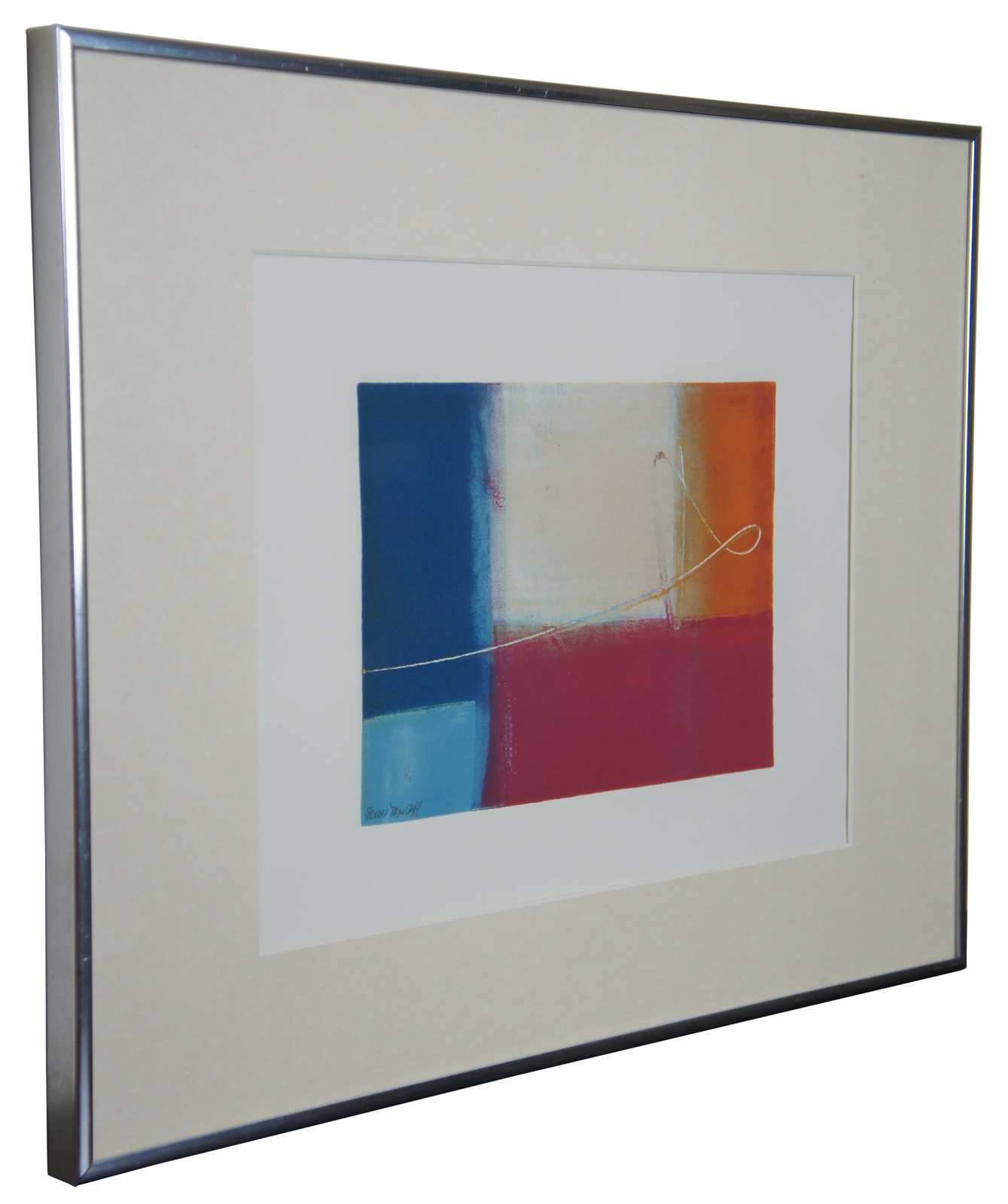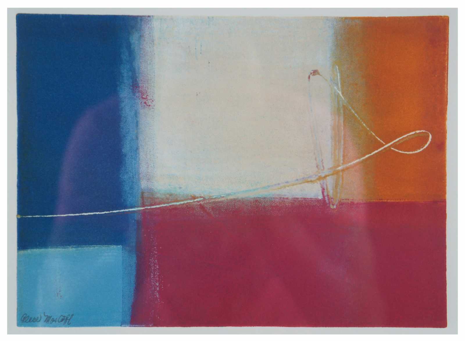Original abstract painting by Alice Mostoff, featuring blocks of blue, white, pink and orange with a swirling line across the middle. Alice Mostoff's color filled images are vigorous, energetic, and gestural landscapes and abstractions. These explosive works convey a sense of rhythm and spontaneity. Her paintings, monotypes and collages are found in private and corporate collections throughout the world, as well as the National Museum of American History, Washington D.C. and the Arts and Embassies Program. The William and Mary Review has published her work. She has recently received awards for her landscape paintings at the Elliott Museum in Stuart, Florida.
