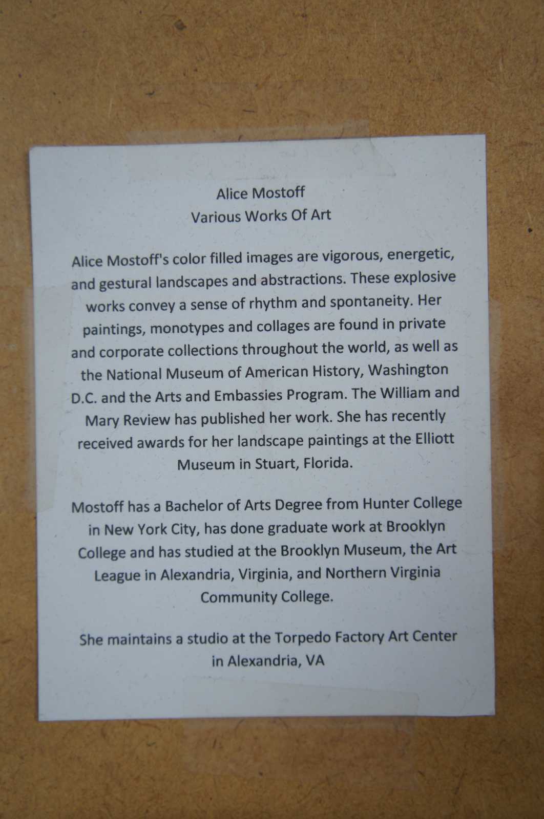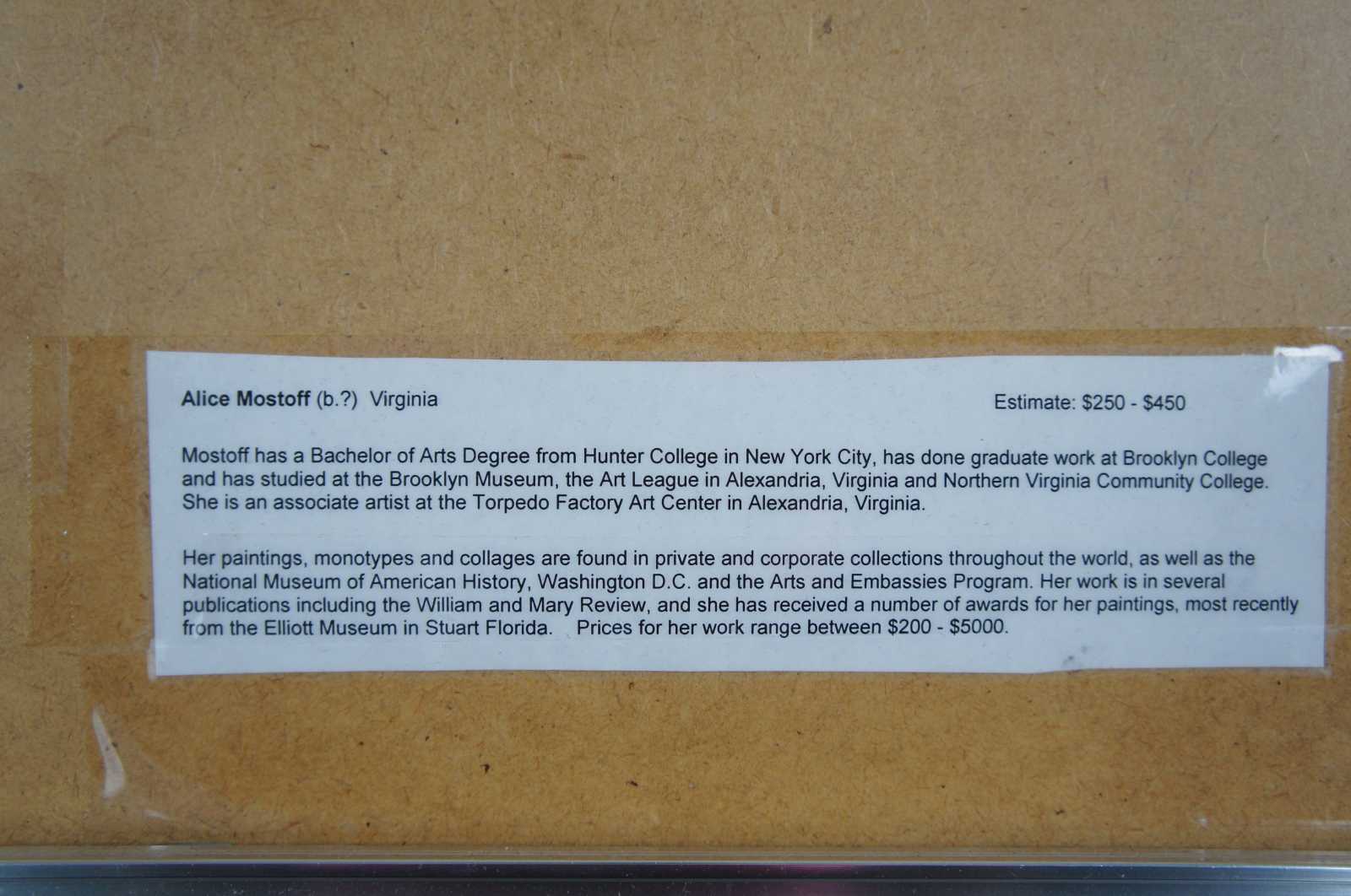 Mostoff has a Bachelor of Arts Degree from Hunter College in New York City, has done graduate work at Brooklyn College and has studied at the Brooklyn Museum, the Art League in Alexandria, Virginia, and Northern Virginia Community College. She maintains a studio at the Torpedo Factory Art Center in Alexandria, VA.