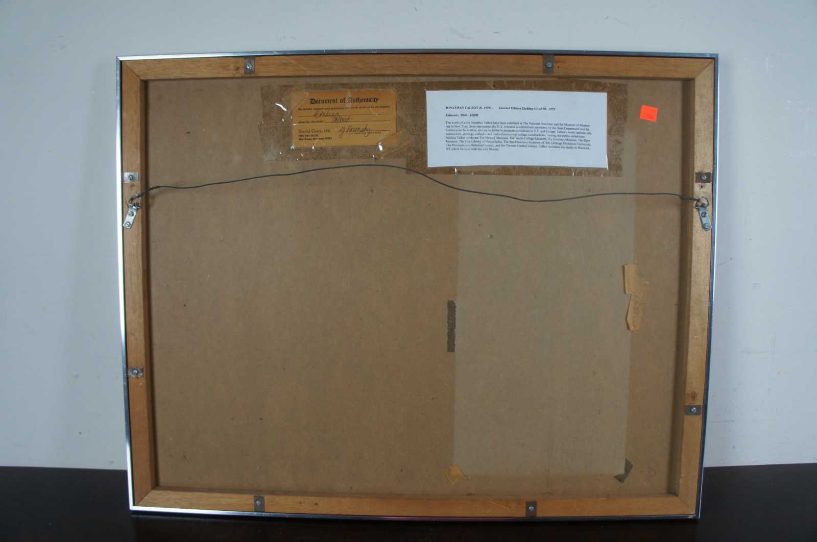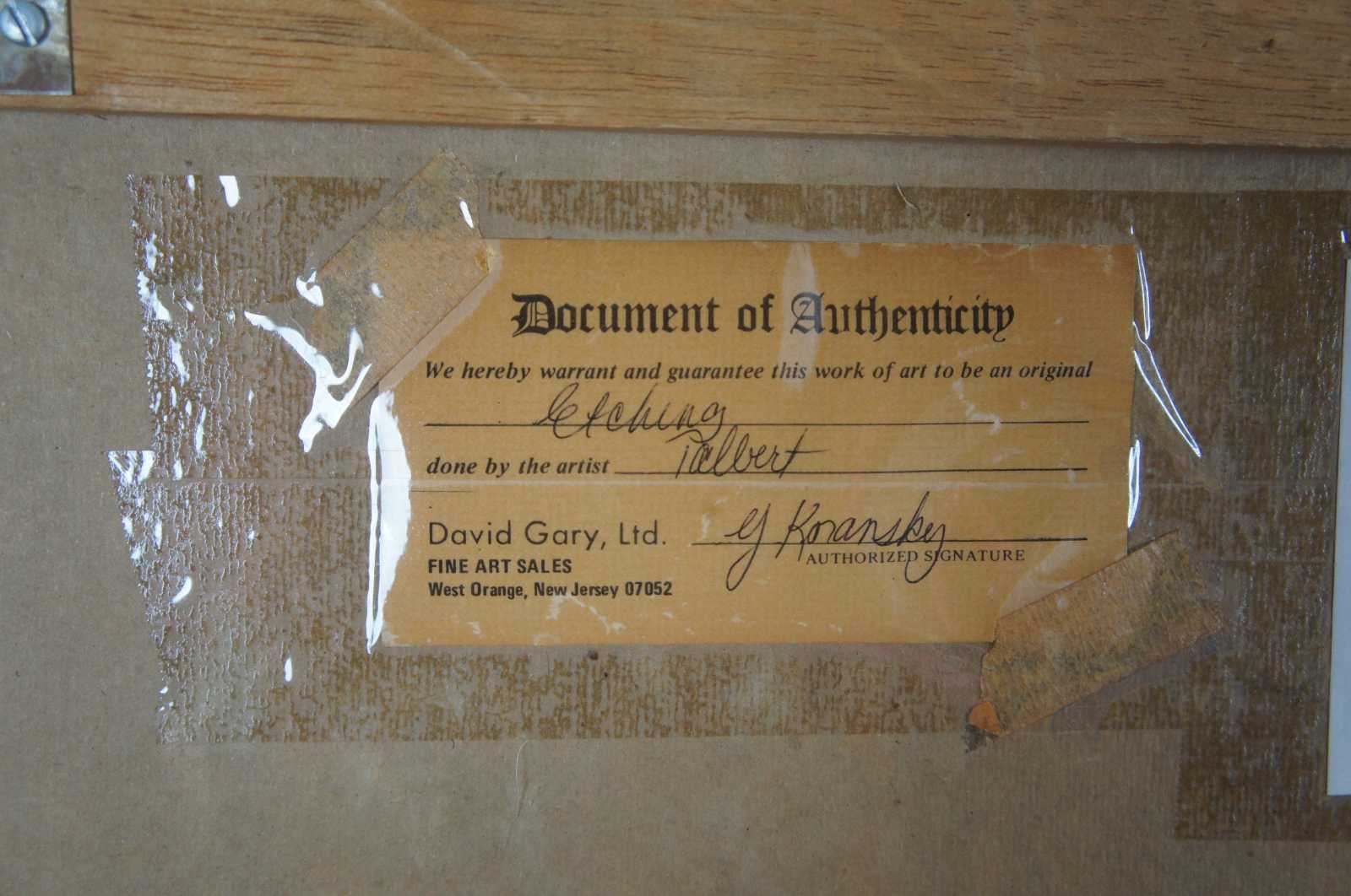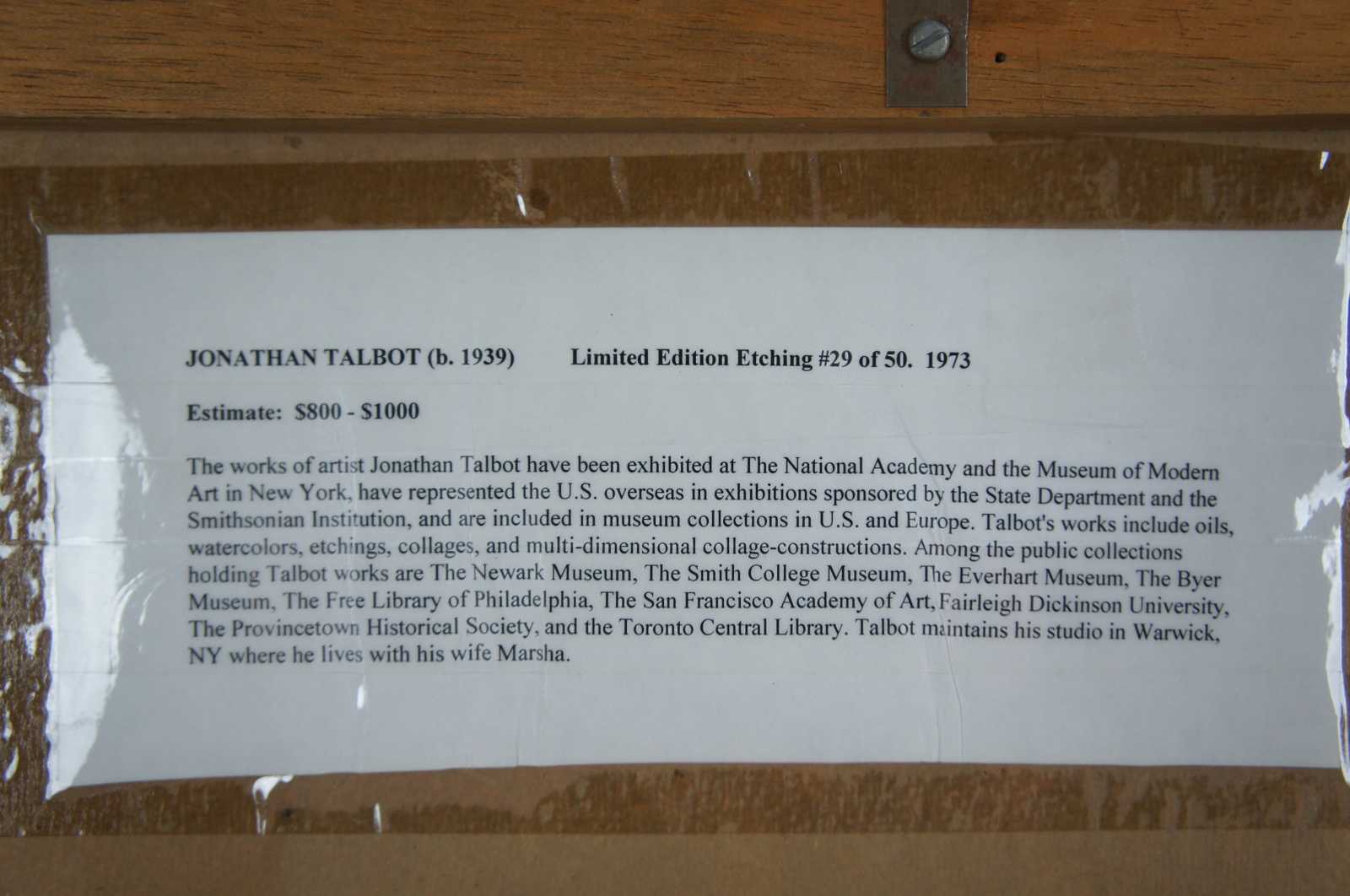 Vintage 1973 pencil signed and numbered limited edition etching by Jonathan Talbot, number 29/50 with document of authenticity. BIO: Jonathan Talbot was born in New York City on November 14, 1939, and has established his primary studio in Warwick, New York, although he has also worked in Spain, France, and England. He lives with his wife Marsha and a daughter and son.