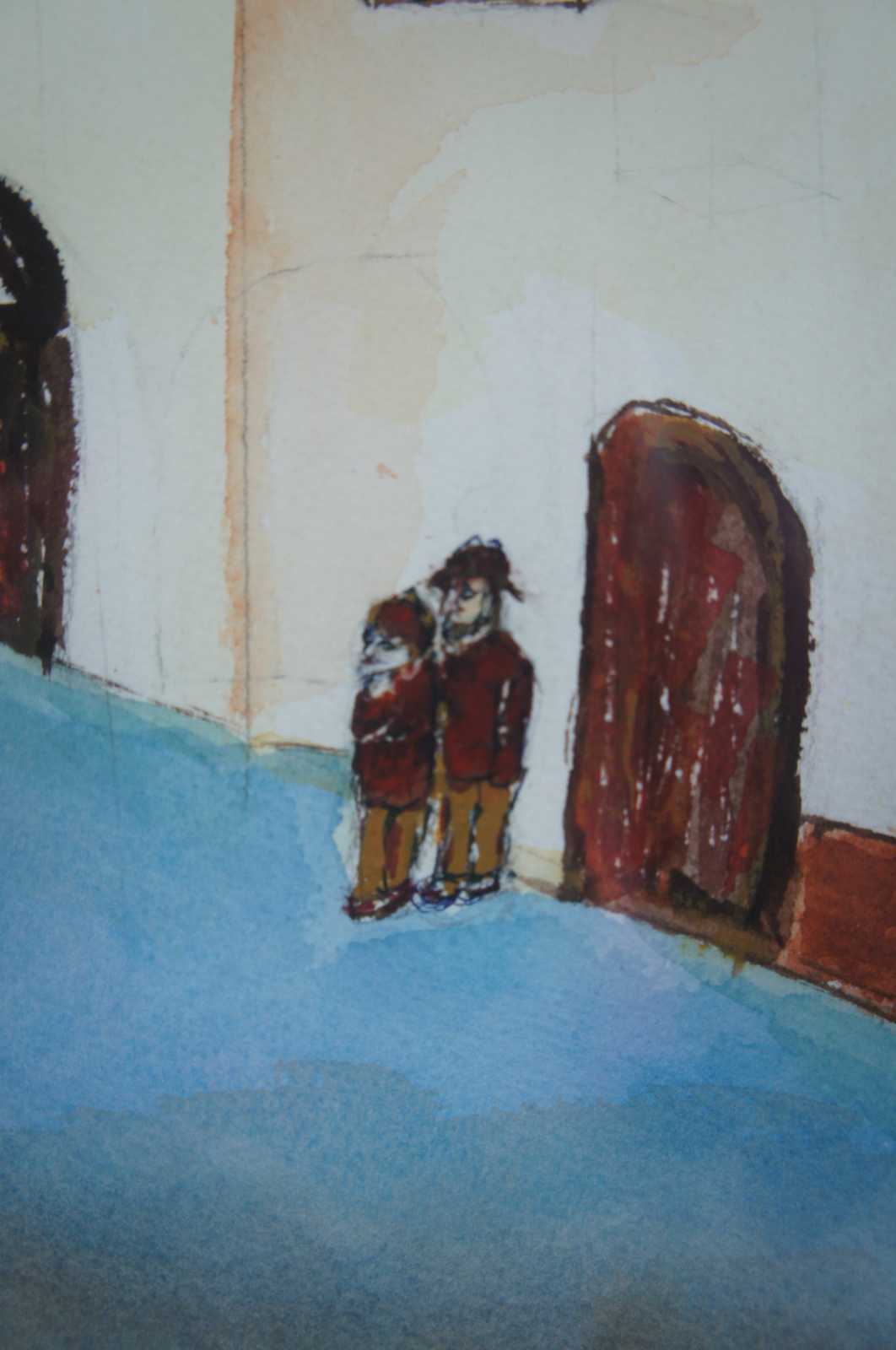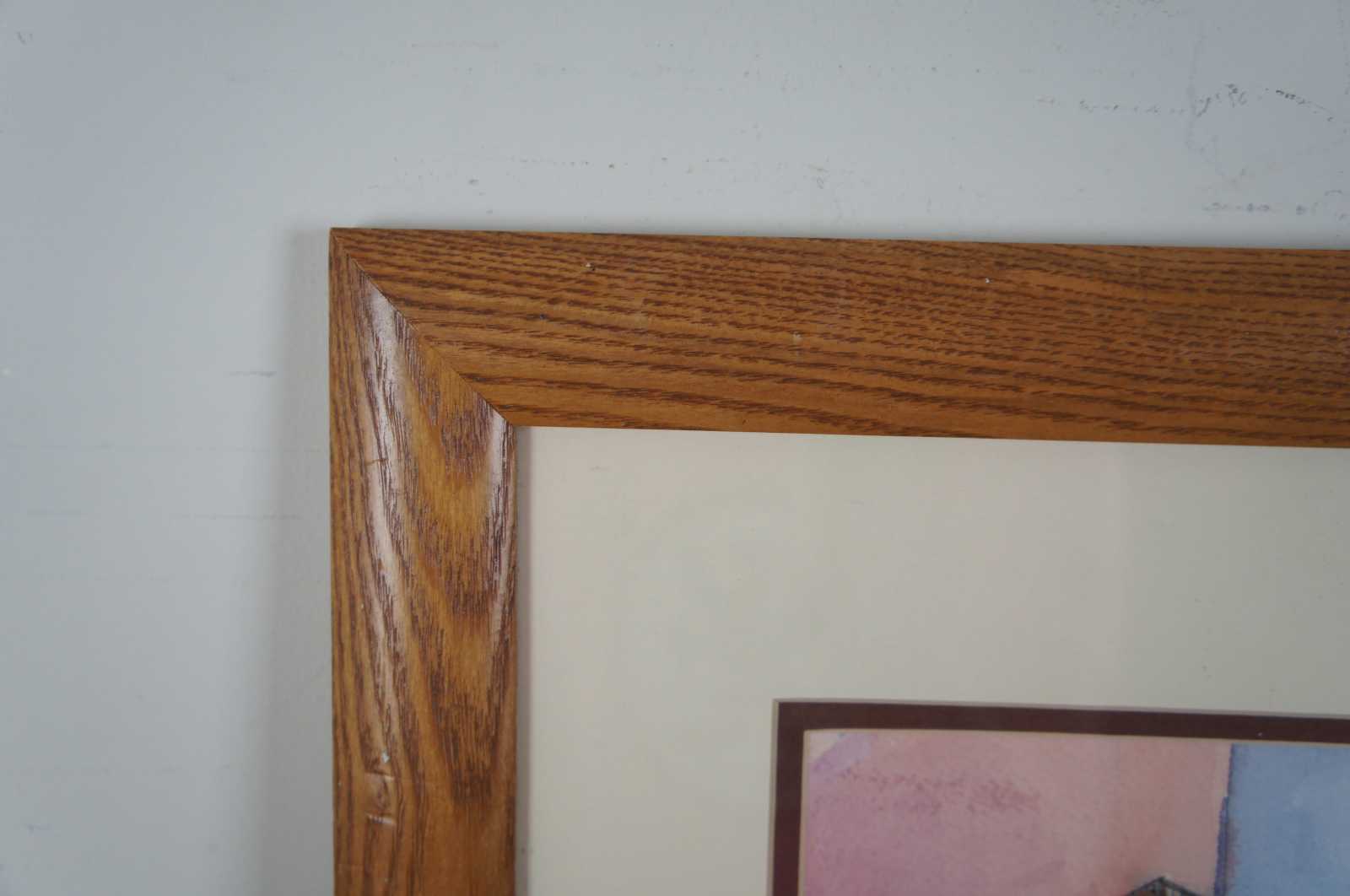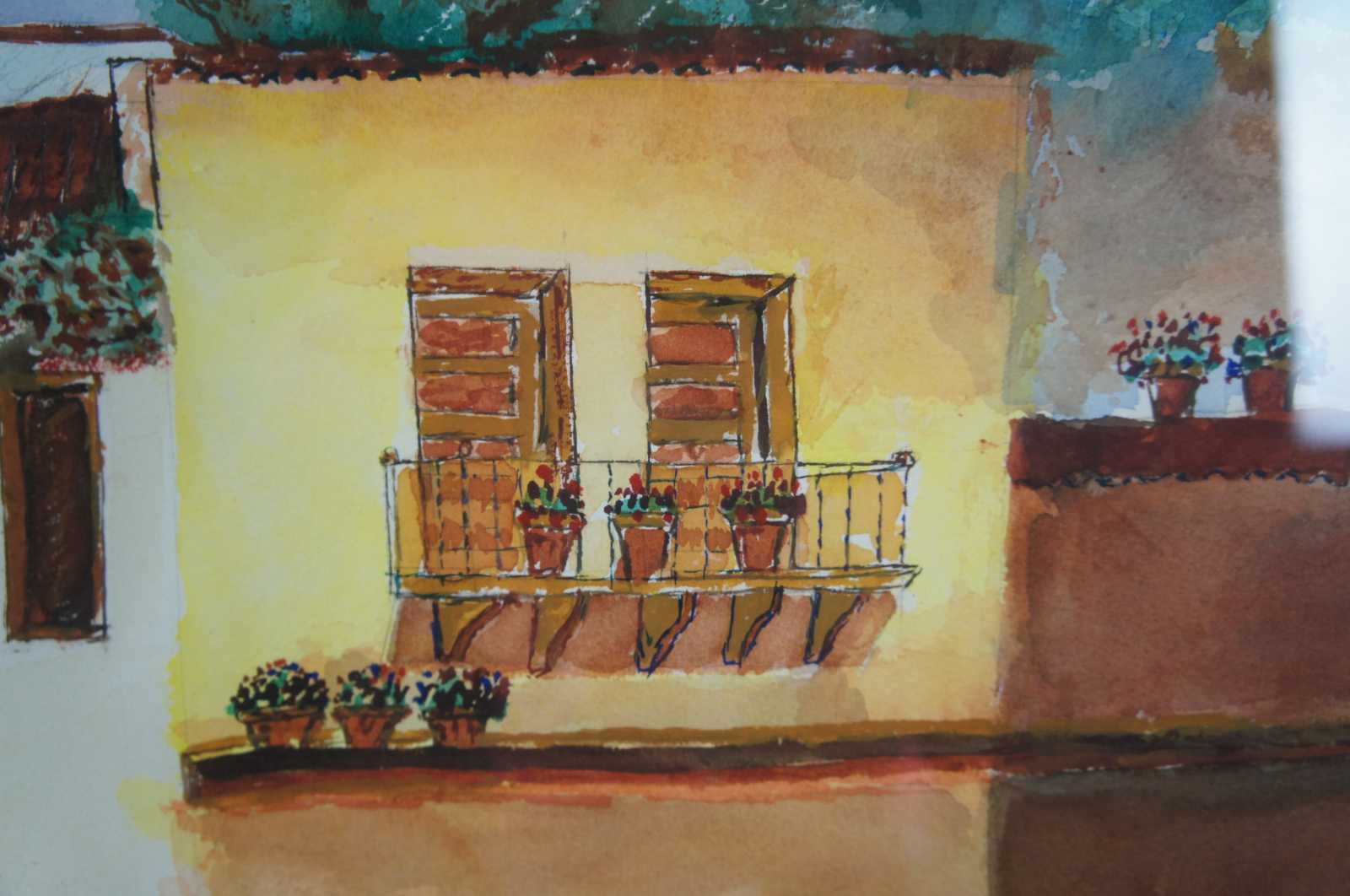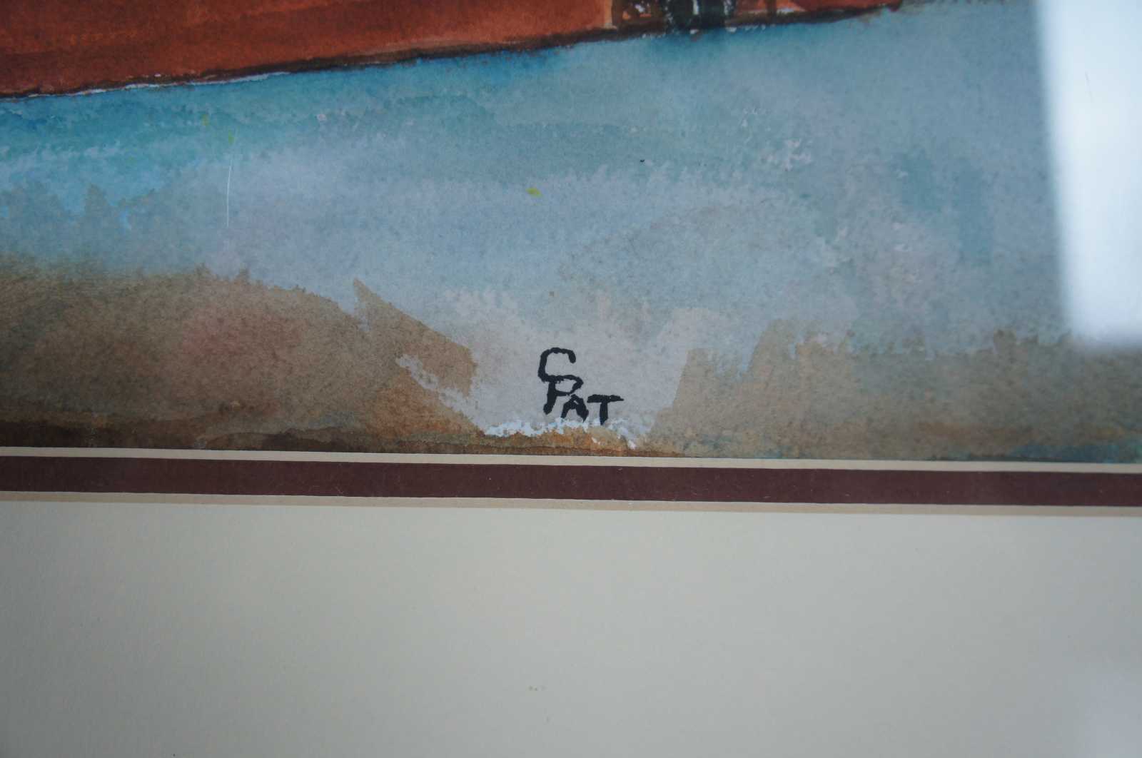 Original watercolor painting featuring a Mediterranean style city street of buildings with red tile roofs and pots of flowers with two figures by a door; signed Cpat at the lower edge. Oak frame.