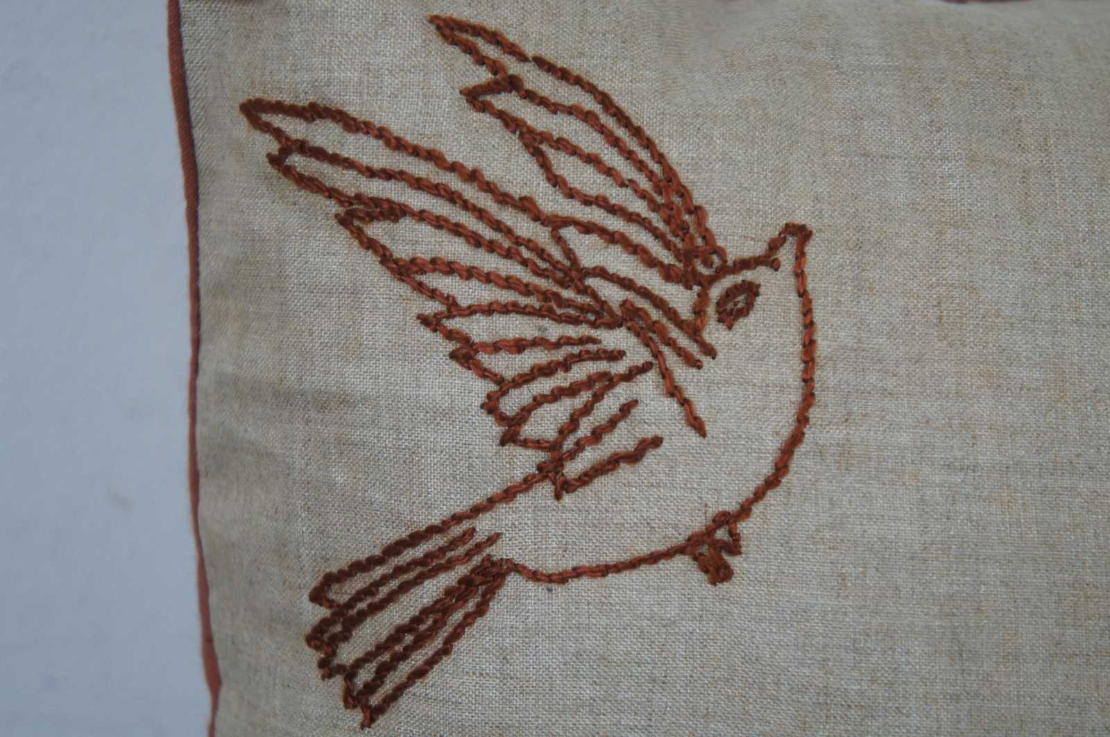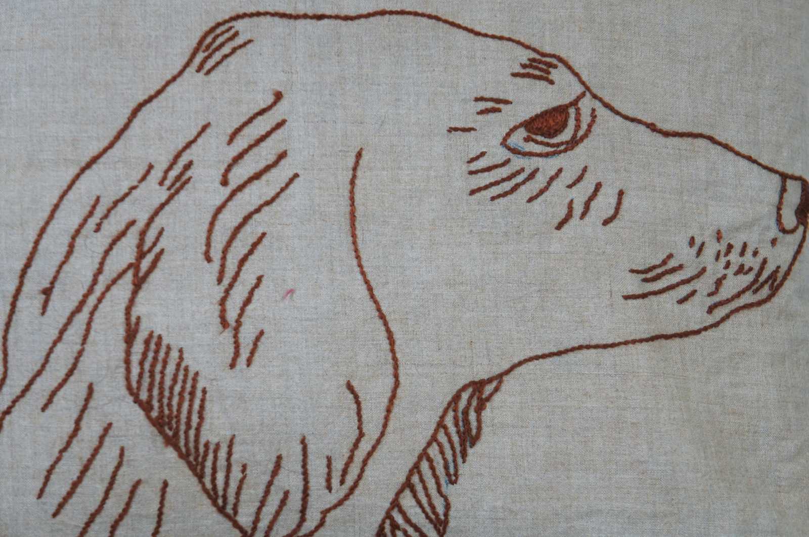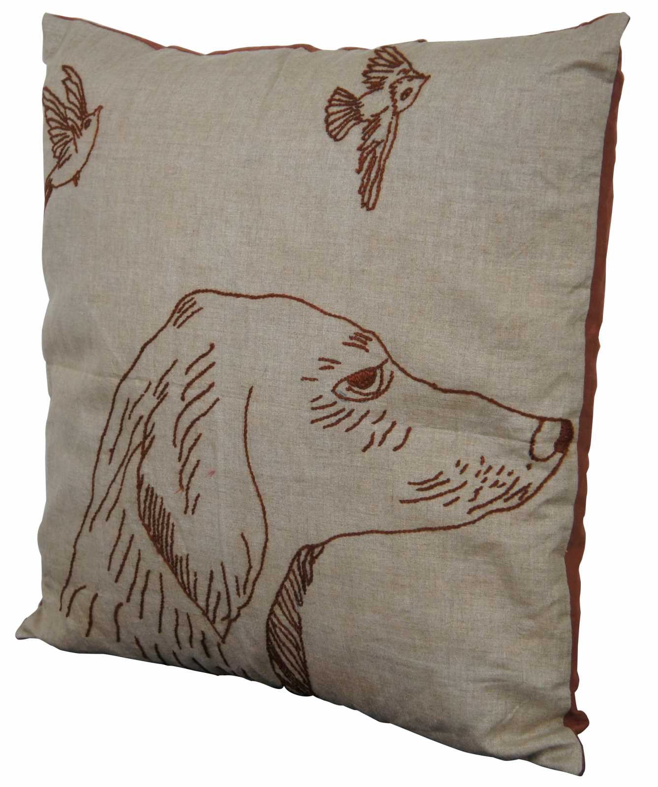 Small square fiber filled throw pillow and brown cover with a hand embroidered dog and two birds. Traces of the original sketched design are visible under the embroidered lines.