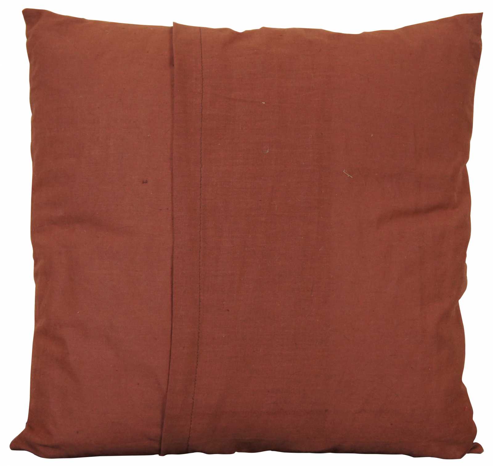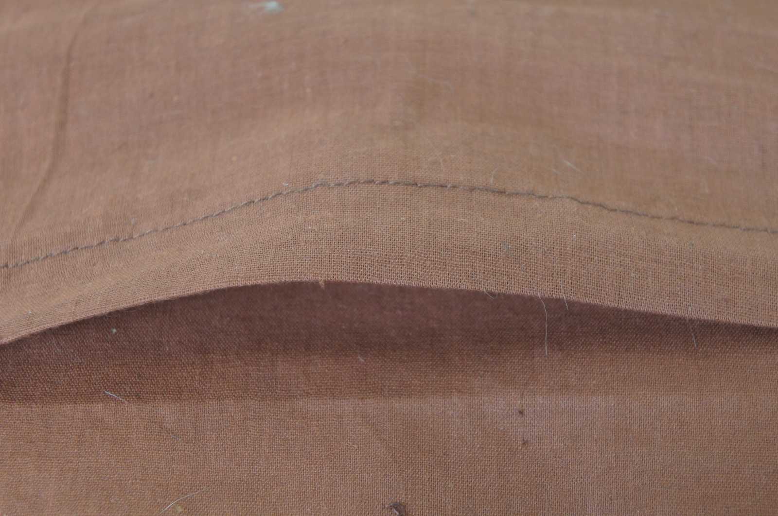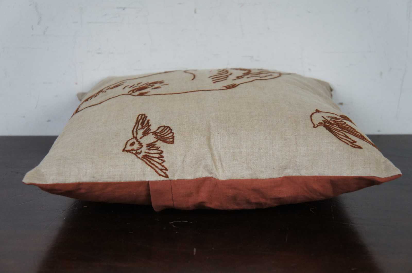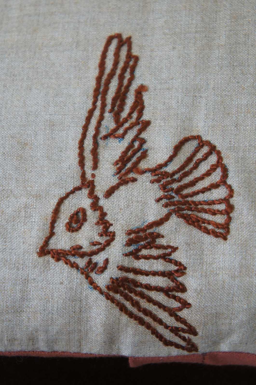 Small square fiber filled throw pillow and brown cover with a hand embroidered dog and two birds. Traces of the original sketched design are visible under the embroidered lines.