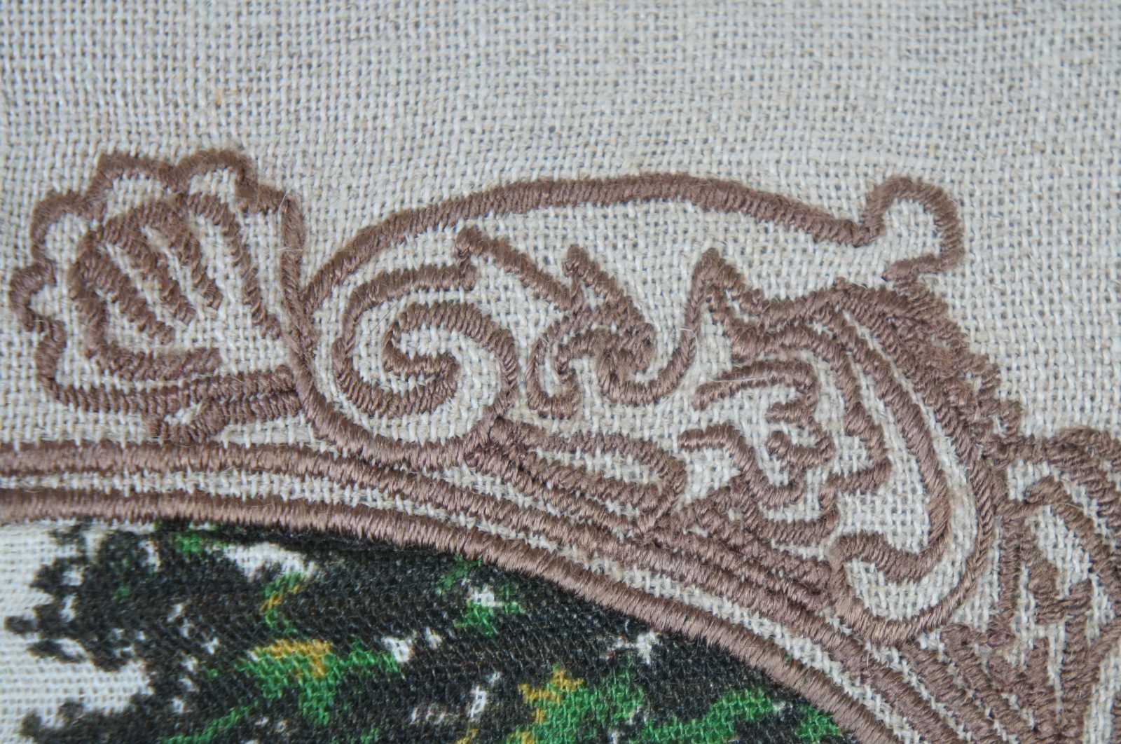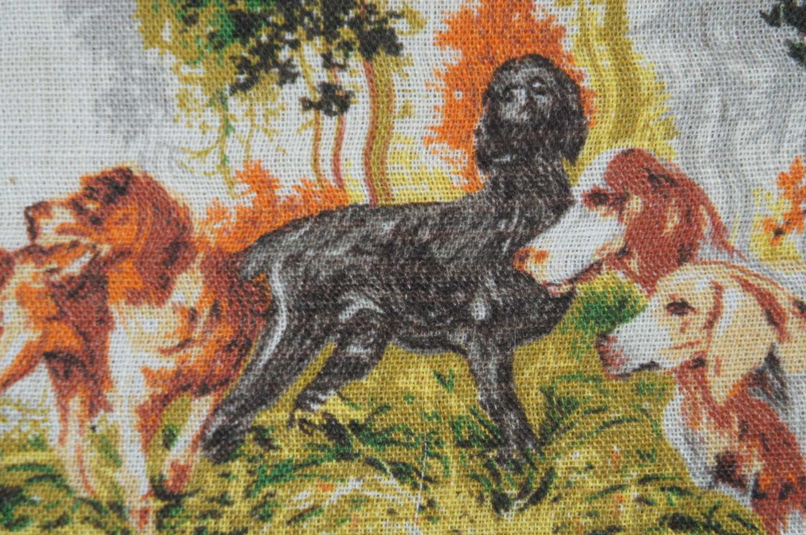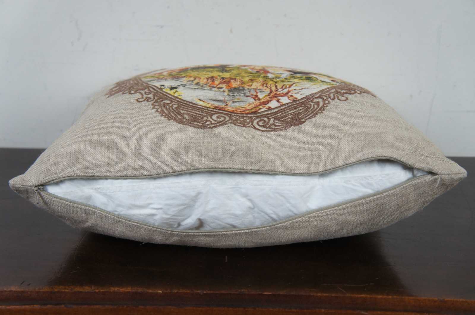 Linen down filled throw pillow by Villa featuring a printed hunting dog scene surrounded by an embroidered frame.