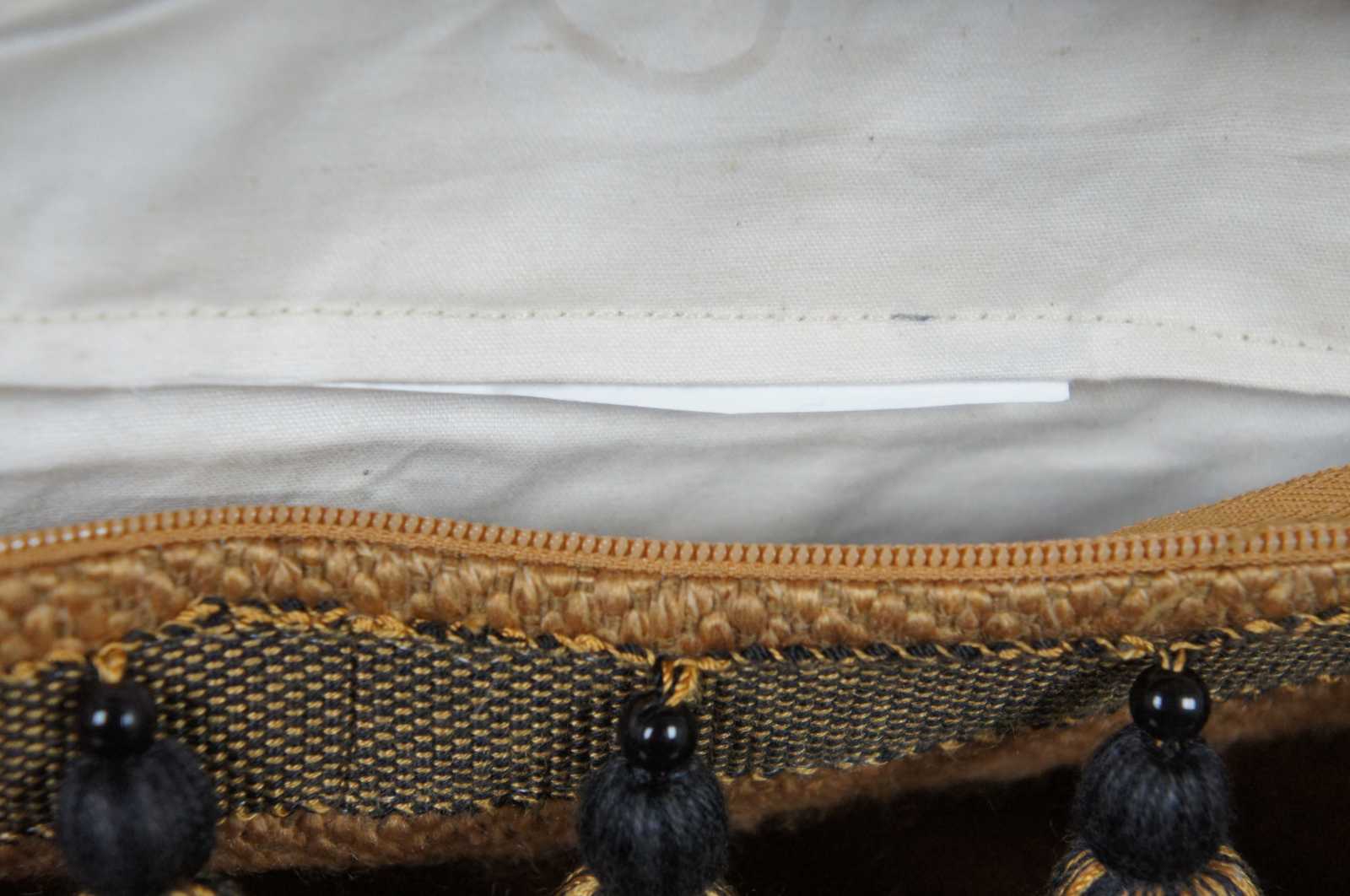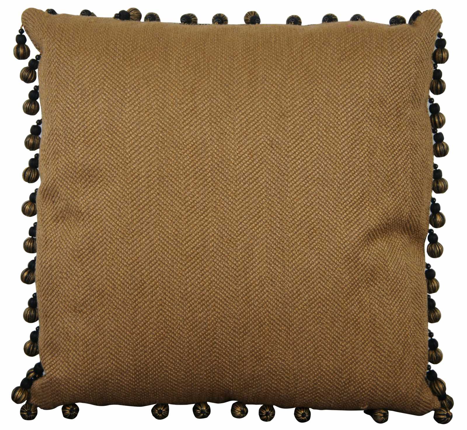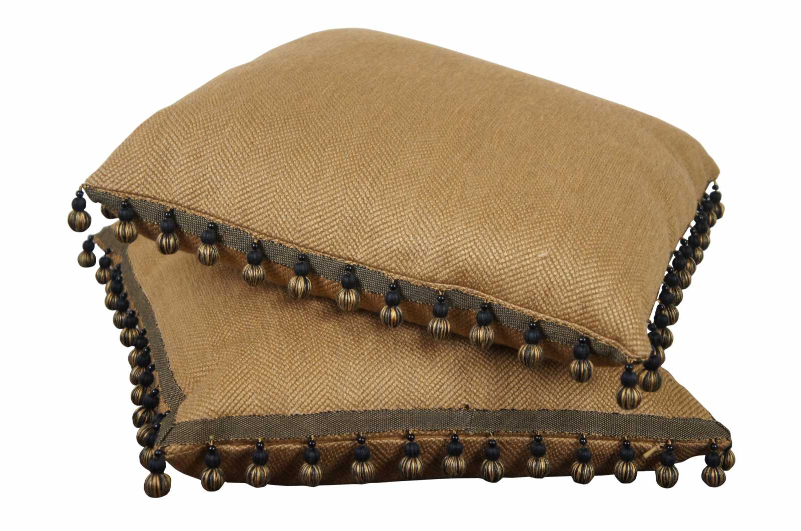 Two brown down filled throw pillows with brown herringbone textured covers bordered with brown and black ball tassels.