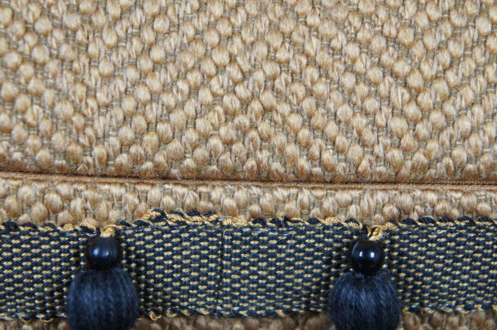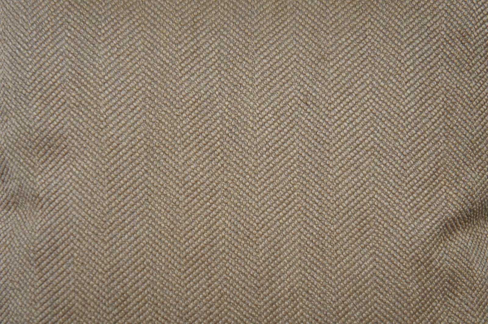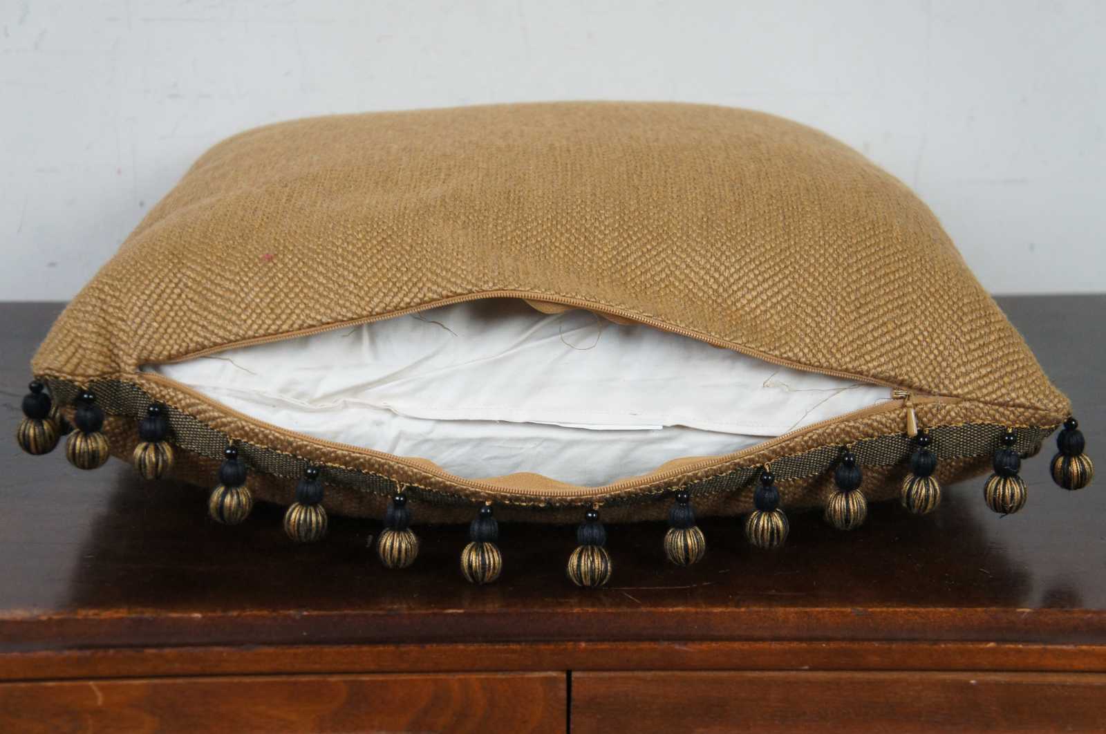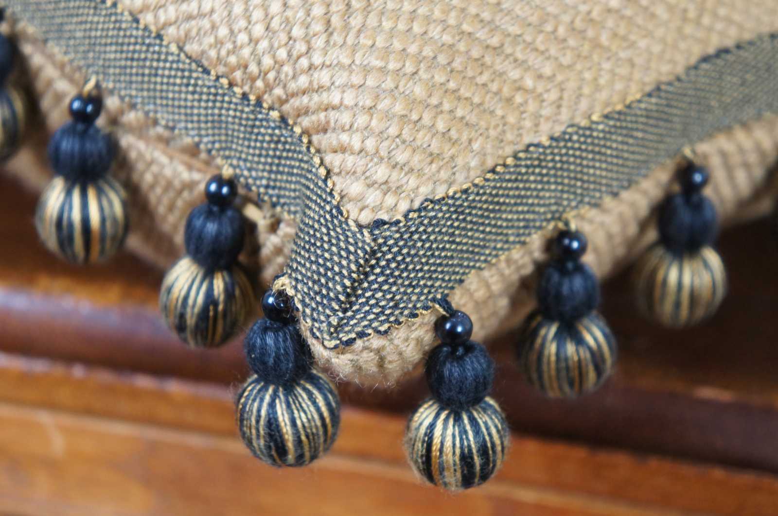 Two brown down filled throw pillows with brown herringbone textured covers bordered with brown and black ball tassels.