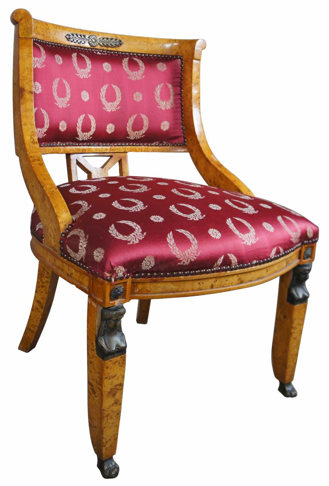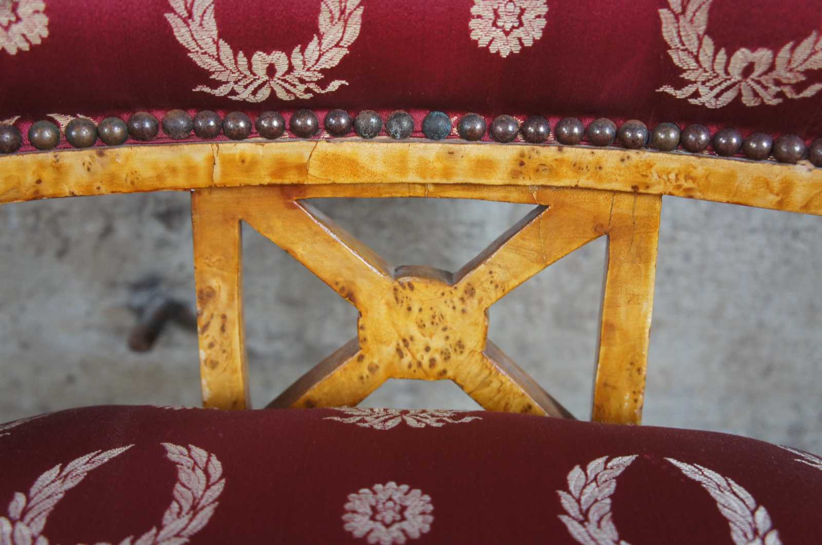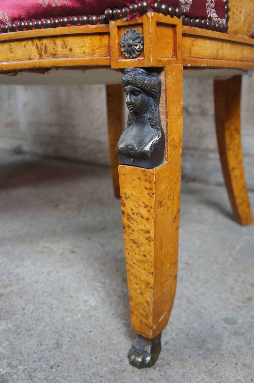 Monumental early 20th century parlor set. A neoclassical and egyptian revival inspired deisgn. Features a curved rail with unique X back between contoured arms leading to regal striped upholstery. The chairs are supported by square tapered front legs with cast bronze caryatid mounts leading to claw feet and rear flared sabre legs.