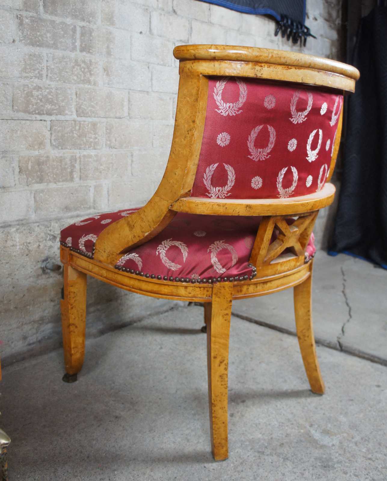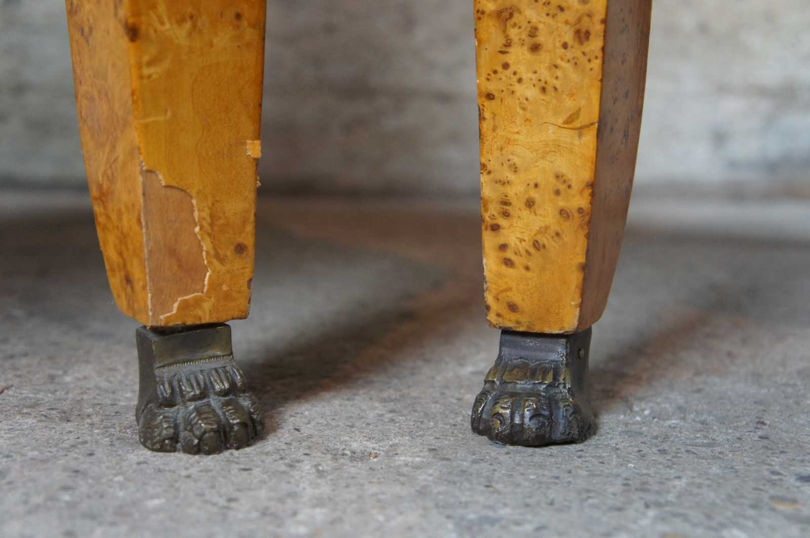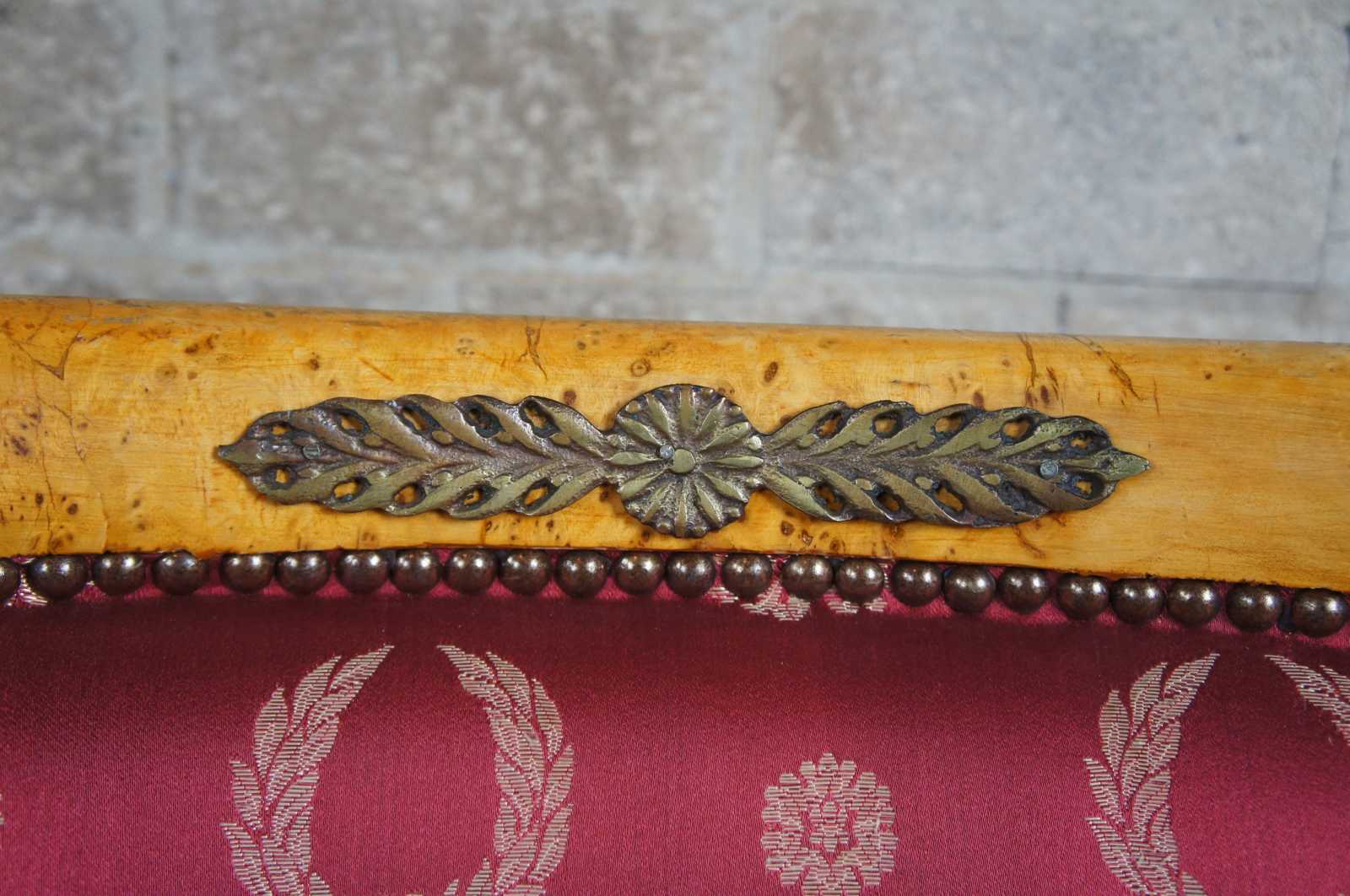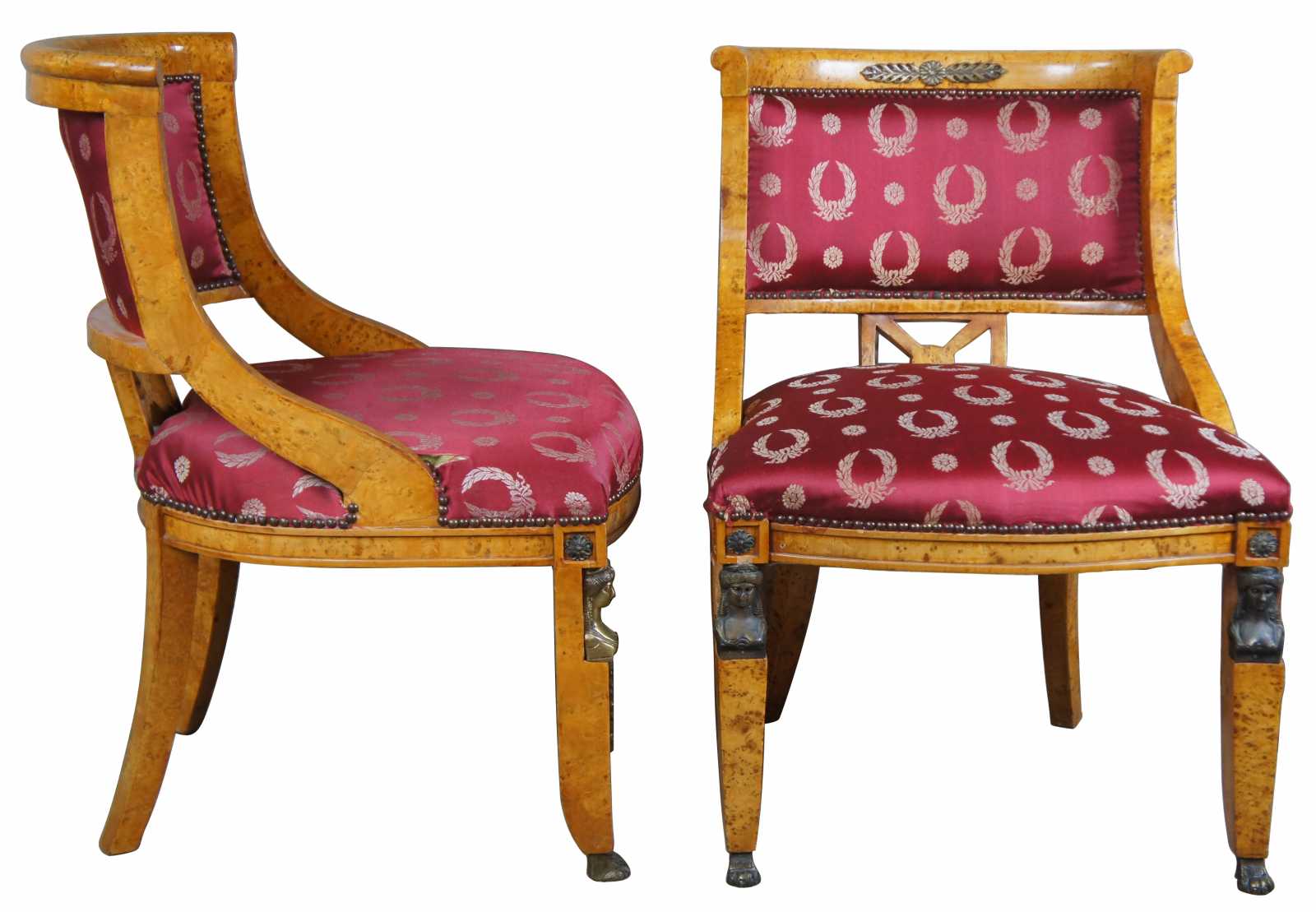 Monumental early 20th century parlor set. A neoclassical and egyptian revival inspired deisgn. Features a curved rail with unique X back between contoured arms leading to regal striped upholstery. The chairs are supported by square tapered front legs with cast bronze caryatid mounts leading to claw feet and rear flared sabre legs.