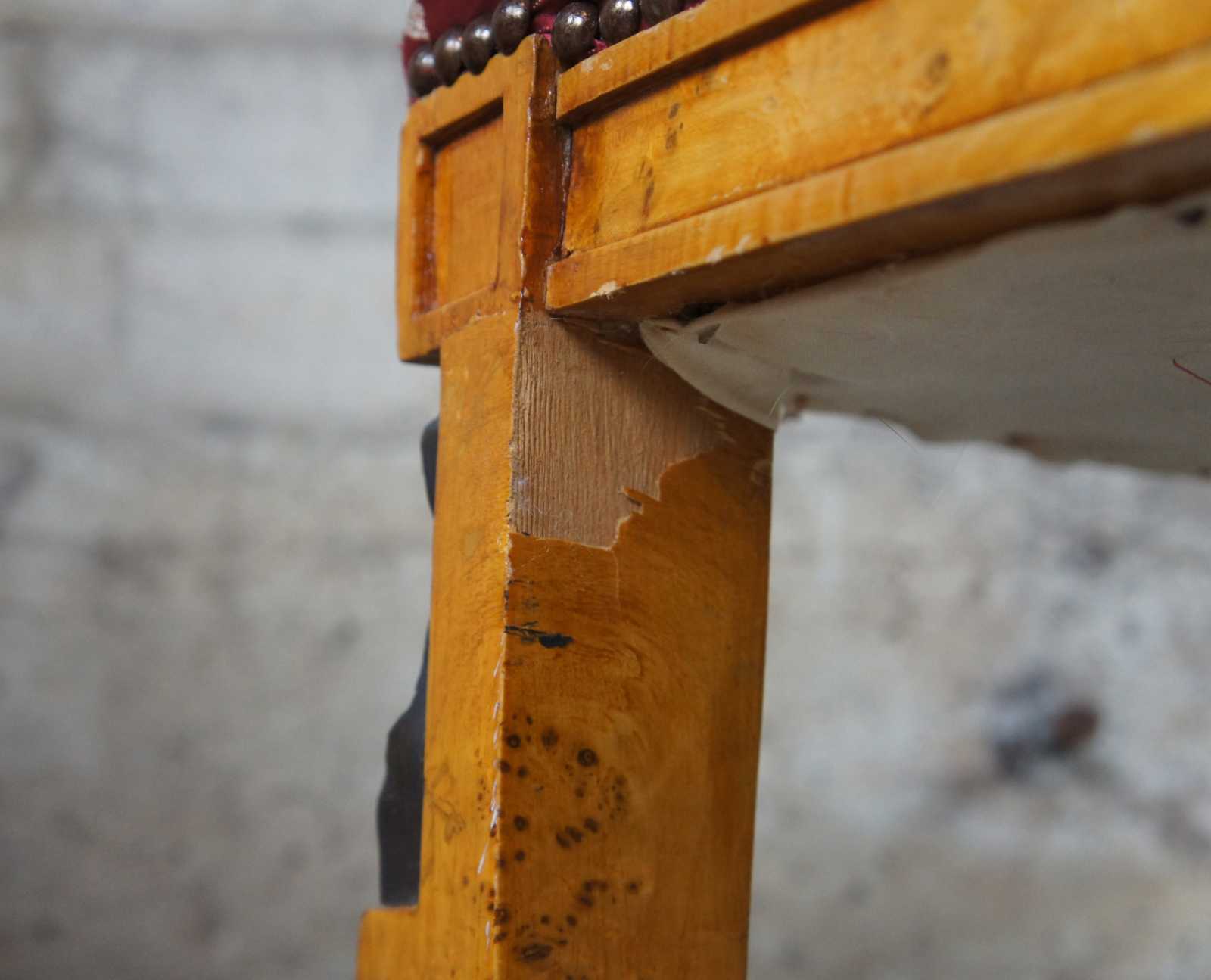 good antique condition, wear commensurate with age; some veneer loss, fraying to fabric, distressing
