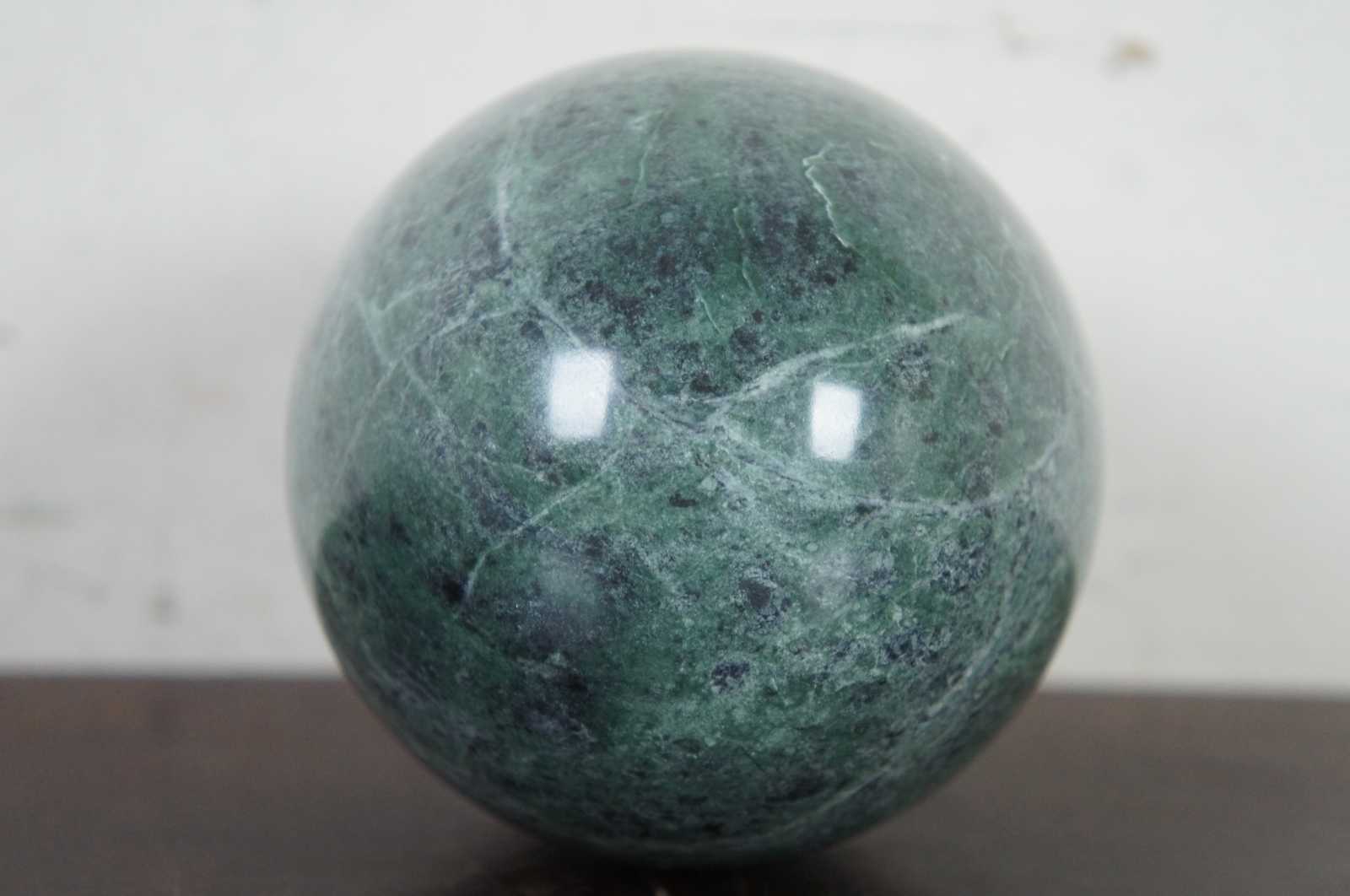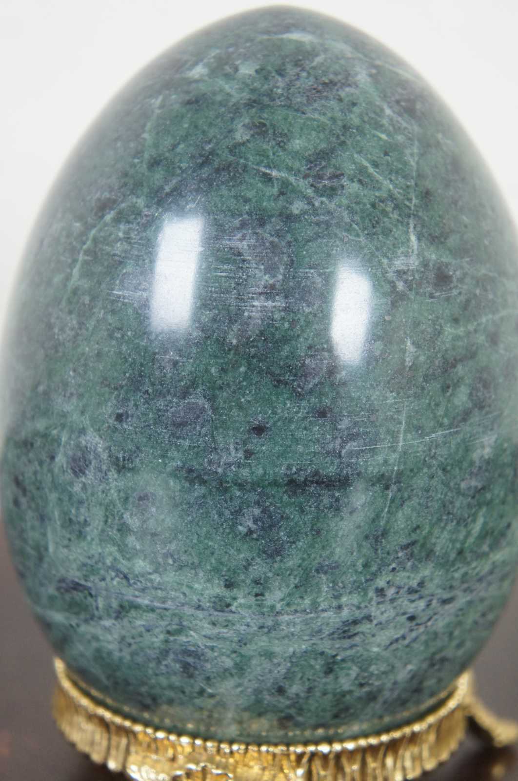 Green marble or granite polished stone egg on a gold tone metal, floral patterned stand.