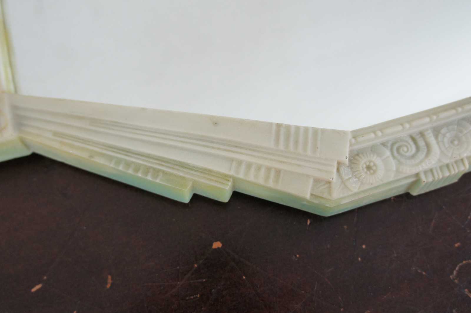 Antique white bakelite mirrored vanity tray with gold tone handles and a floral art deco style frame. Tray has hanging spot along the back allowing it to be used as a wall mirror as well.
