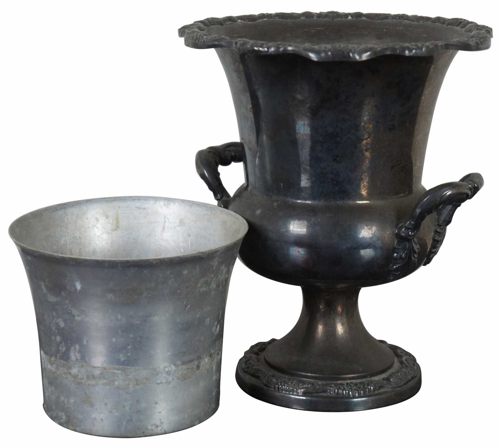 EPCA Poole silver plate footed champagne bucket in the Lancaster Rose pattern with removable tin insert for extra insulation.