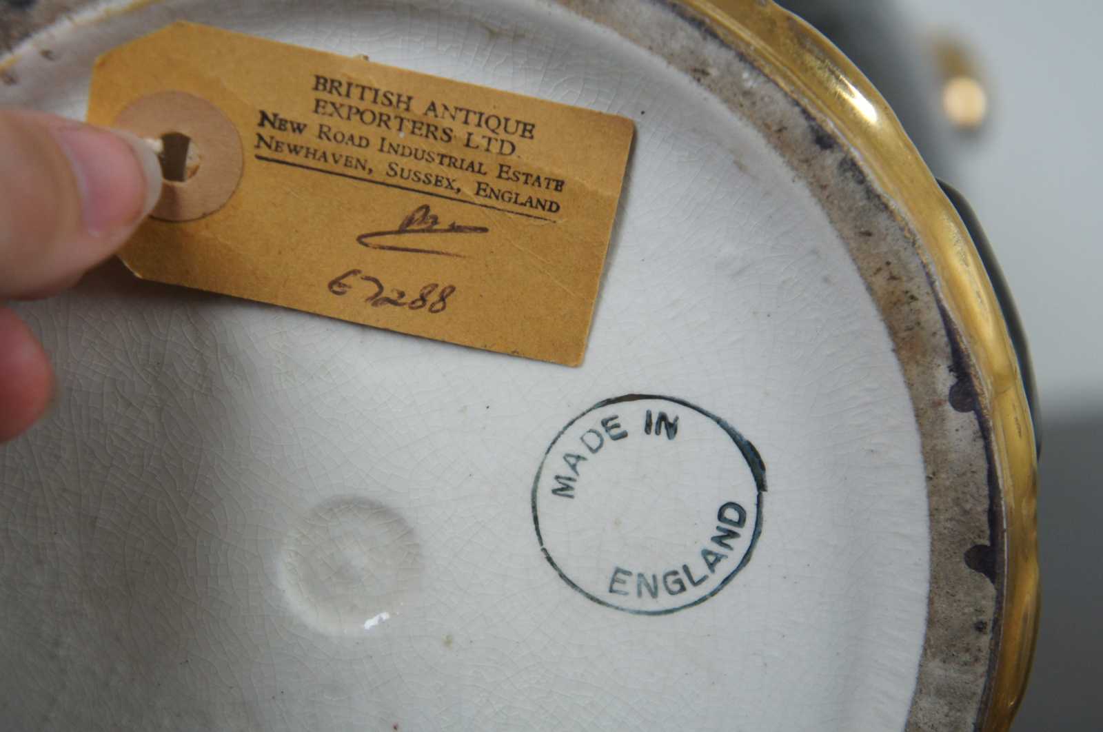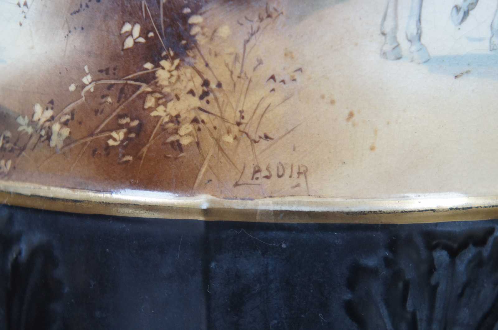 Two black porcelain mantel vases in the shape of Grecian urns with Greek key handles, acanthus leaves, gold accents and idyllic scenes of figures, signed Lesoir. Made in England.