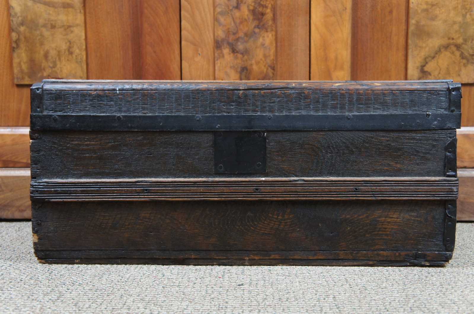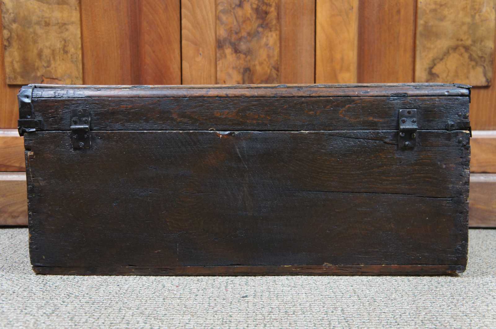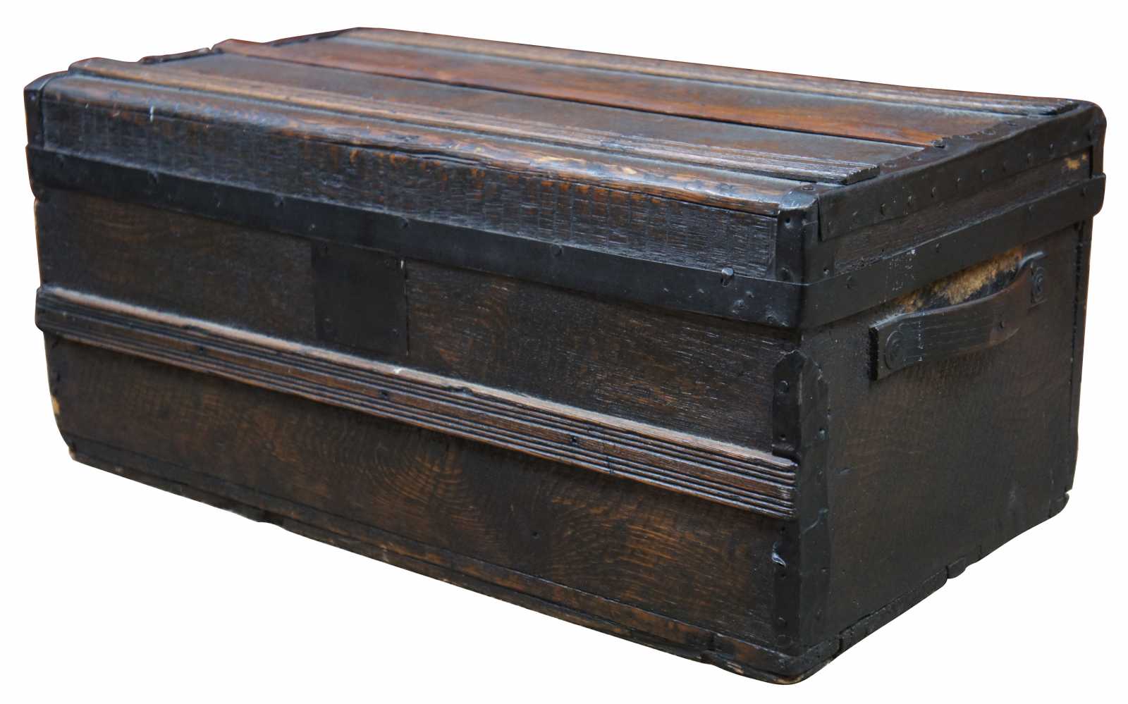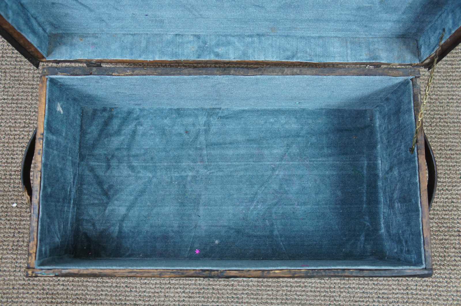 Antique wooden trunk, chest or foot locker with a flat top, wood handles on the sides, metal banding. The box does not latch and has a nice sky blue velvet lining.