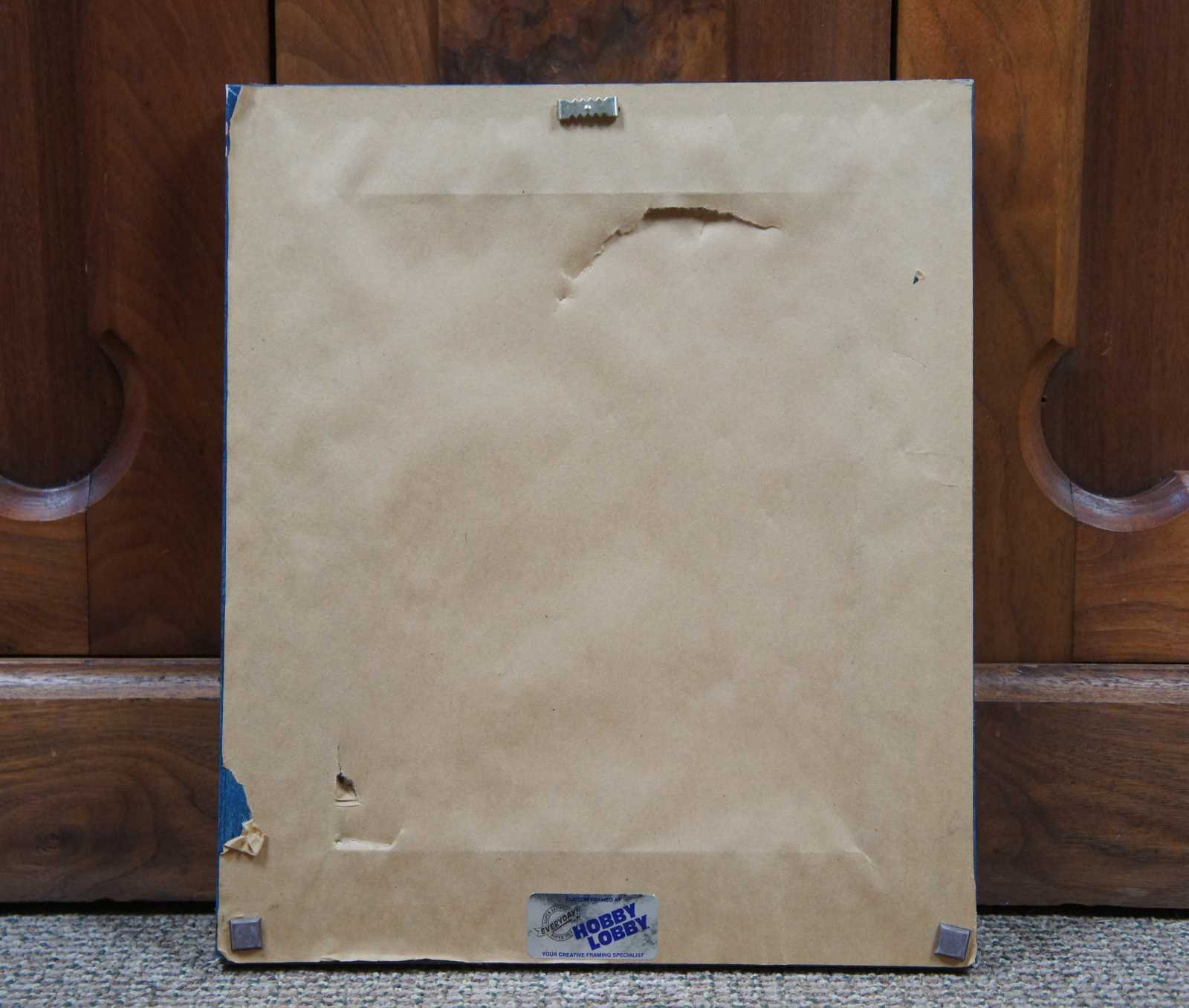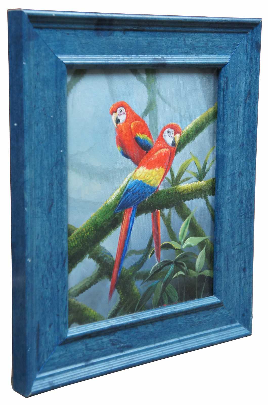 Tropical painting of two parrots on the branch of a tree in the forest. Signed lower right.